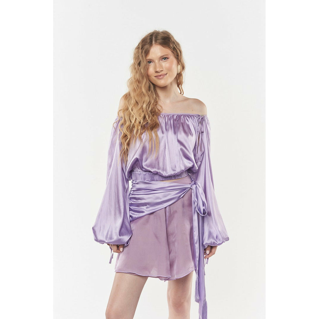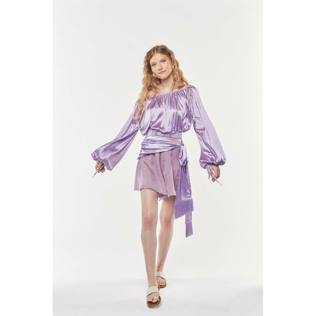Tabby de lino Tencel sostenible con revestimiento de poliéster. Este corto flujo presenta una faja de envoltura incorporada con un borde con flecos que se puede usar en un nudo o un arco.