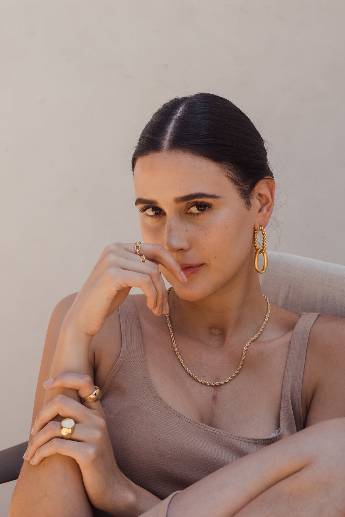 El anillo Lue es una de nuestras piezas más clásicas, ya que su forma trae consigo una larga trayectoria en el mundo de la moda. Esta pieza es completamente versátil ya que lo puedes combinar con todo tipo de prendas. Con este anillo están permitidos todos los excesos, úsalo como quieras con este diseño no hay reglas.