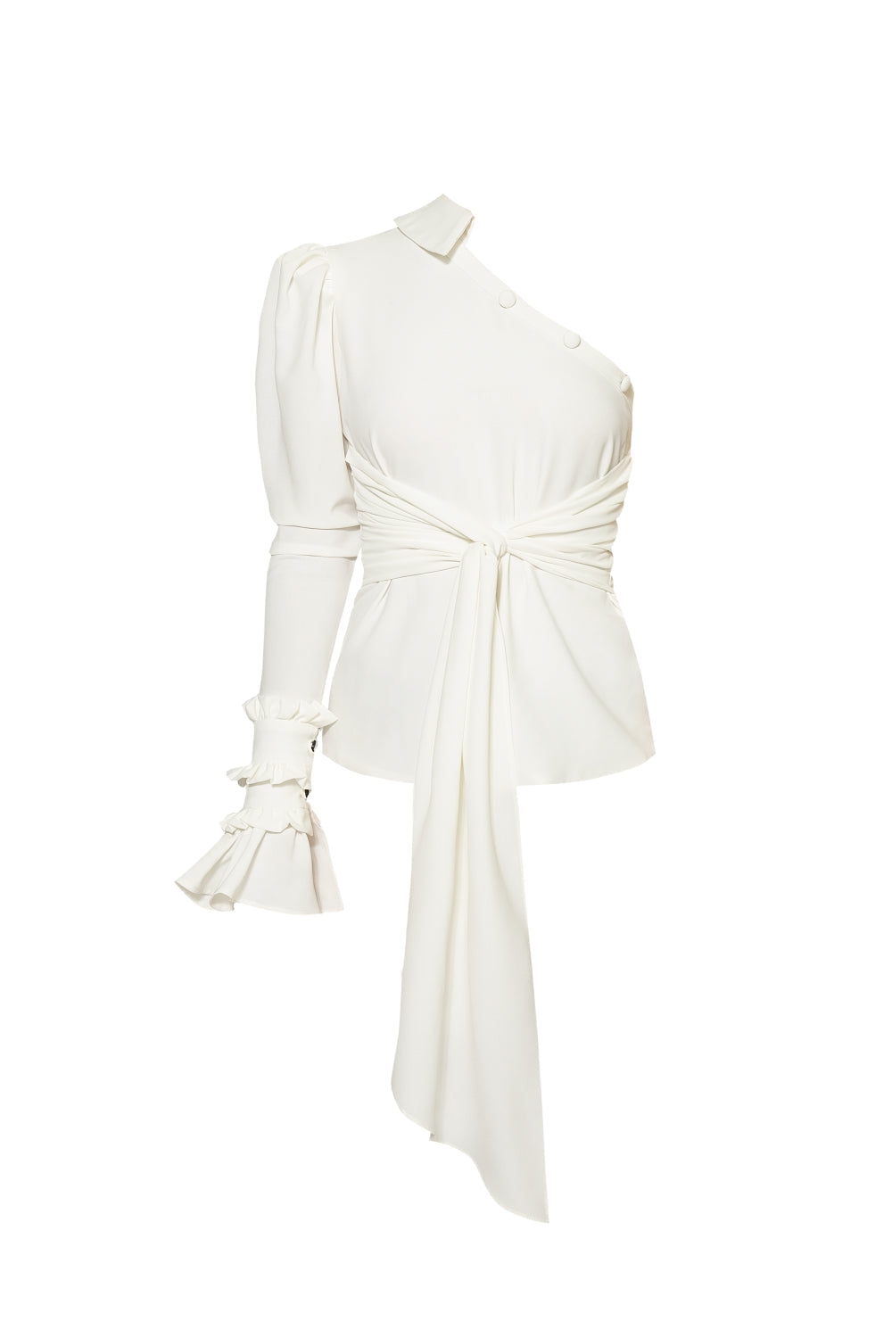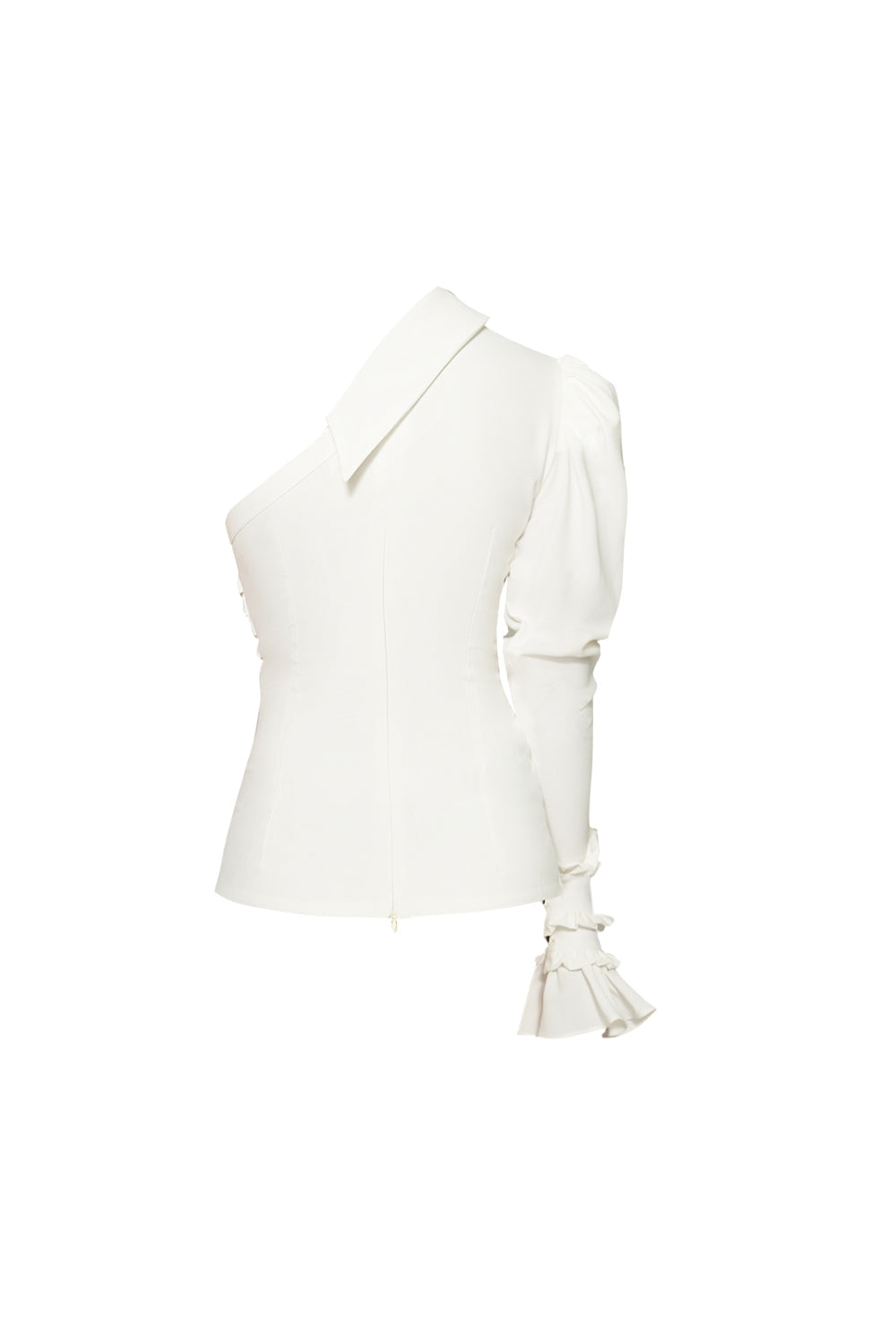 Blusa asimétrica de escote de silueta apretada con cintura desarrollada a mano en un maniquí, manga de ancho, puño con volantes y cierre invisible posterior. Base: Crepé de sarga.