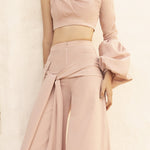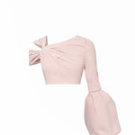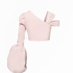 Top de escote asimétrico completamente a mano sobre maniquí, globo inferior y cierre separable en el costado.