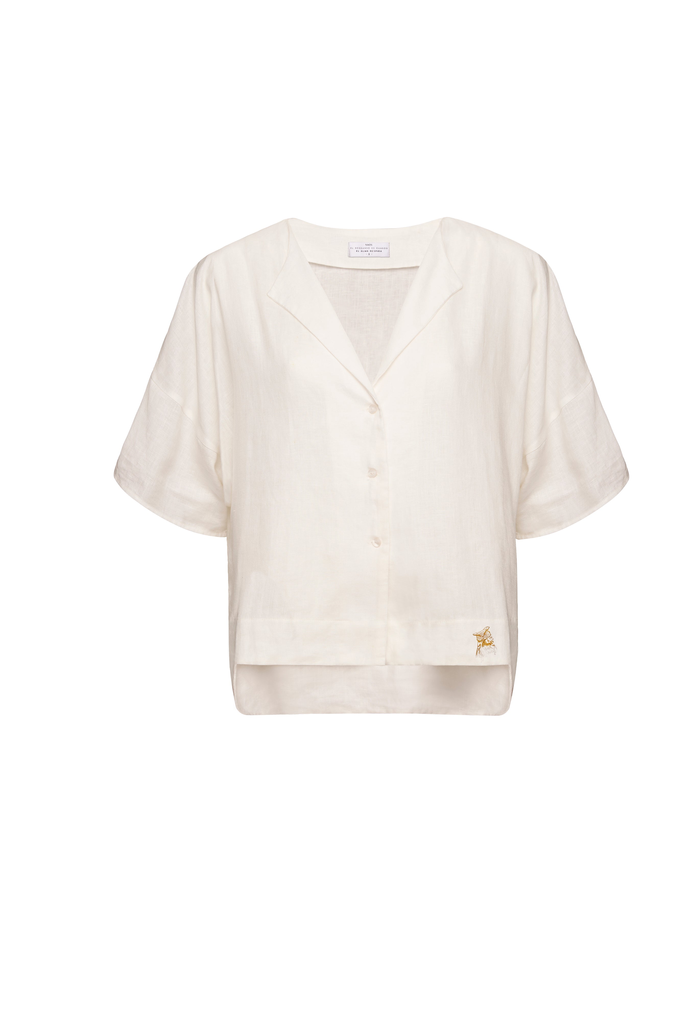 Blusa color crudo, cuello solapa recta y escote en V, manga corta (con hombros caídos) con dobladillo en mangas. Frente con botones. Largo asimétrico. Detalle bordado en costado. Pieza con pre-lavado y suavizado.