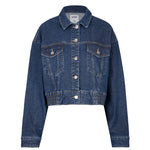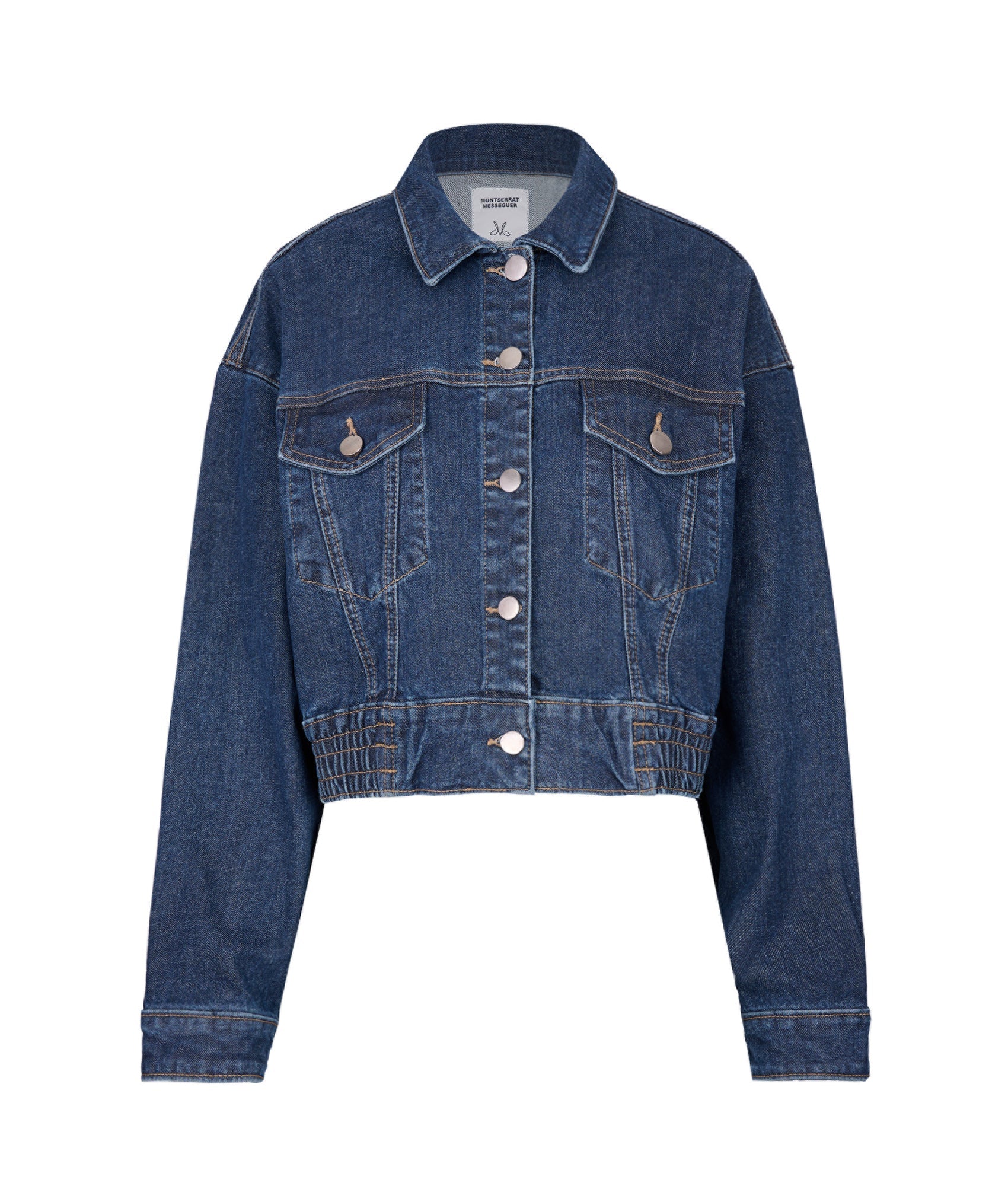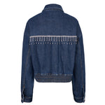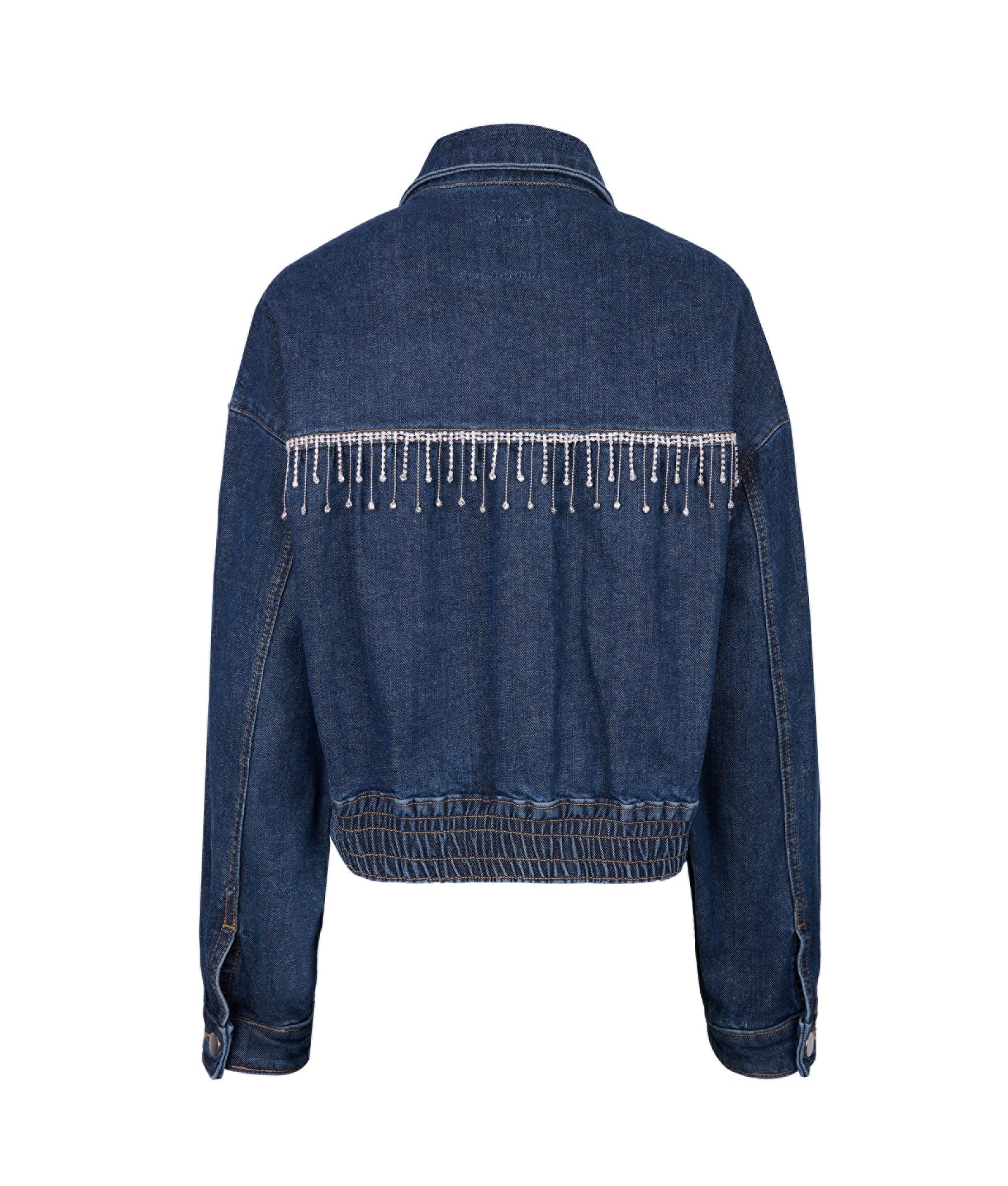 Chamarra de mezclilla azul corta con detalle sparkly en espalda.