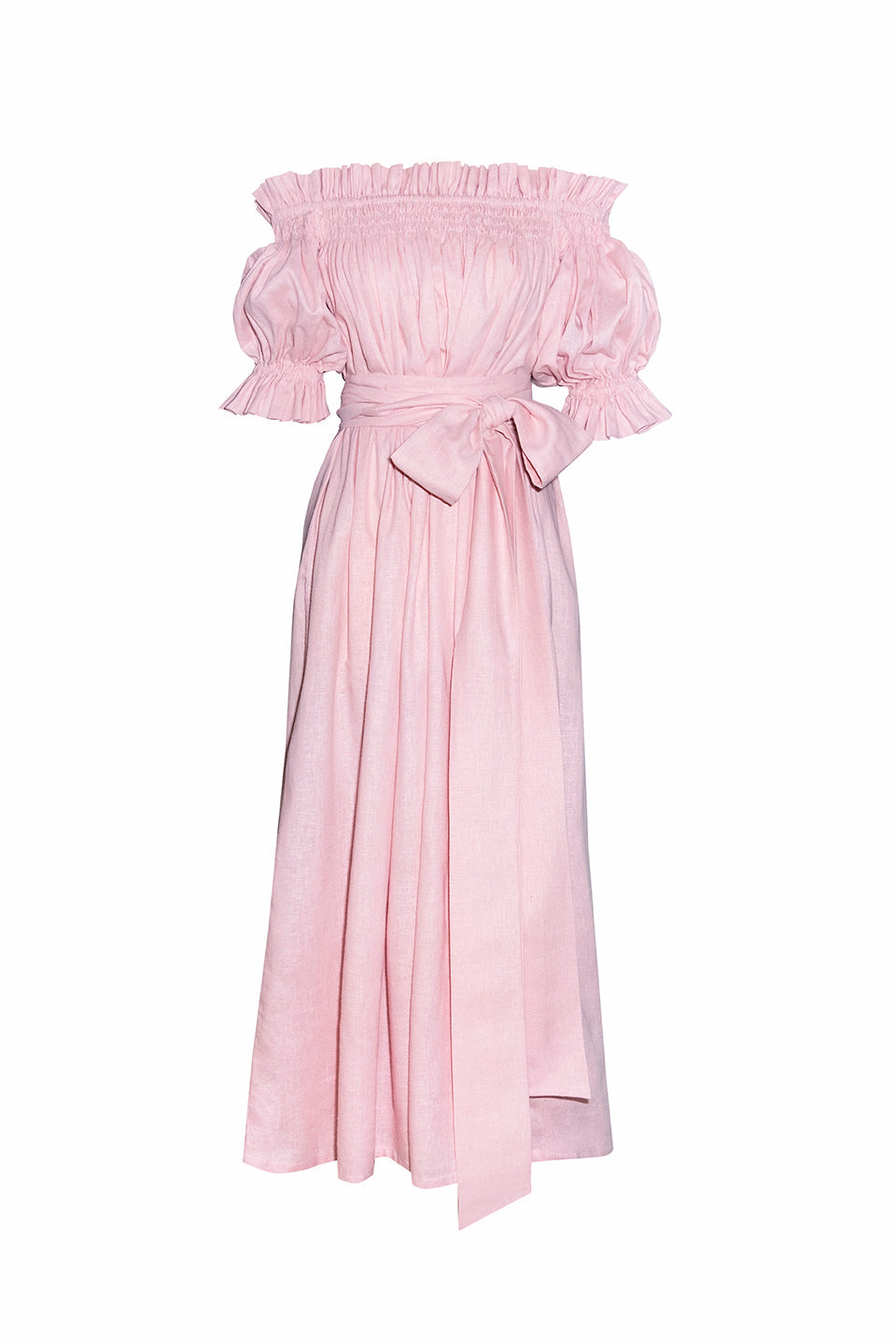 Vestido de silueta de gran tamaño, con detalles elásticos reunidos en el escote que permite el hombro, con fajón separado para poner y marcar cintura, cómodo y versátil, hecho 100% en lino.