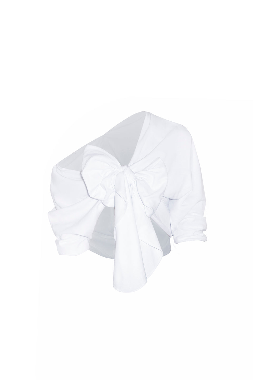 Blusa de gran tamaño, corte asimétrico con detalles de amarre en el frente, mangas anchas con puño elástico.