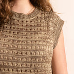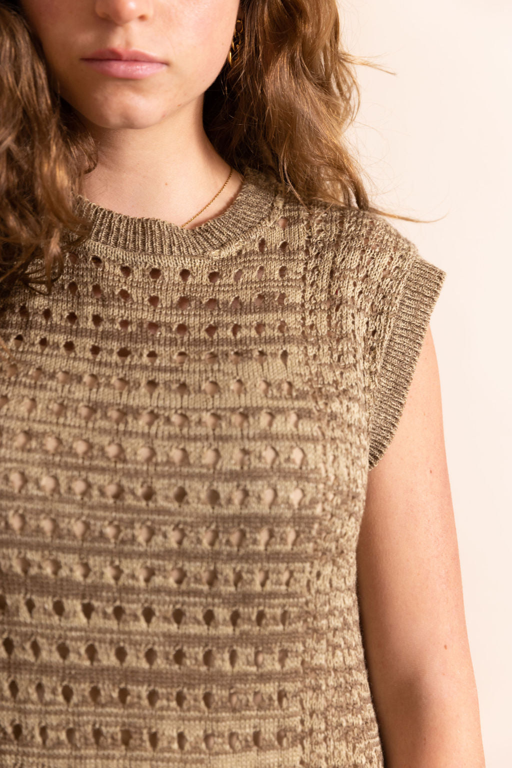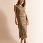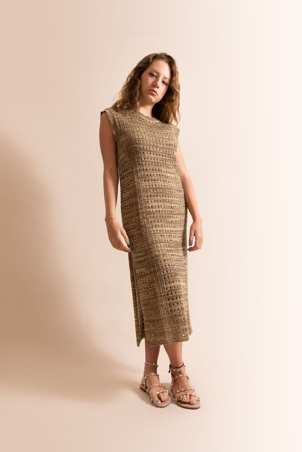 Vestido largo punto crochet color café jaspeado y cuello redondo, sin mangas, con una abertura lateral. Tiene un diseño muy elegante, resalta la figura femenina por medio del tejido.