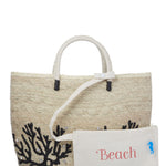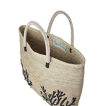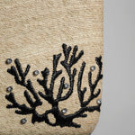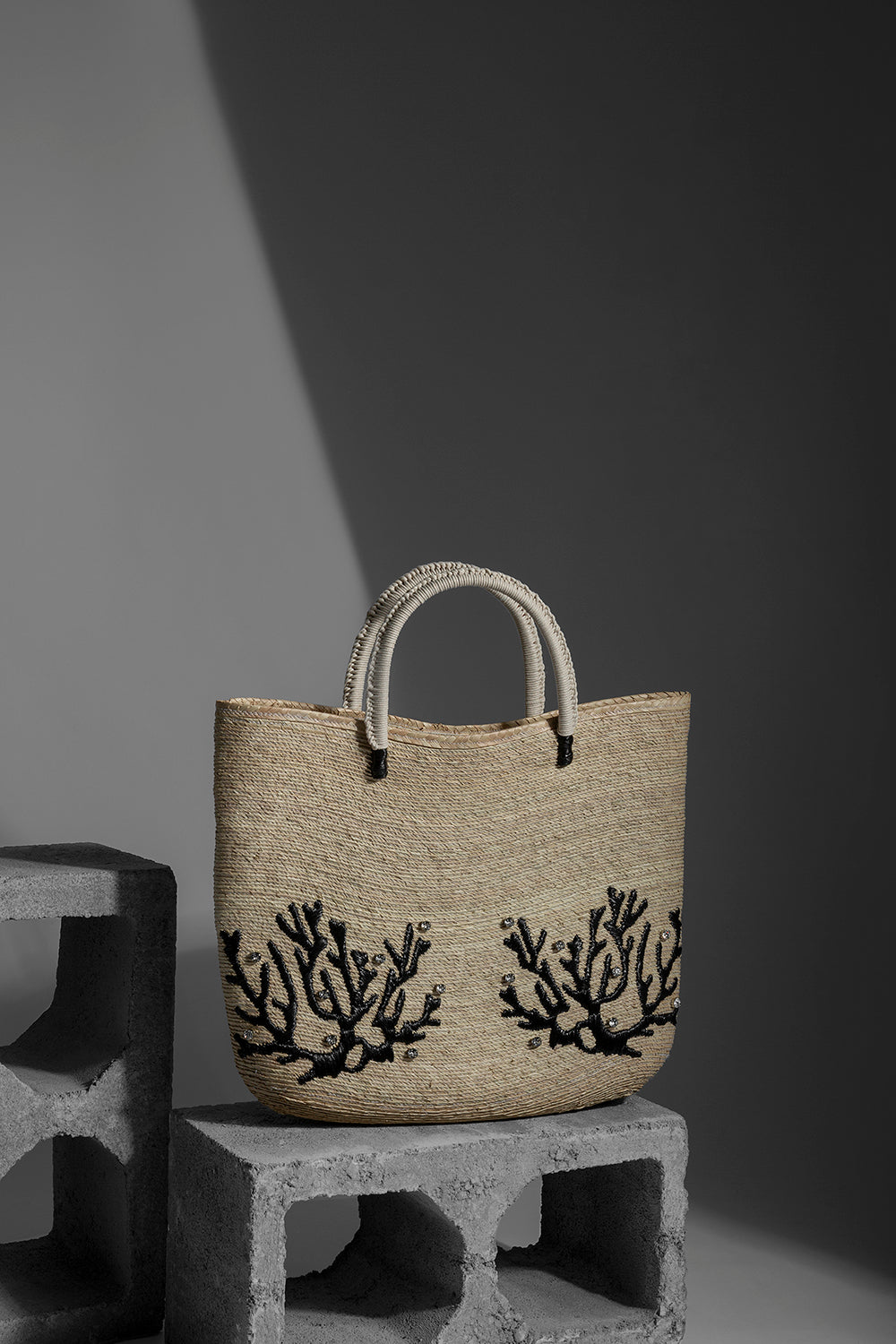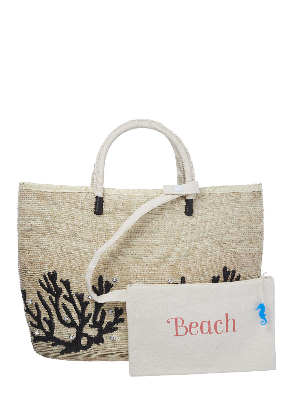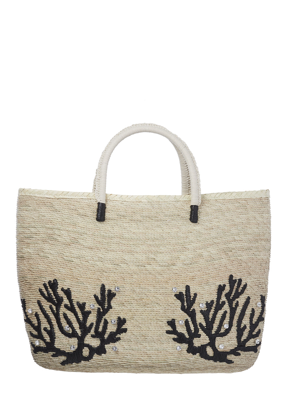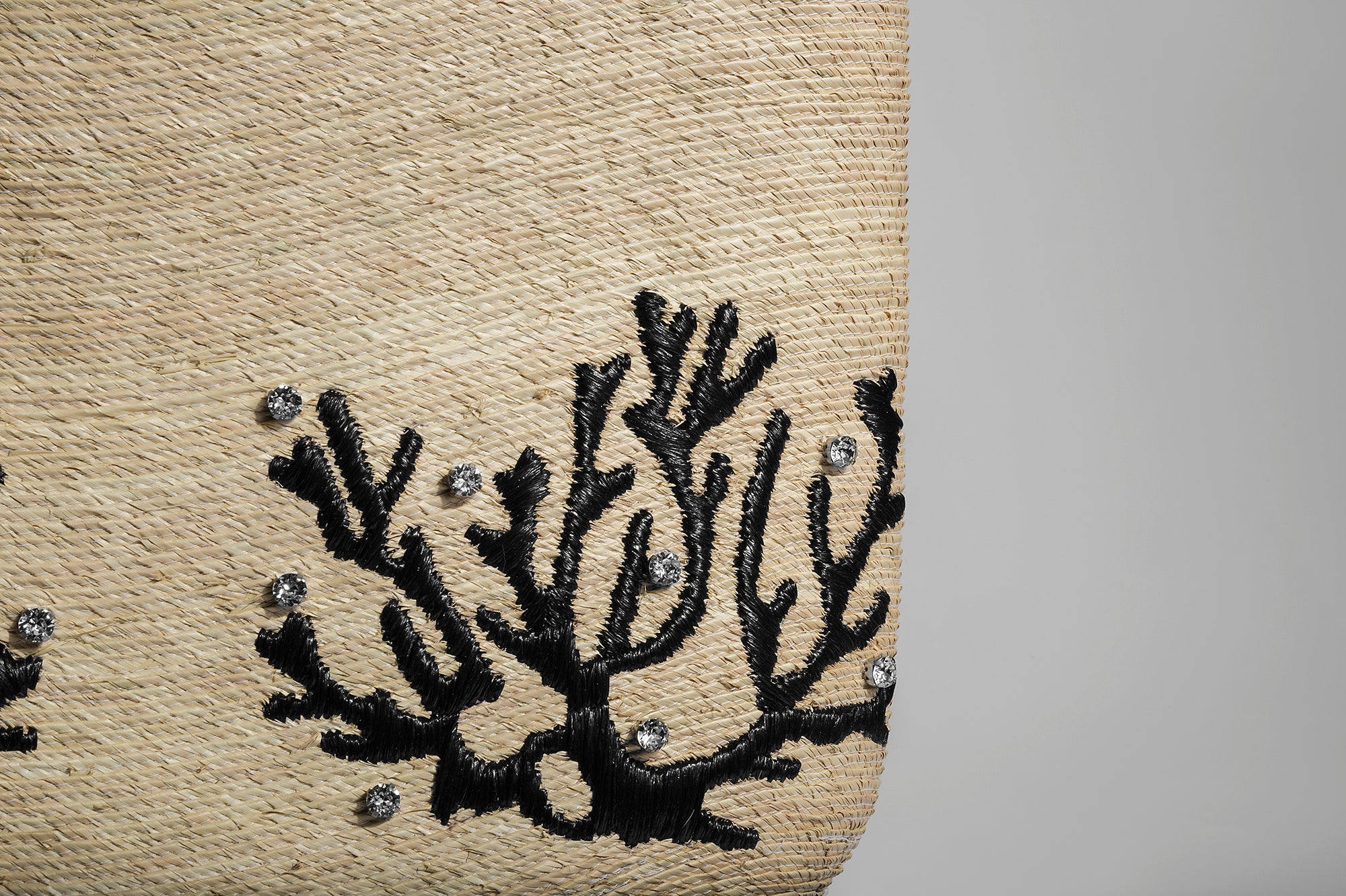 Descripción: Bolso de palma bordado con aplicaciones de Swarovski. Asas forradas con cordón y rafia. Bolsa y funda incluidas. Los colores y tallas pueden variar