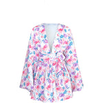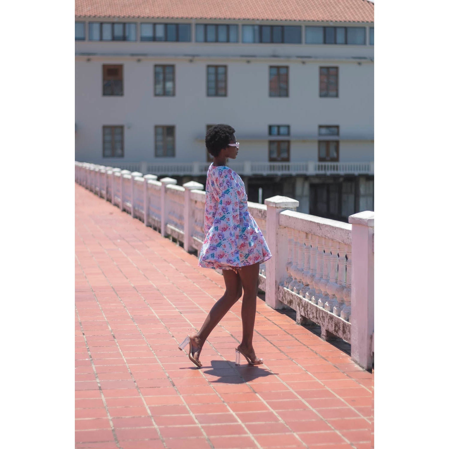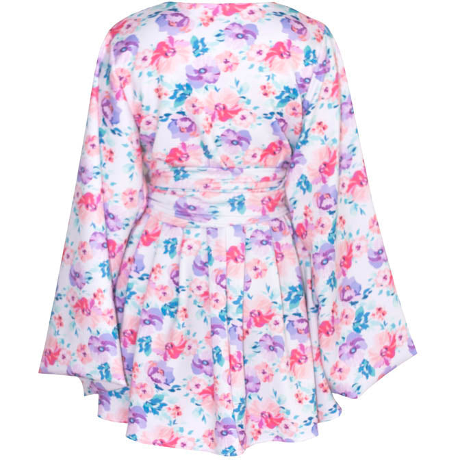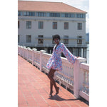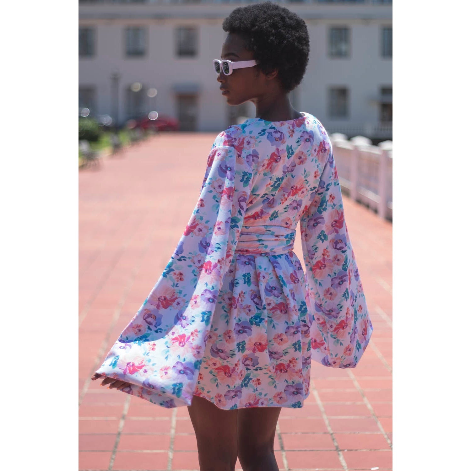Vestido de envoltura silueta corta A, mangas grandes y cinturón. Impresión exclusiva, inspirada por transmitir alegría, libertad, esperanza a través de sus colores.