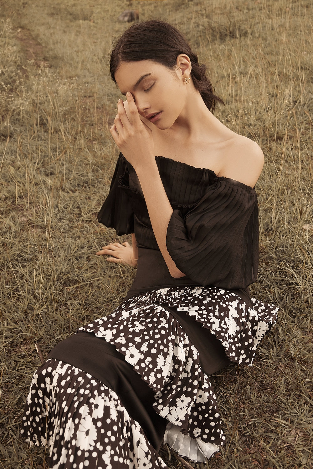 Silhouette Midi Skirt Pencil, cintura con volantes plisados creados a mano y un cierre invisible posterior.