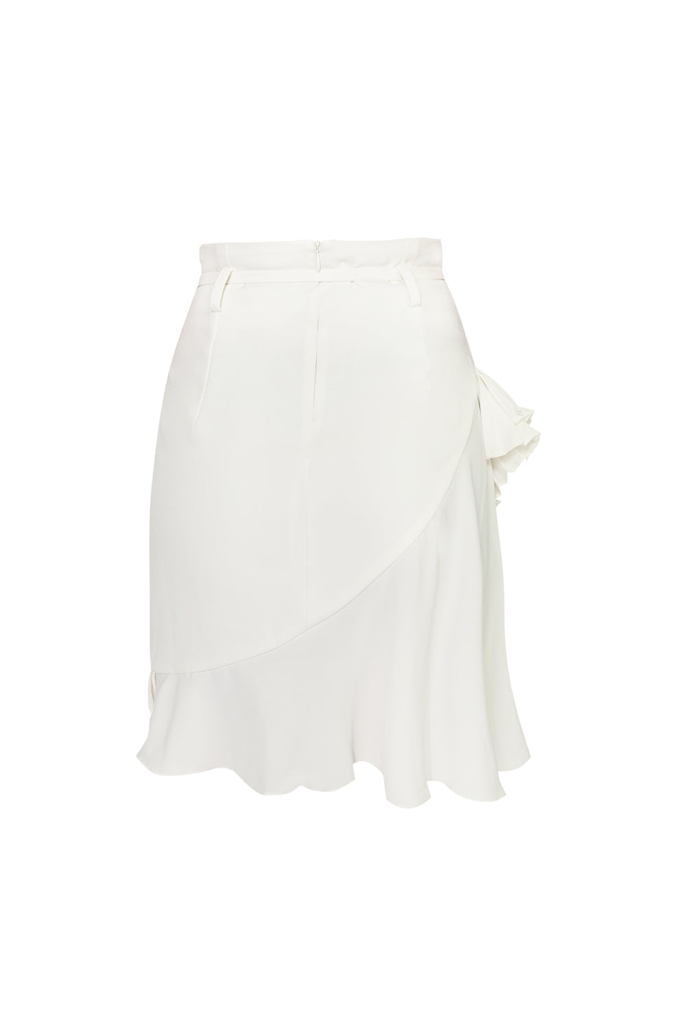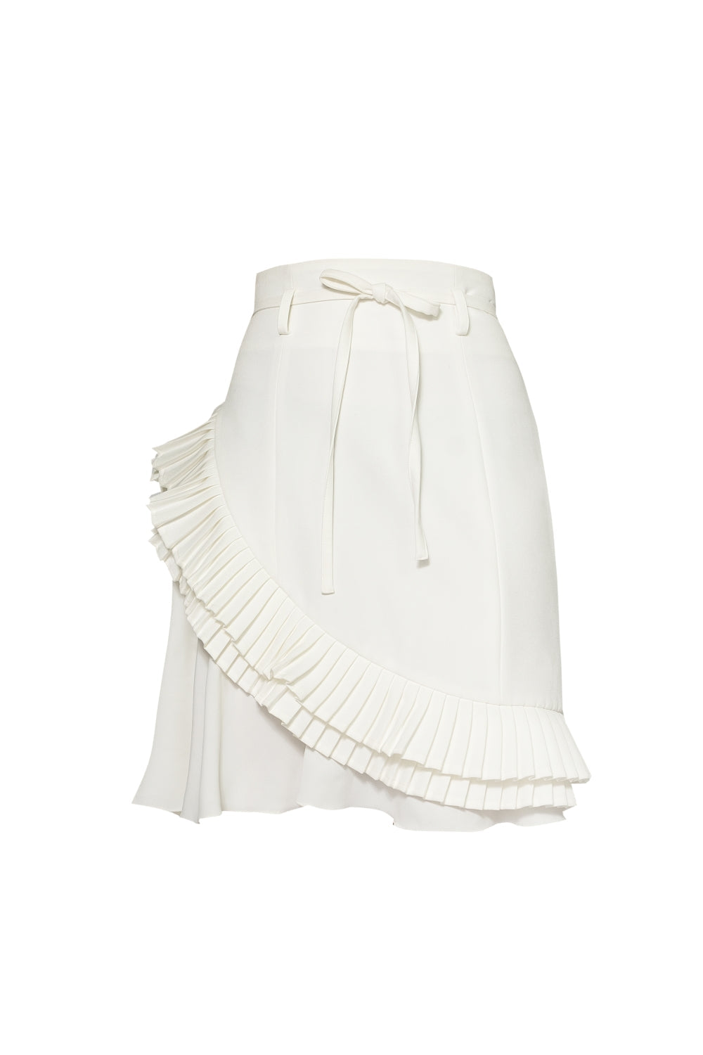 Corre de costillas con tiras plisadas en corte curvo, volante inferior y cierre invisible posterior.