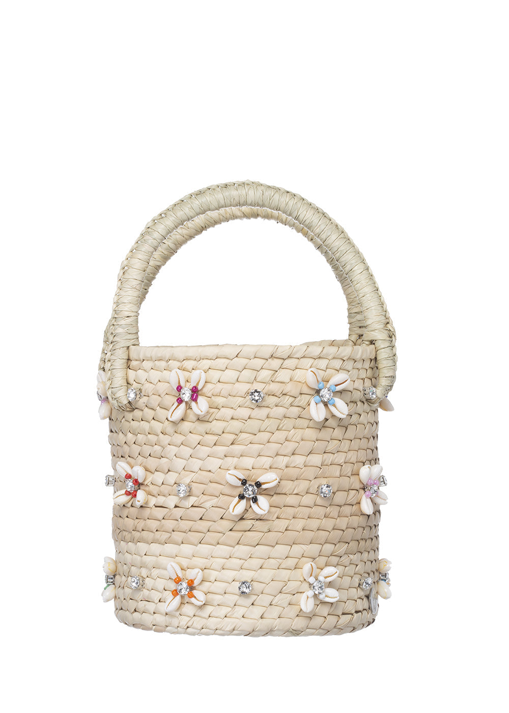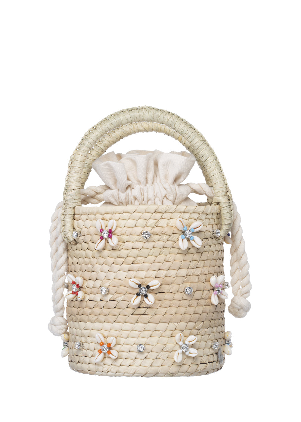 Materiales: 100% palma, abalorios de Swarovski y Seashells. Forro 100 % algodón