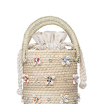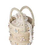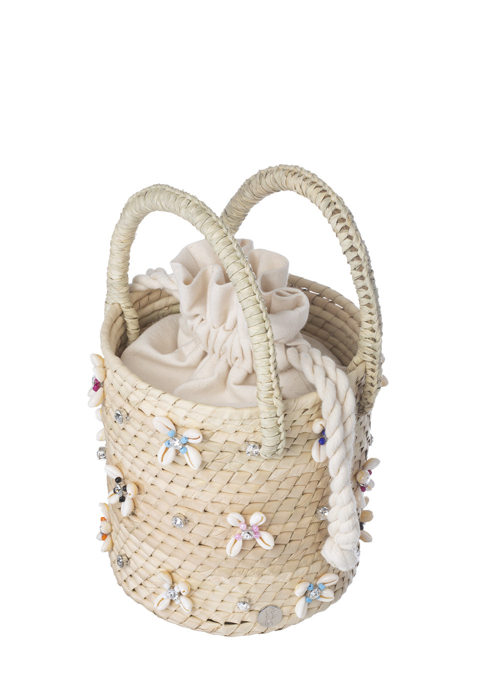 Descripción: Bolso tipo bombonera de palma con aplicaciones de conchas y cristales . Forro y funda incluidos. Los colores y tamaños pueden variar.