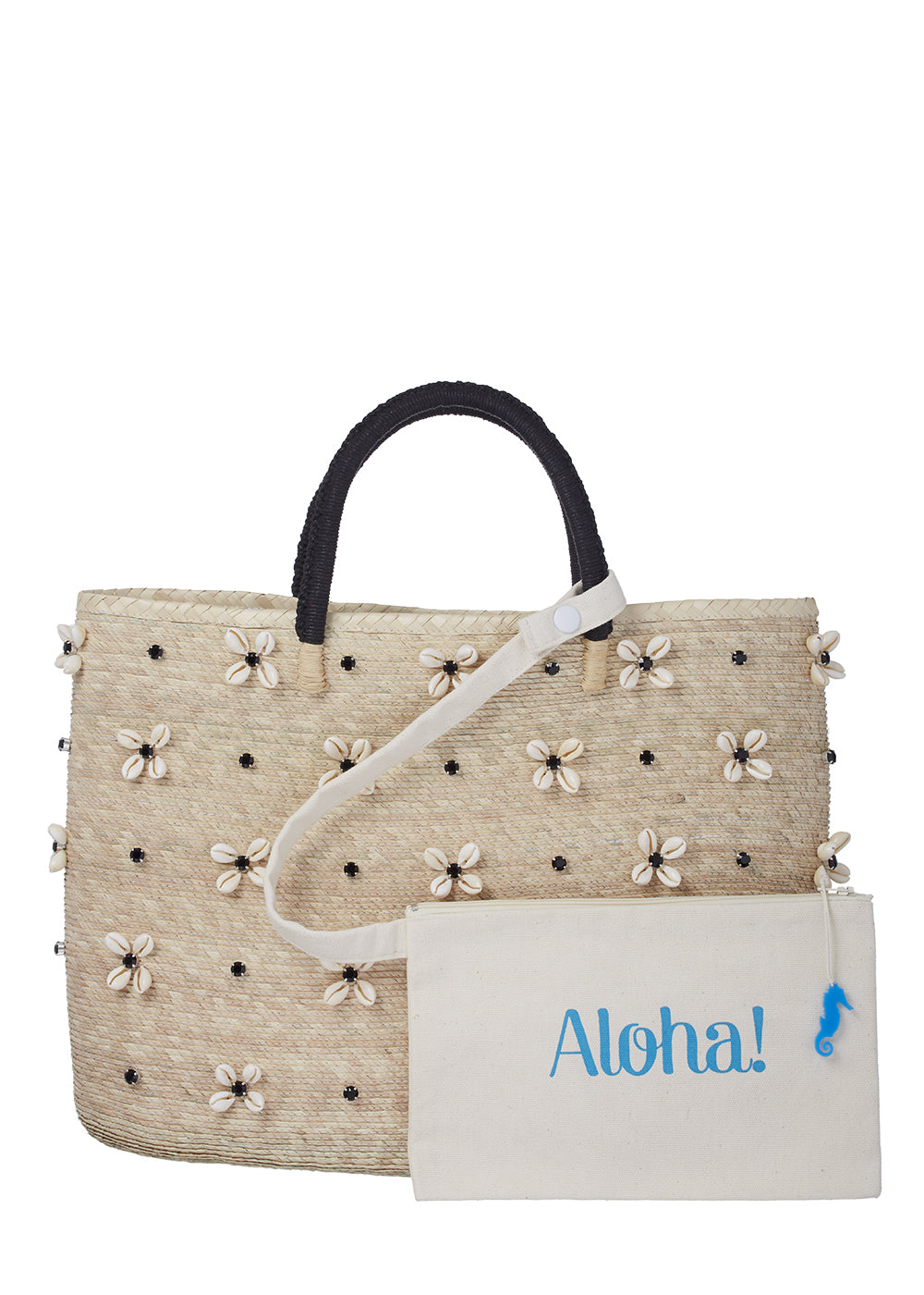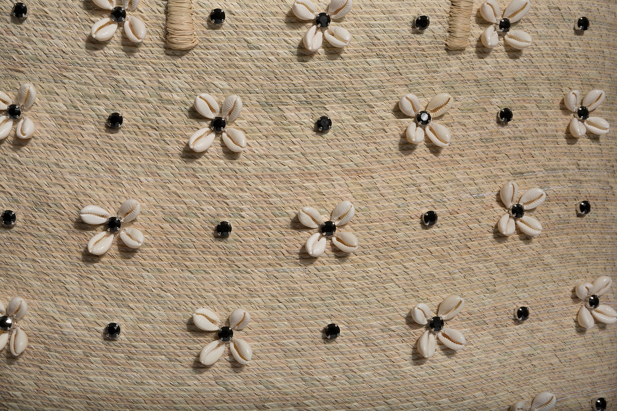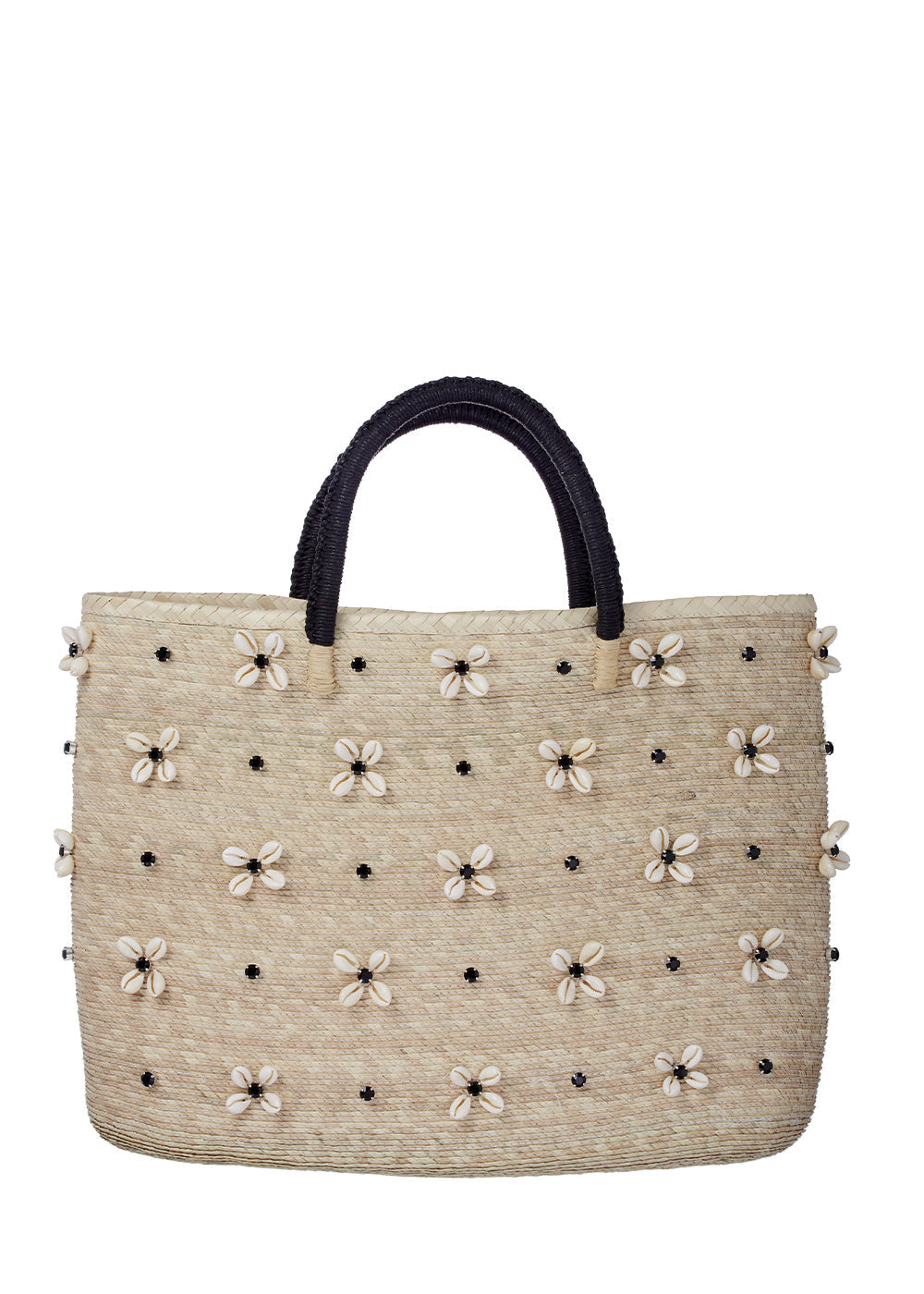 Descripción: Bolso de palma con conchas y aplicaciones de Swarovski. Bolsa y funda incluidas. Los colores y tamaños pueden variar.