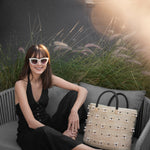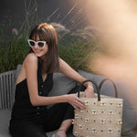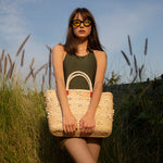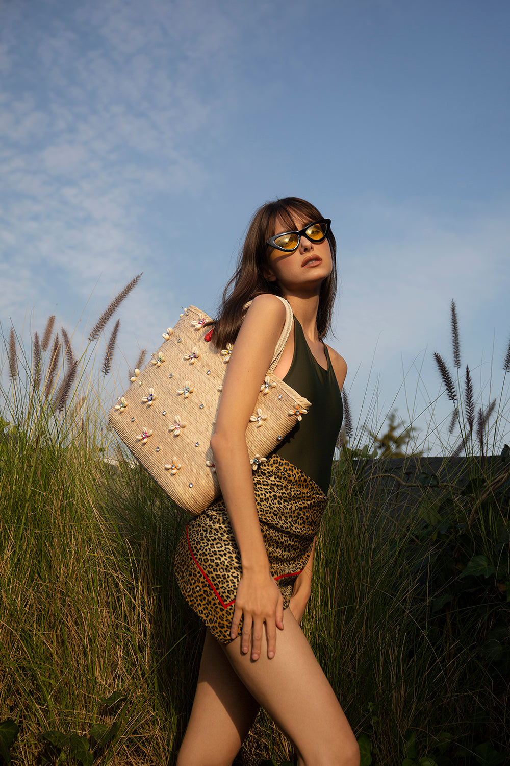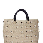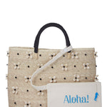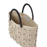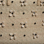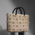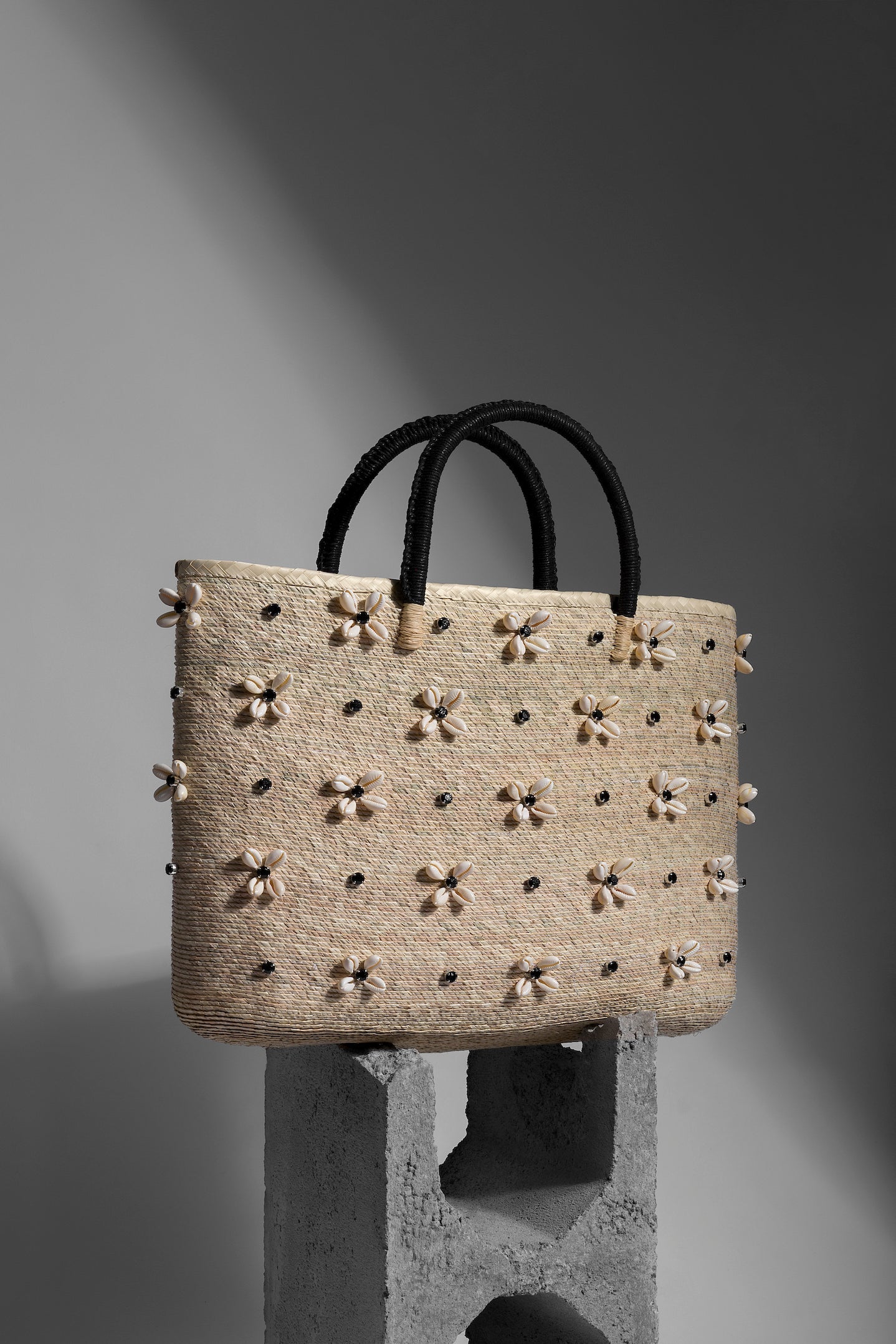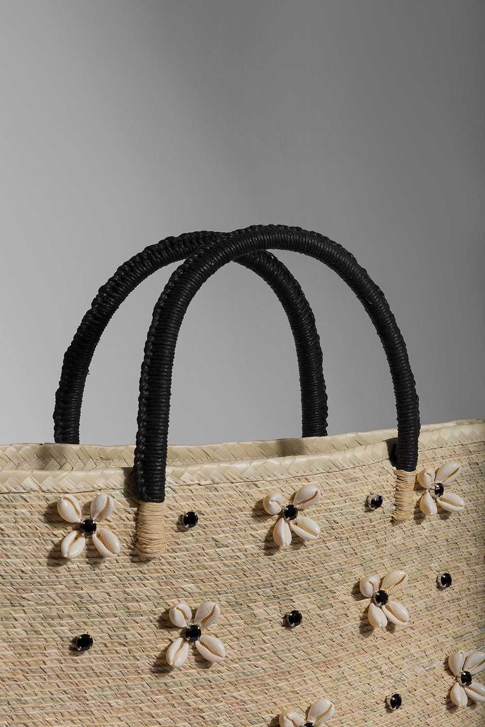 Descripción: Bolso de palma con conchas y aplicaciones de Swarovski. Bolsa y funda incluidas. Los colores y tamaños pueden variar.