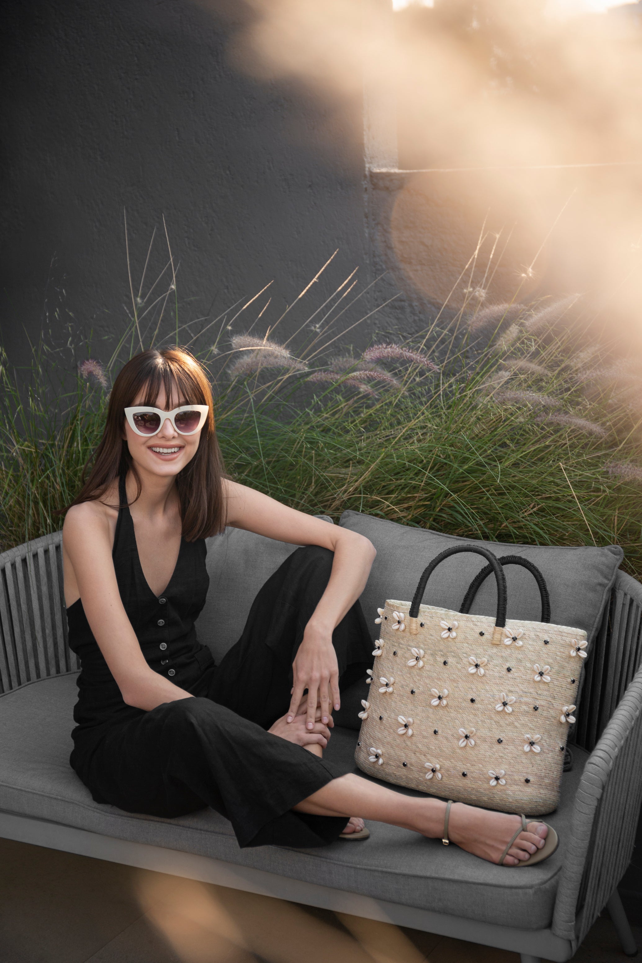 Materiales: 100% palma, cuentas de Swarovski y Conchas, Cordón encerado, Rafia 100% Natural.