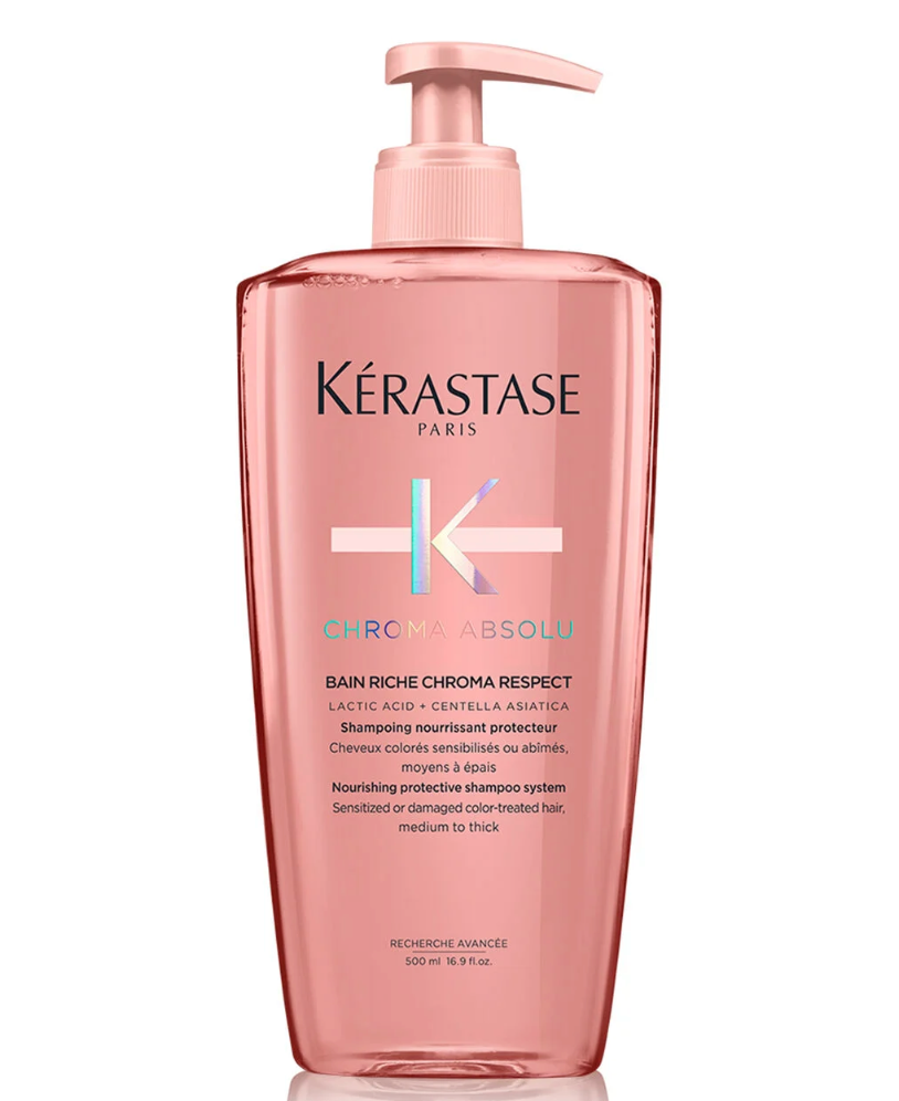El shampoo nutritivo Kerastase Chroma Absolu Bain Chroma Riche en formato profesional de 500ml está especialmente formulado para cabellos teñidos secos y sensibilizados. Su fórmula enriquecida con ácido láctico y centella asiática limpia suavemente mientras nutre profundamente la fibra capilar. Este shampoo preserva la intensidad del color, aporta hidratación y deja el cabello suave y brillante. Formato económico ideal para cabellos que necesitan nutrición extra y protección del color.