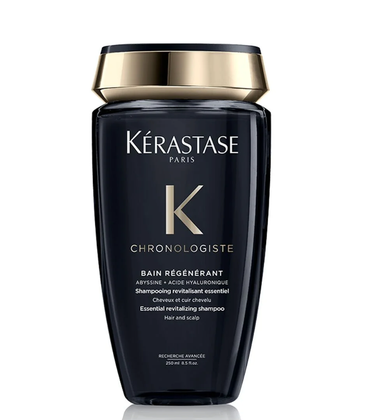 El shampoo revitalizante Kerastase Chronologiste Bain Regenerant 250ml es un tratamiento anti-edad para el cabello que combate los signos del envejecimiento capilar. Su fórmula enriquecida con vitaminas A y E, té negro y aceites preciosos regenera la fibra capilar desde el interior. Este shampoo de lujo limpia suavemente mientras aporta nutrición, brillo y suavidad excepcional. Ideal para cabellos maduros que buscan recuperar su vitalidad y juventud natural.