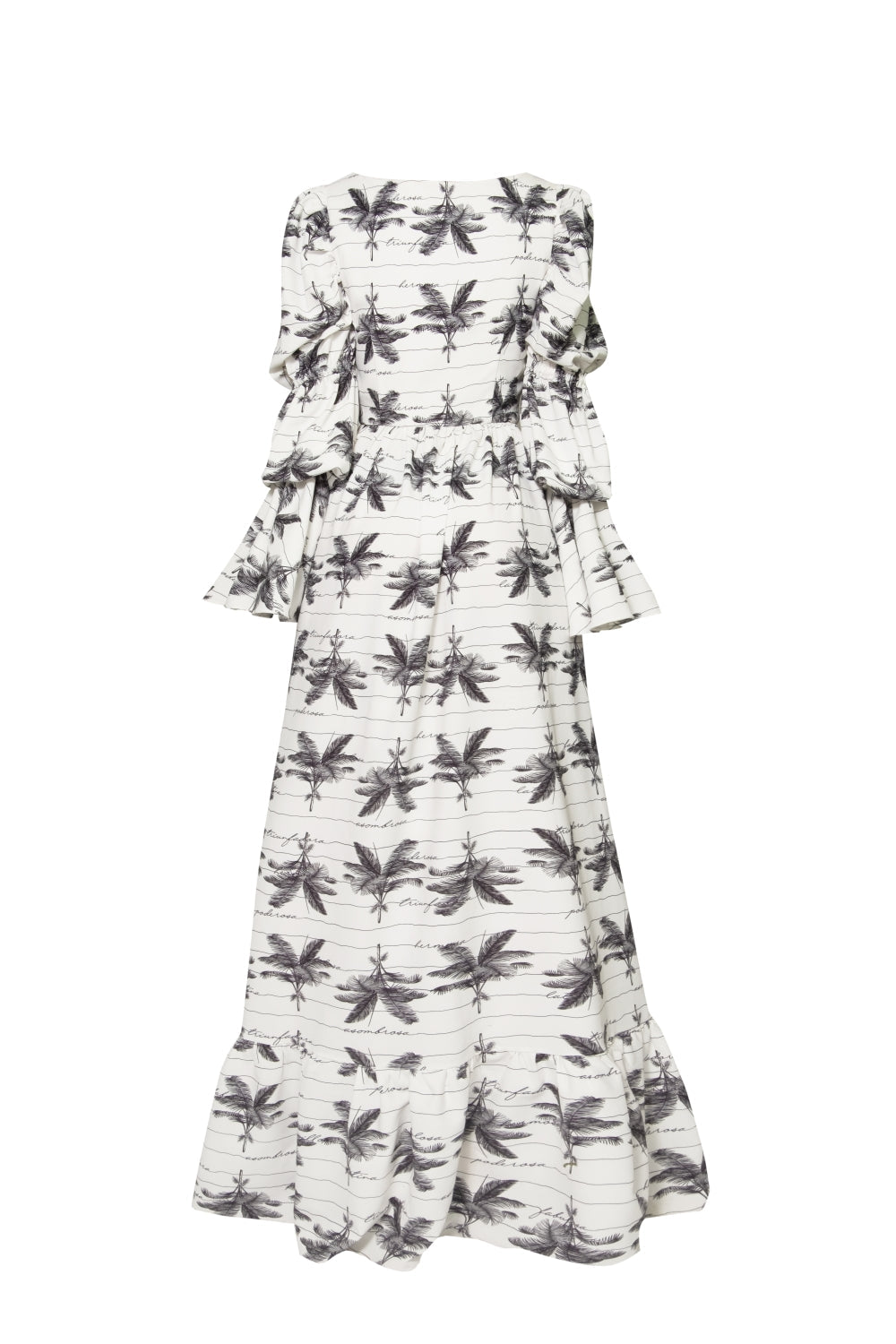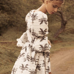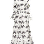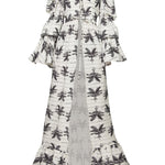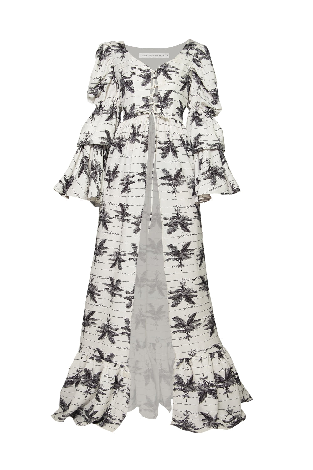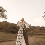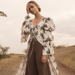 Maxi Kimono V Gunning en la cintura con manga doble con globo, mecanismo de amarre en el centro para el ajuste en el busto y el volante de salida de baja.