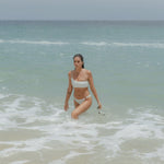 Nuestro tejido utiliza ECONYL®, un tejido italiano innovador que apoya la eliminación de desechos marinos de nuestros océanos. Está hecho de desechos anteriores y posteriores al consumo, como redes de pesca fantasmas, plásticos oceánicos y restos de nailon. Luego, este hilo se enhebra para crear la tela lujosa, suave y duradera que usamos para hacer nuestros trajes de baño.