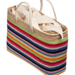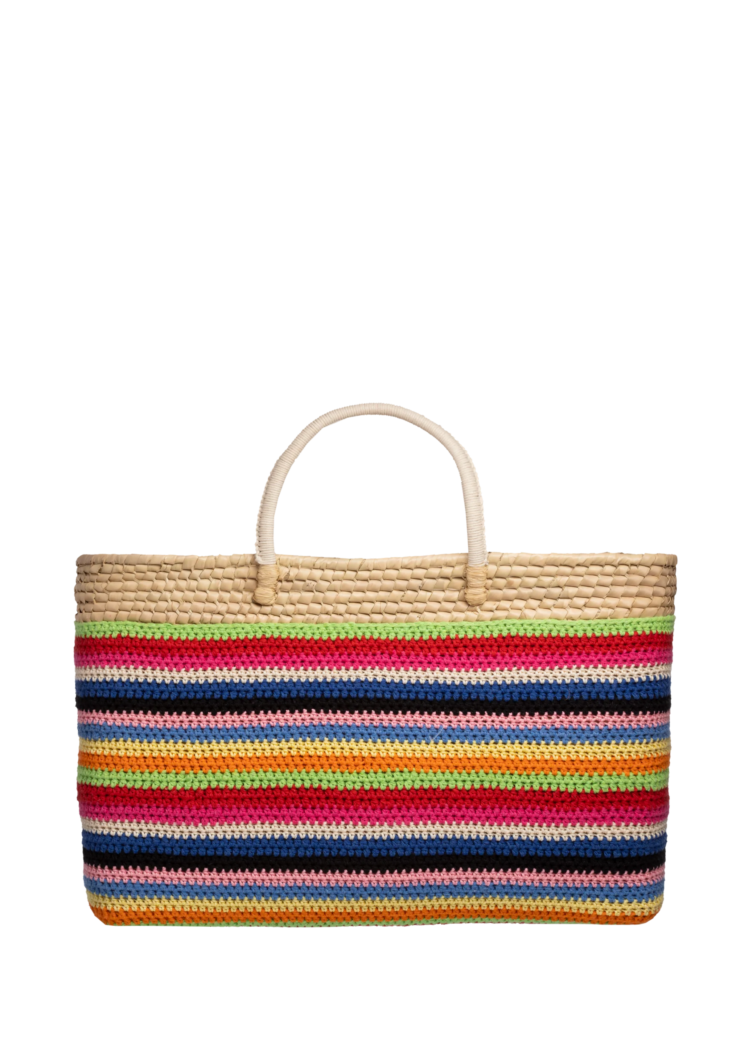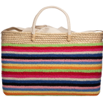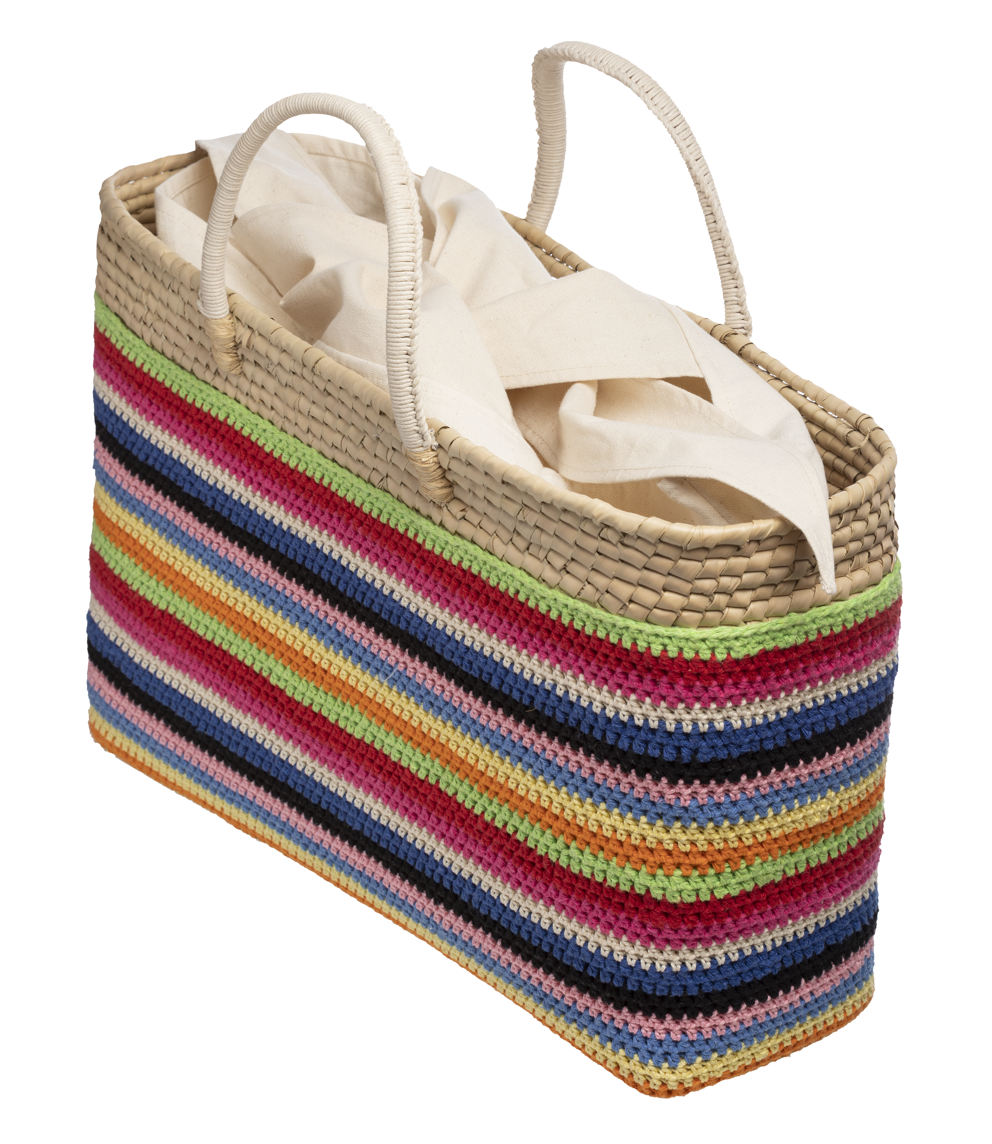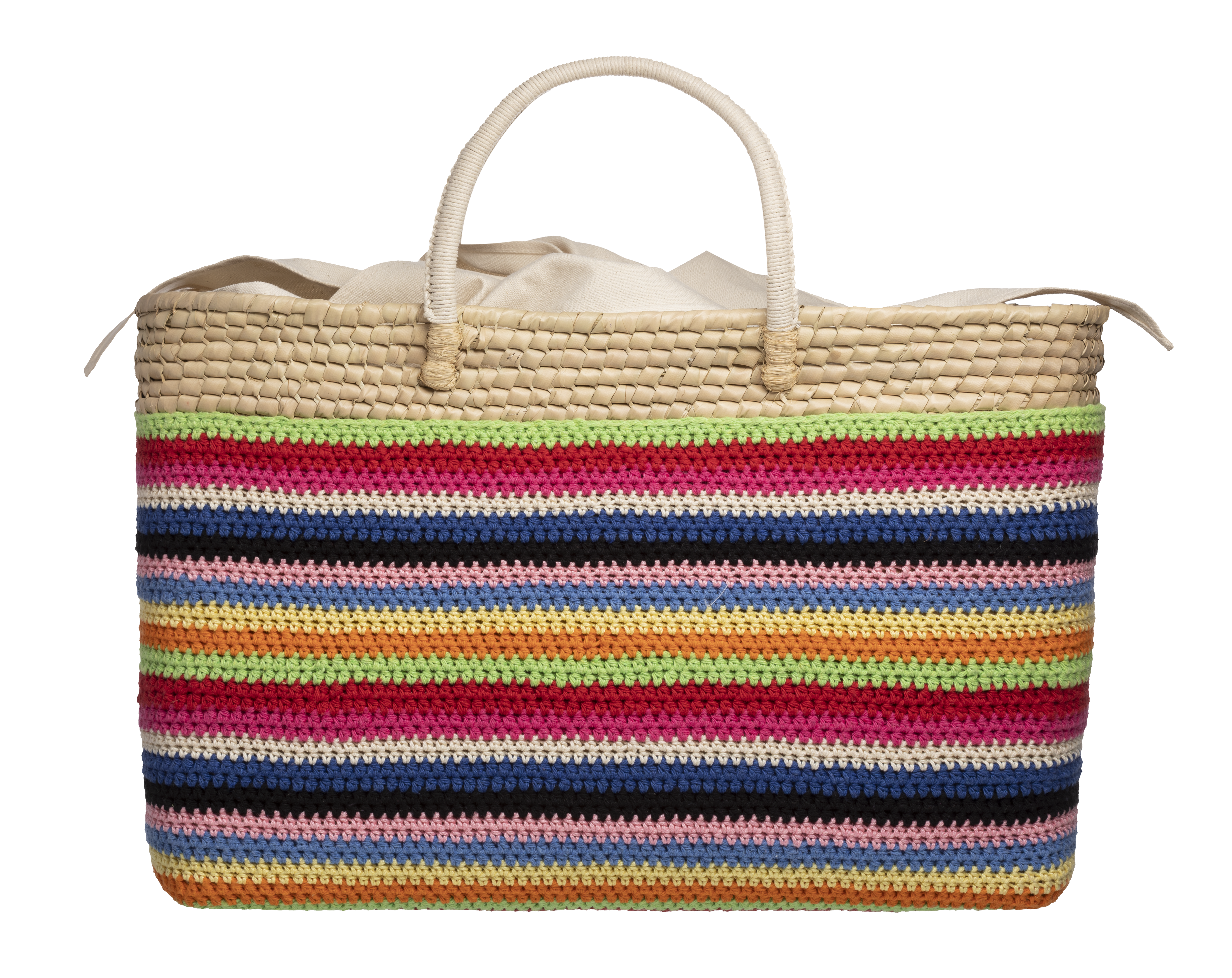 Descripción:Bolsa de palma forrada con tela de crochet. Asas forradas con cordón y rafia. Forro y funda incluidos. Los colores y tamaños pueden variar