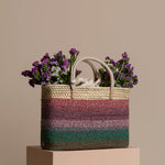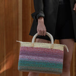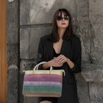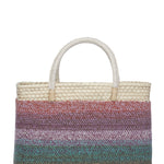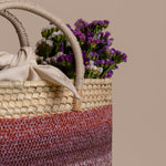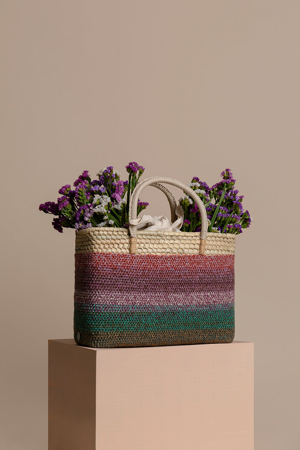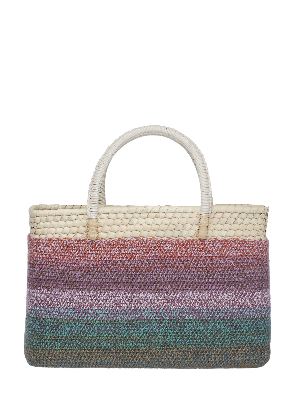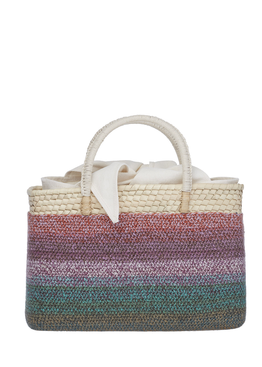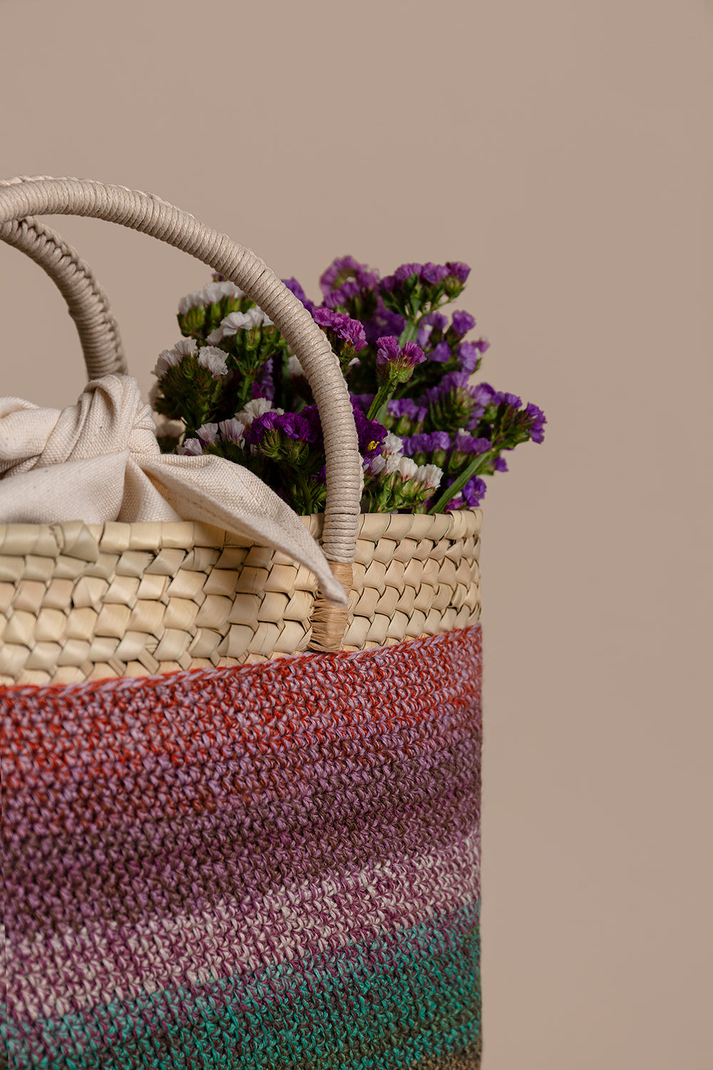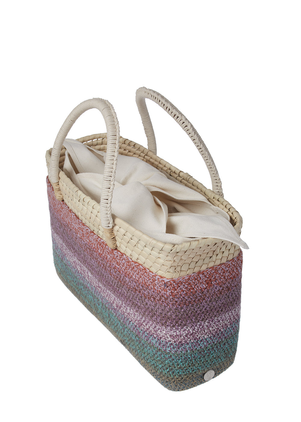 Descripción: Bolso de palma forrado con tela de crochet. Asas forradas con cordón y rafia. Forro y funda incluidos. Los colores y tamaños pueden variar.