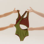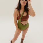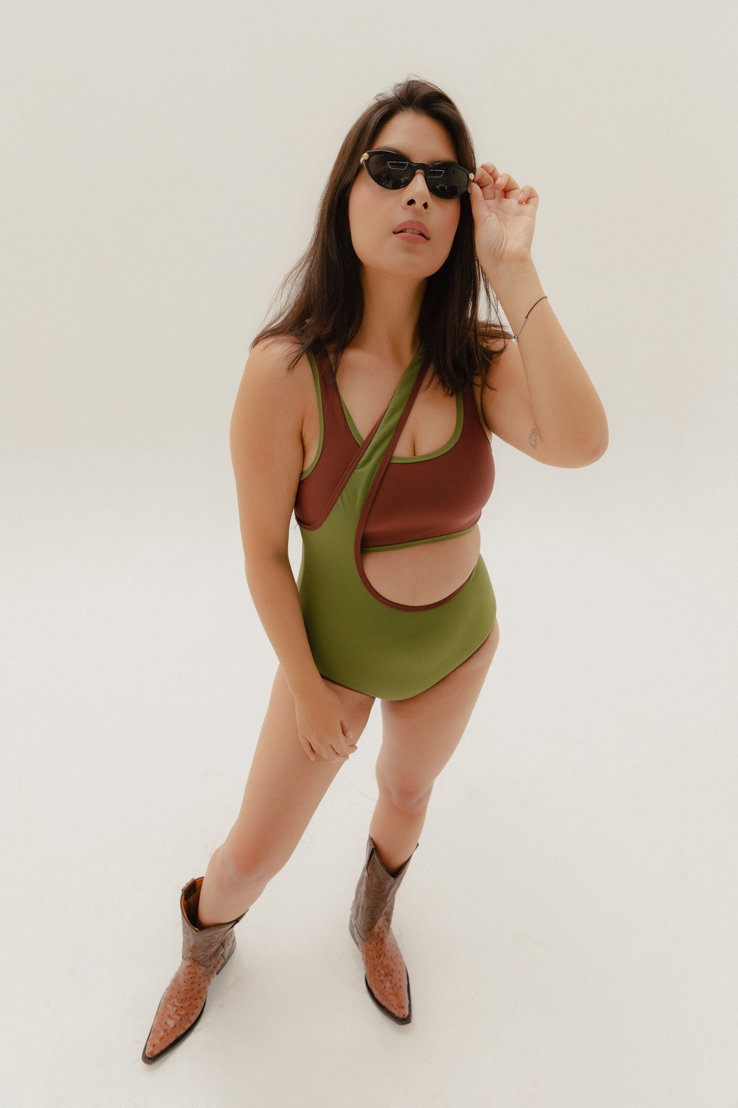 Traje de baño de 2 piezas con una correa sobre el hombro.