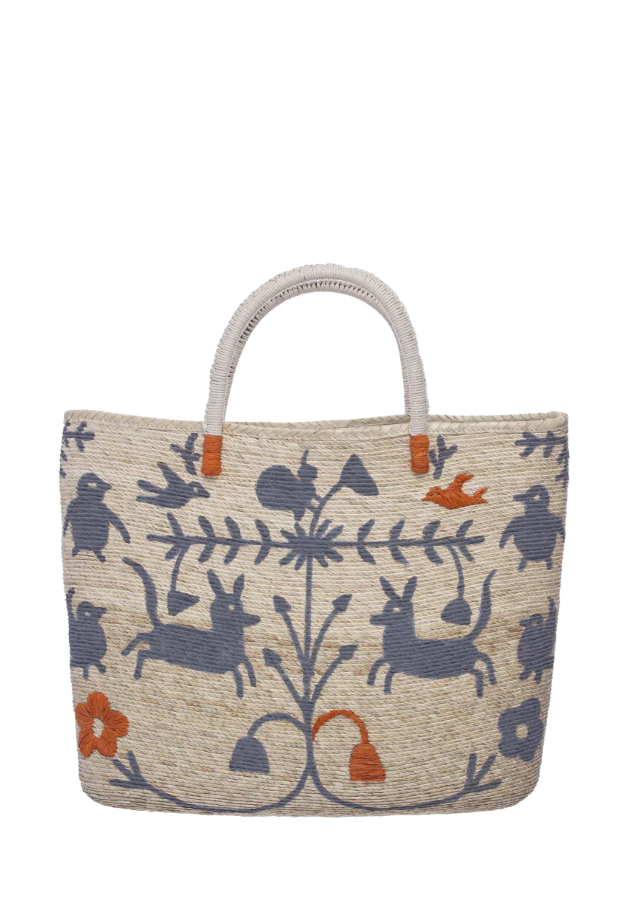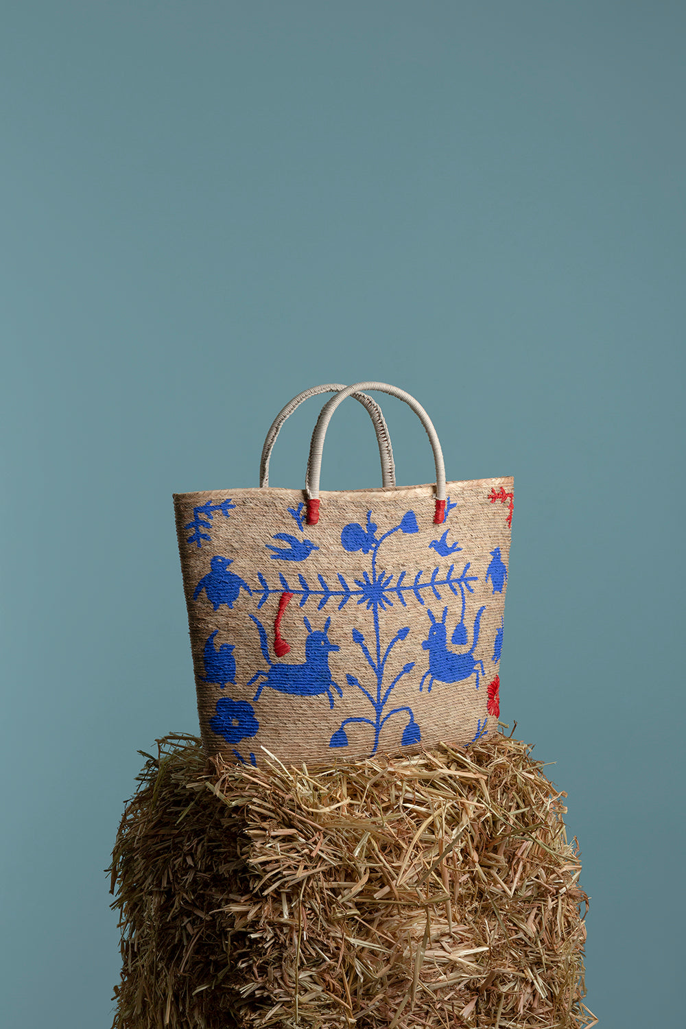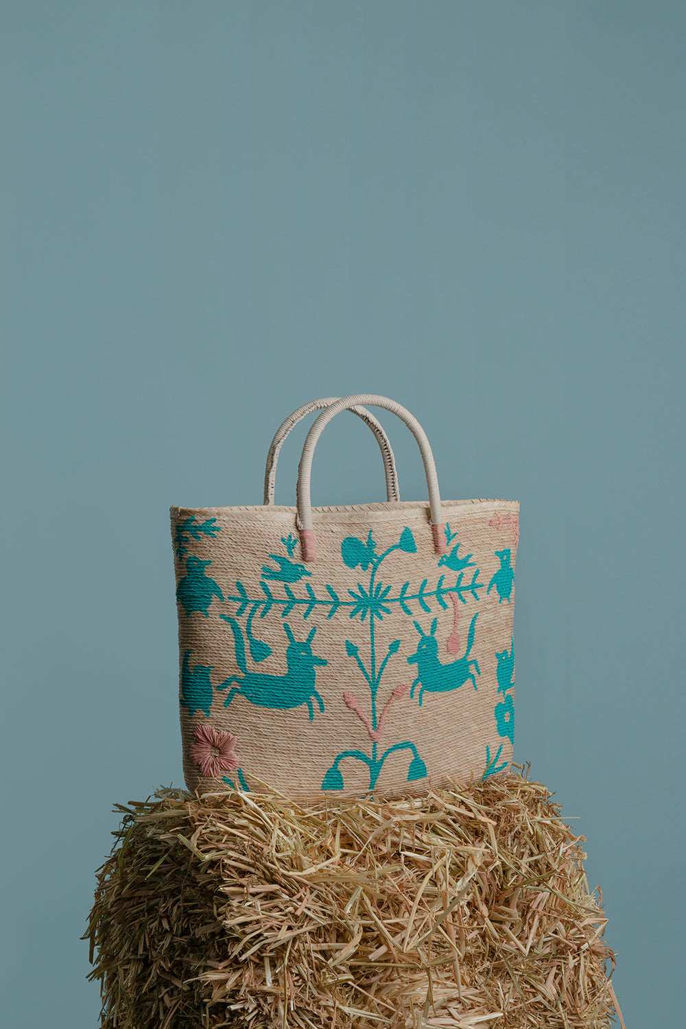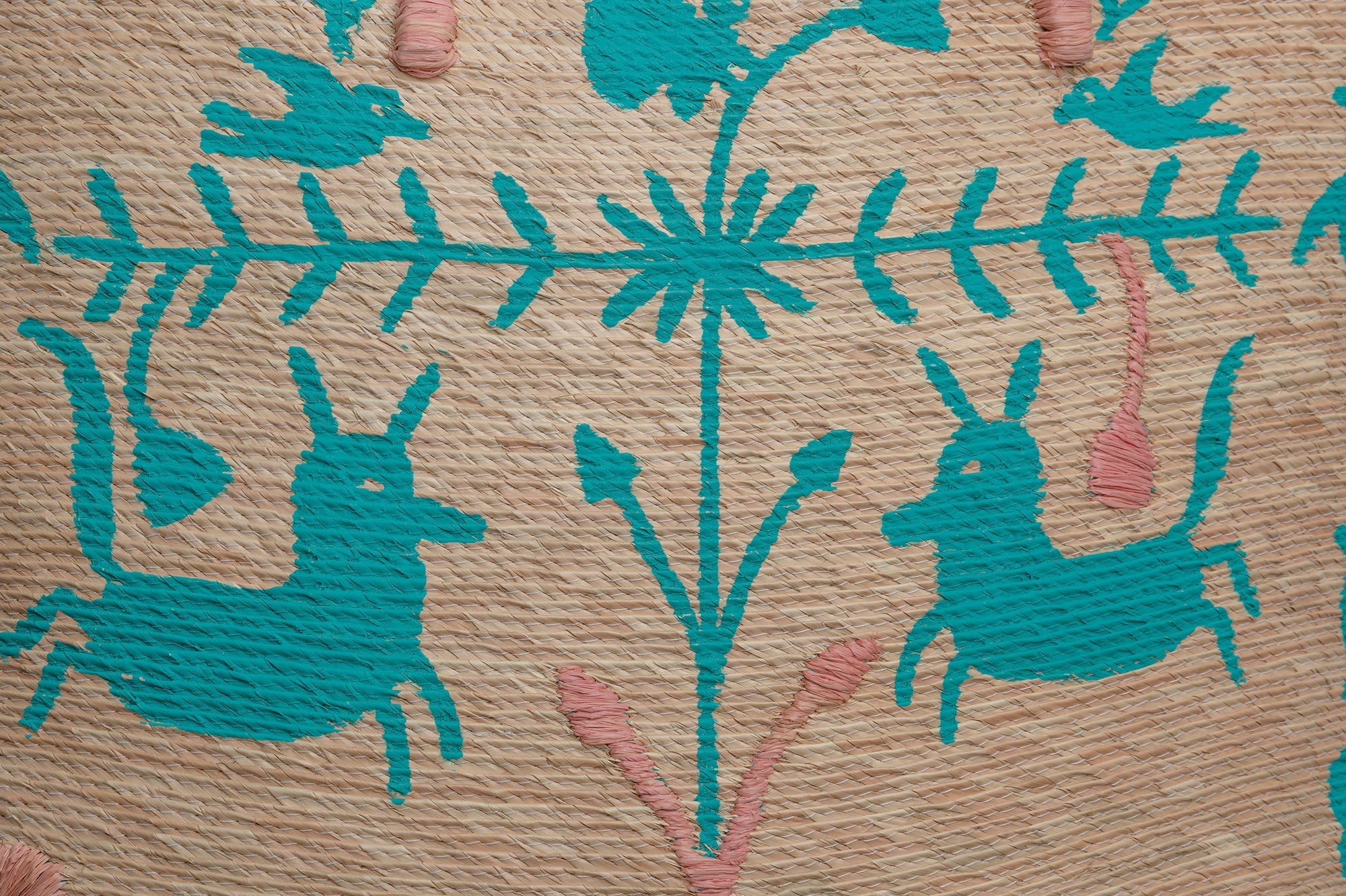 Descripción: Pintado y bordado a mano Bolso de palma con diseño otomí. Asas forradas con cordón y rafia. Forro y funda incluidos. Los colores y tamaños pueden variar.