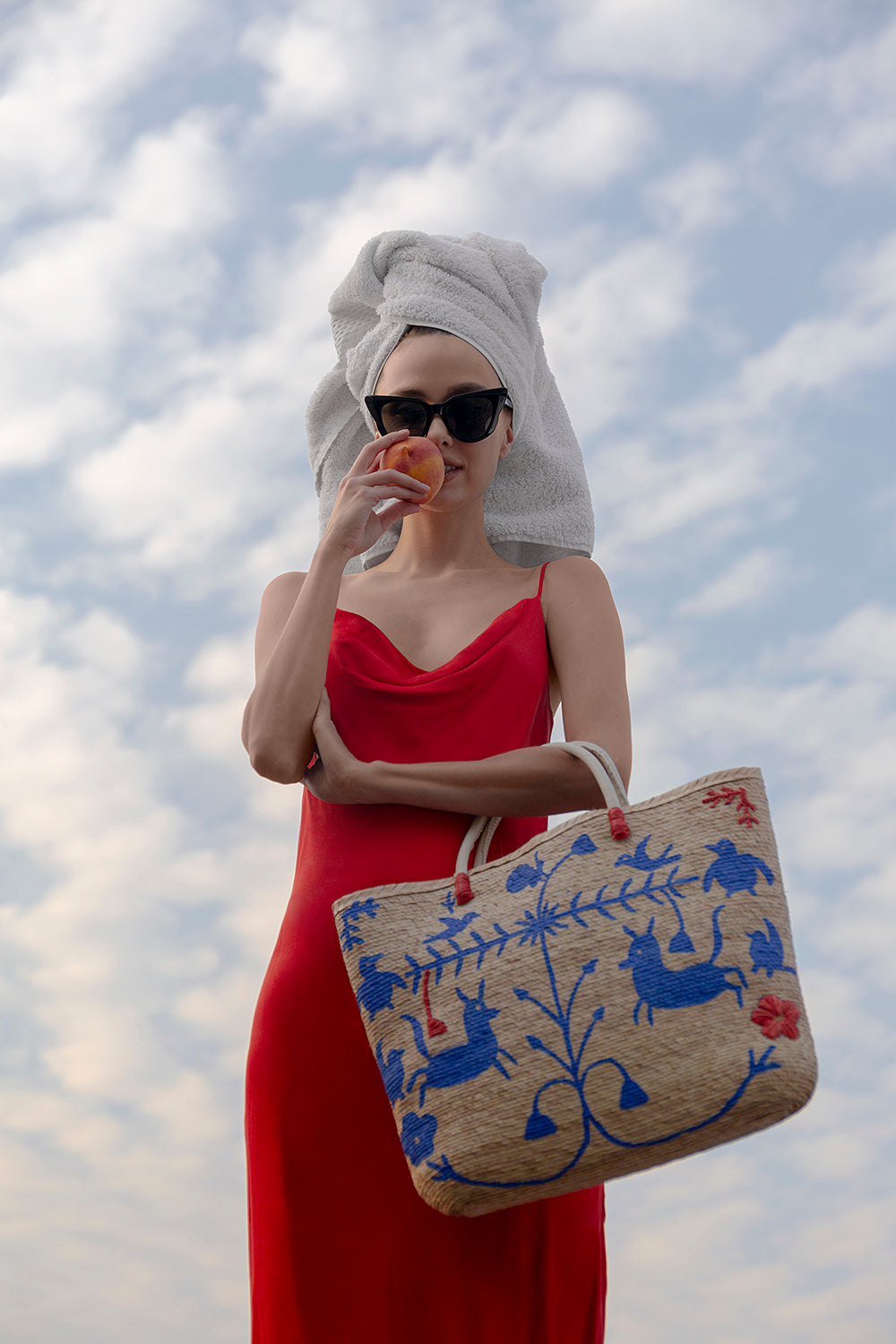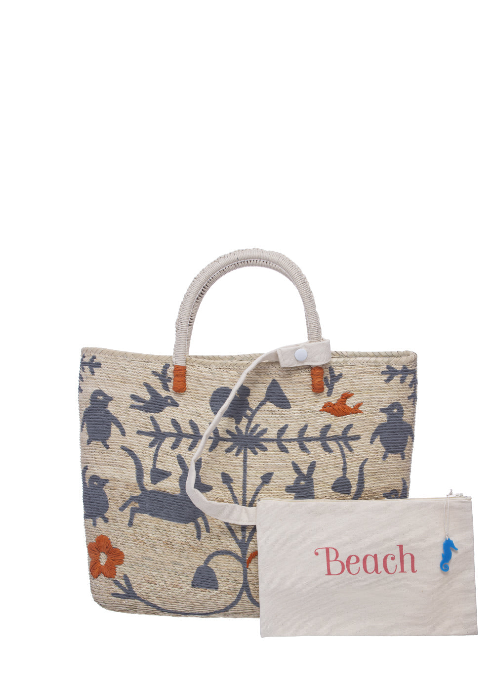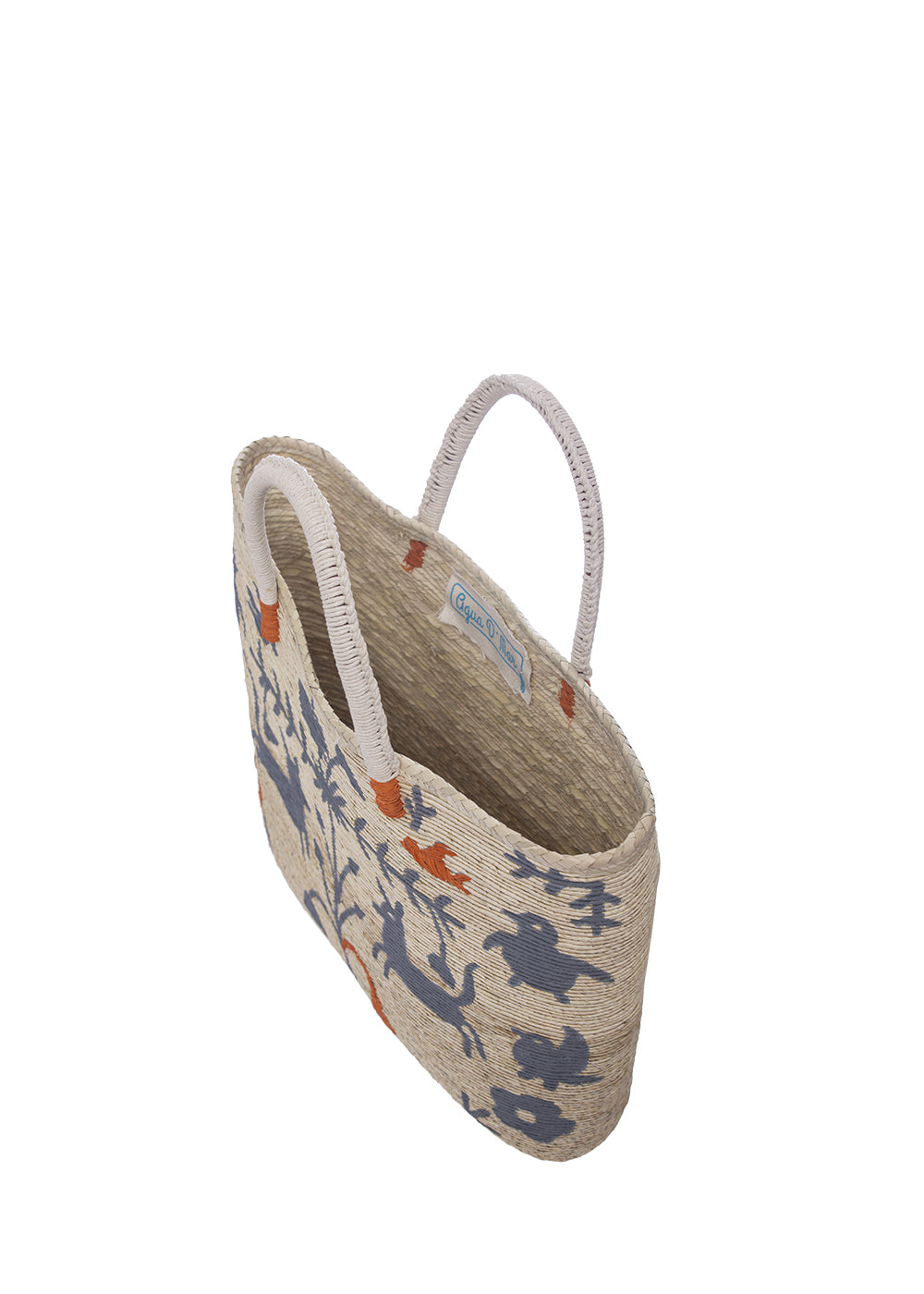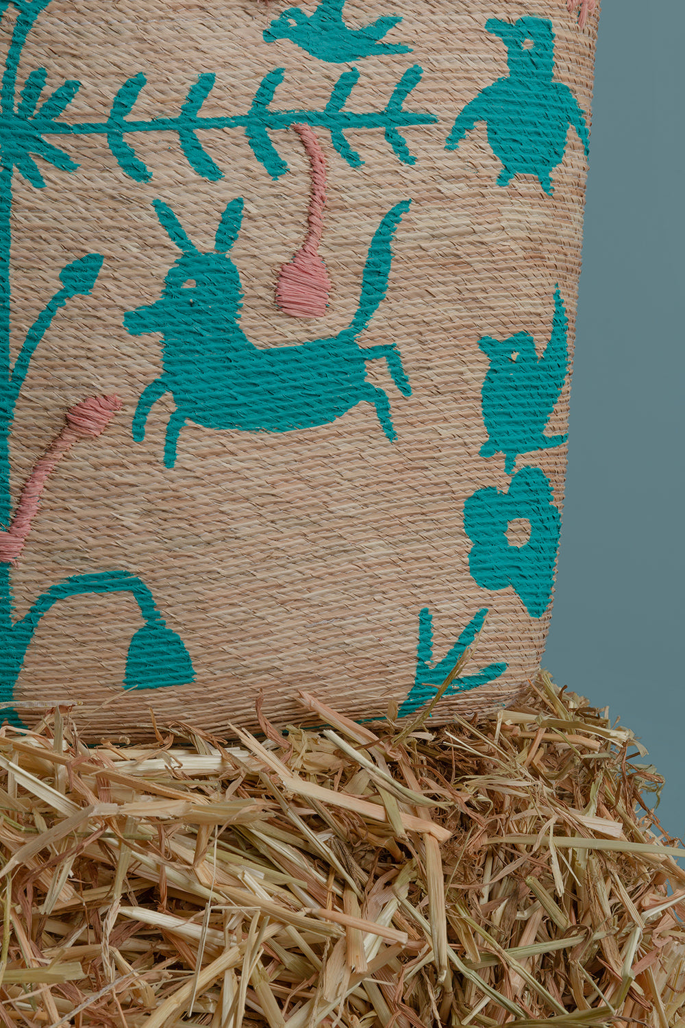 Descripción: Pintado y bordado a mano Bolso de palma con diseño otomí. Asas forradas con cordón y rafia. Forro y funda incluidos. Los colores y tamaños pueden variar.