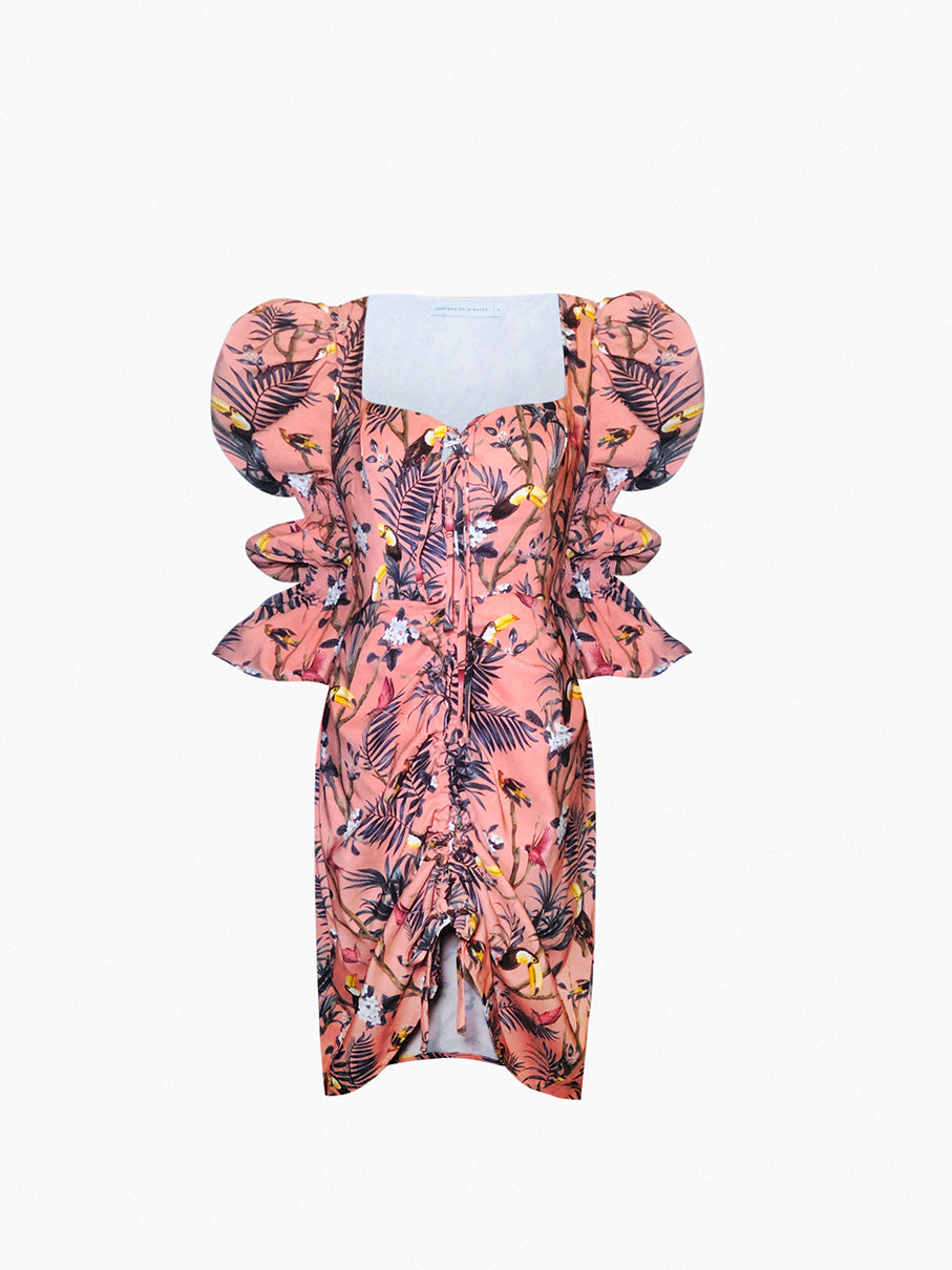 Vestido corto con mangas en 2 globos, con detalles en V -neckline con cintas para ajustar el busto, en la parte inferior tiene una tira de mucho tiempo. Impresión exclusiva, inspirada en transmitir alegría, libertad, esperanza a través de sus colores. Base: Rosella.