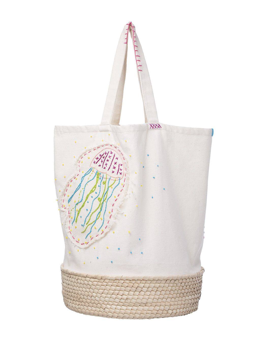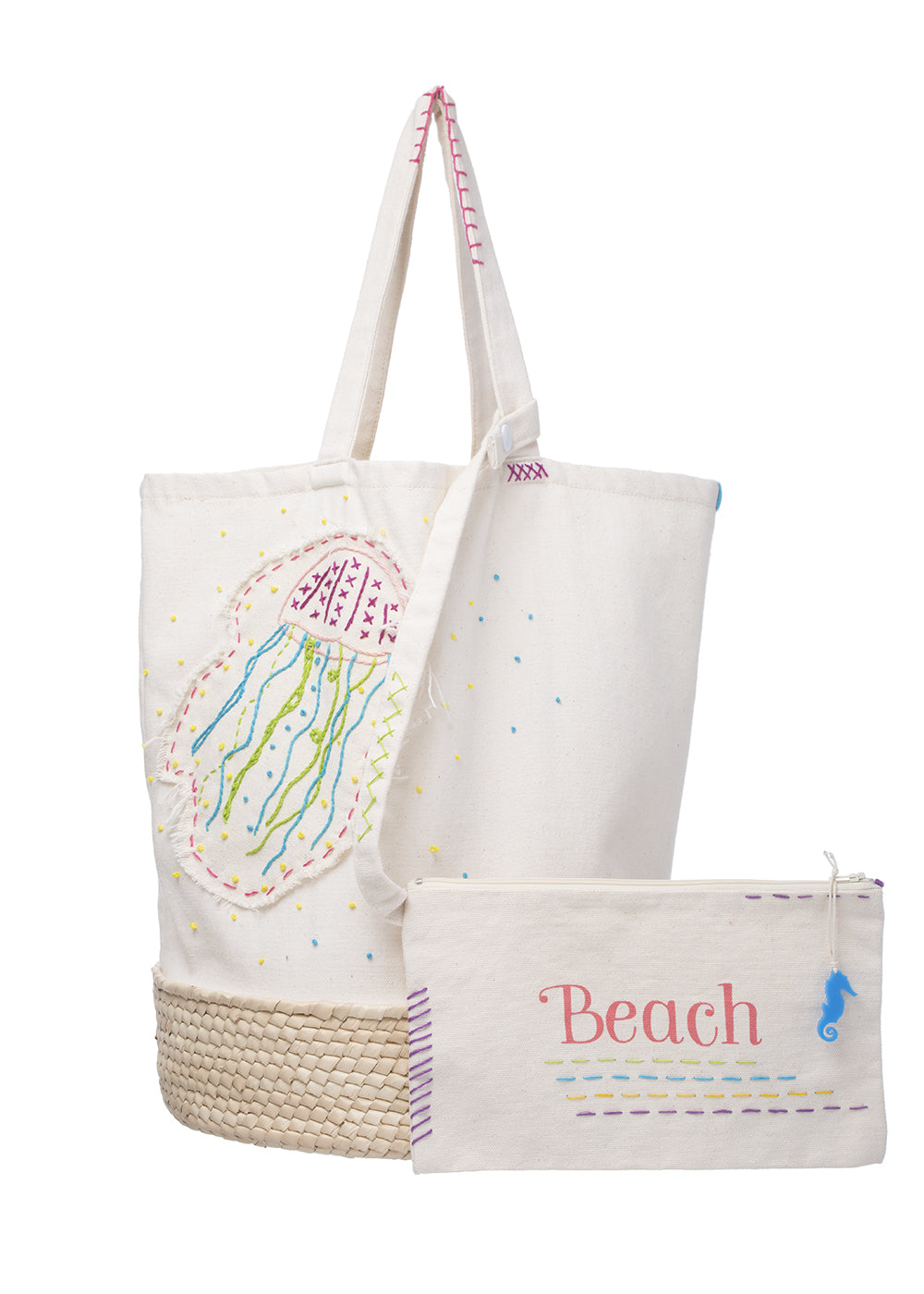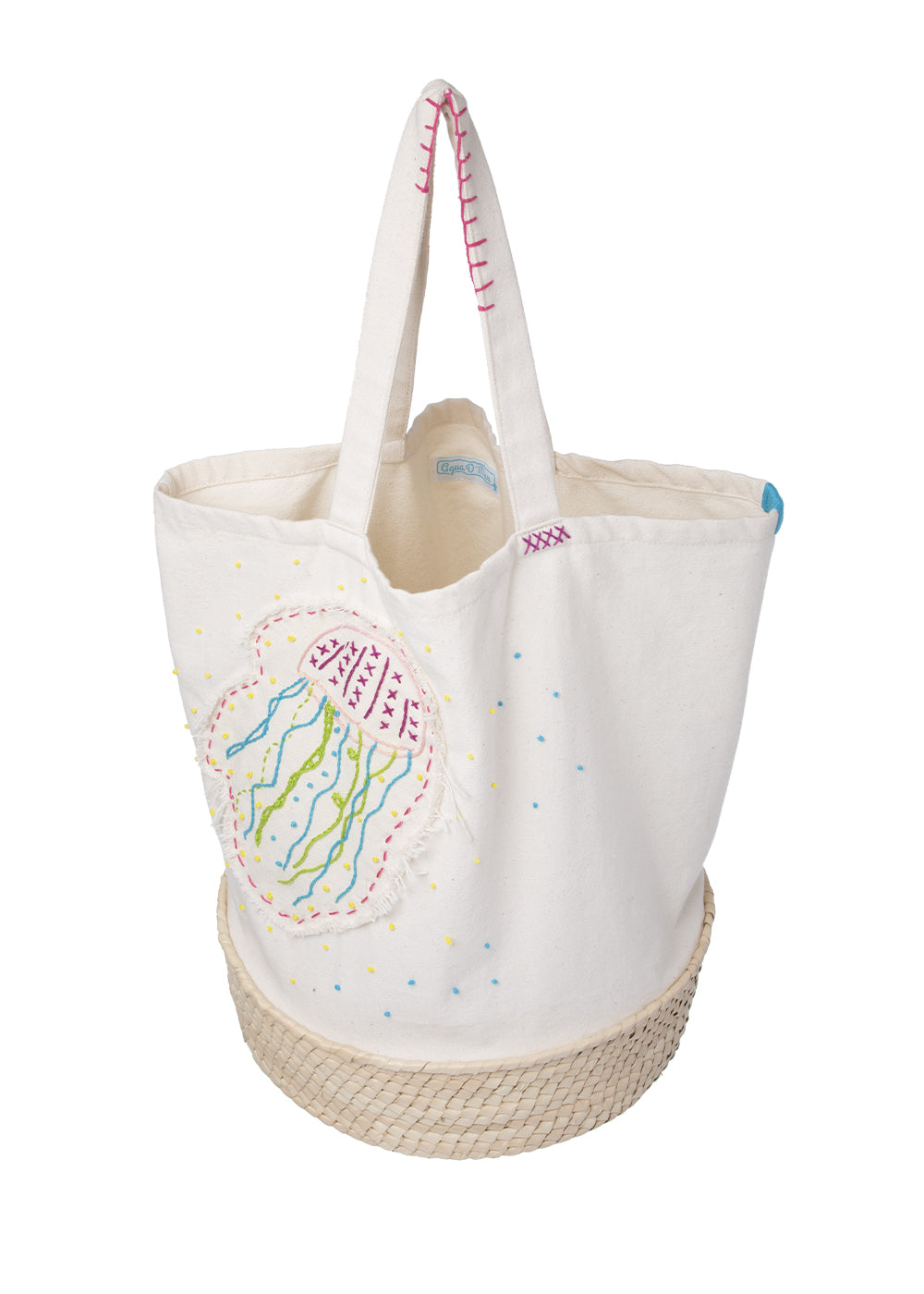 Descripción: Bolsa de lona con base en palma y diseño personalizado. Incluye funda y funda bordada. Los colores y tamaños pueden variar.