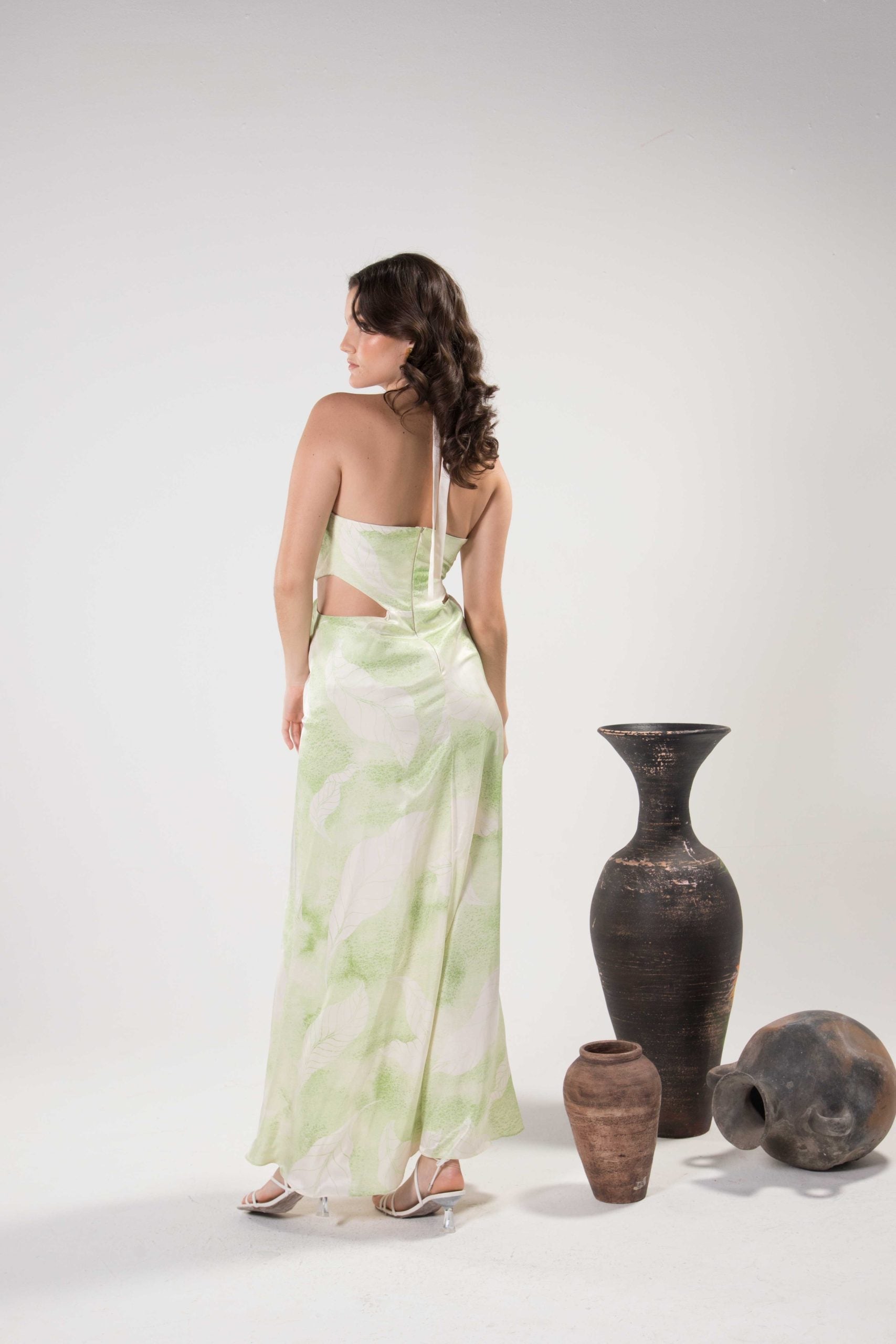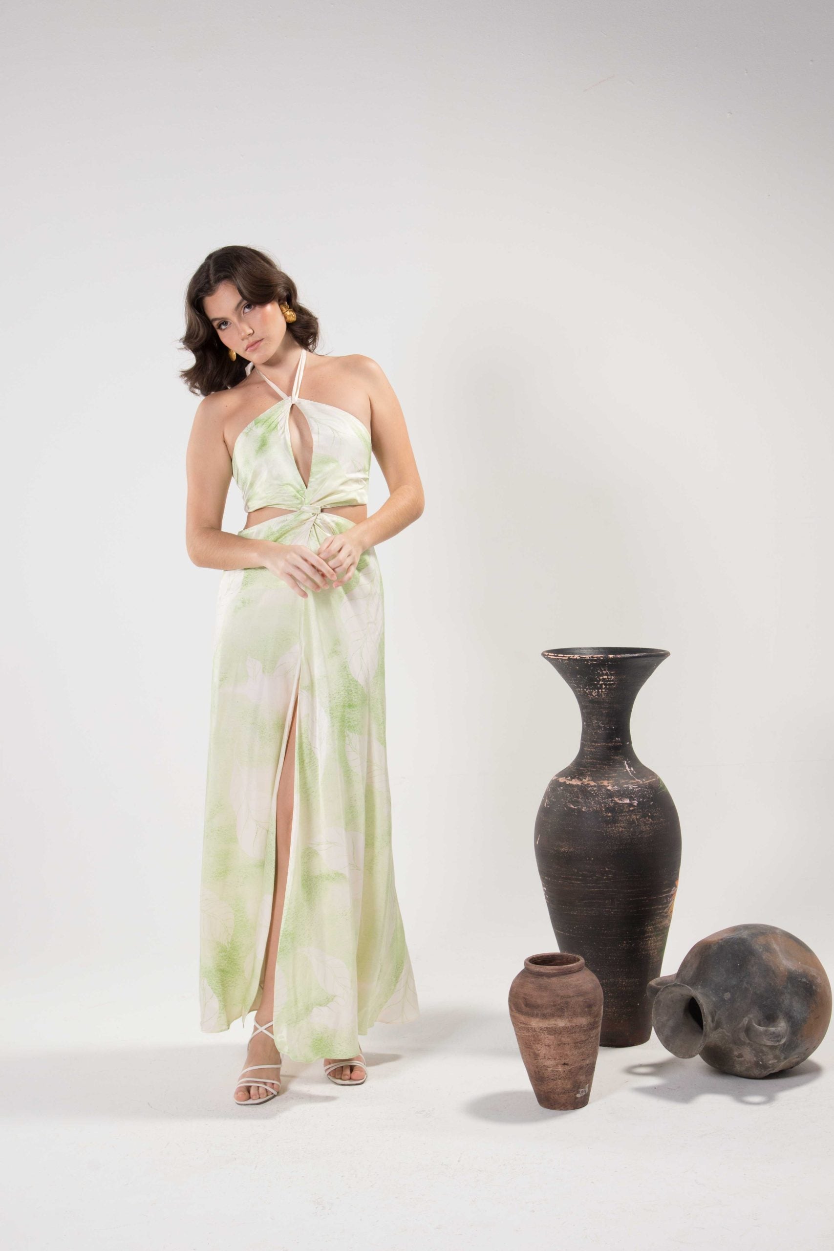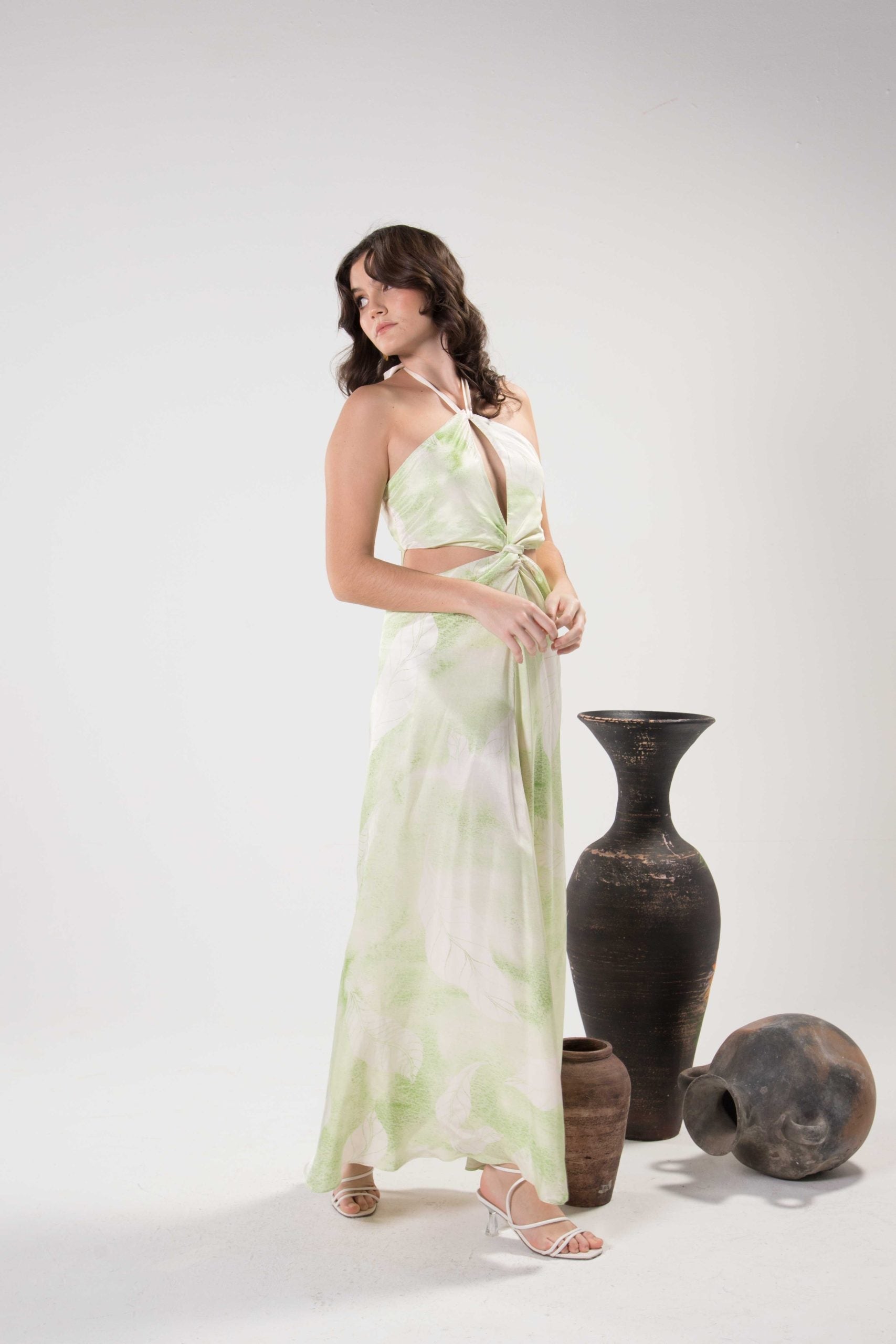 Este vestido está hecho de lujosa tela de viscosa Tencel. Cuenta con nuestros nuevos estampados de acuarela, con un cuello halter que se sumerge en un nudo en el centro.