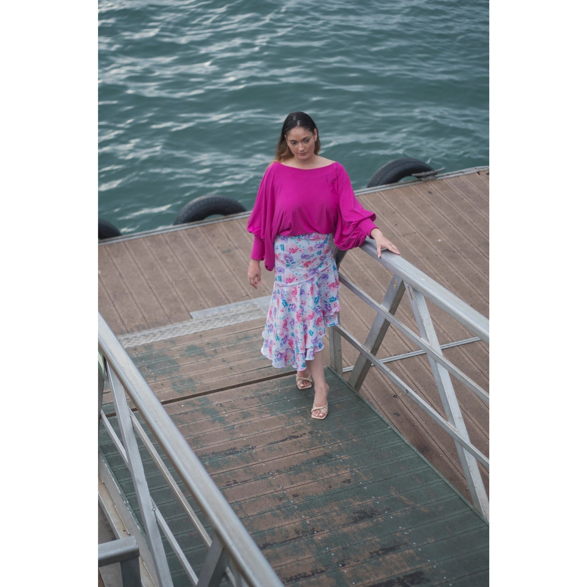 Falda con detalles de vuelos asimétricos, impresión floral exclusiva de la marca.