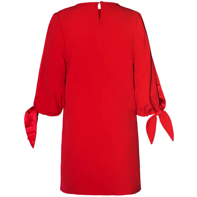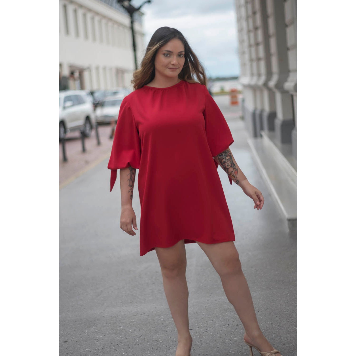Mini vestido, silueta recta, con escote redondo y detallado en mangas.