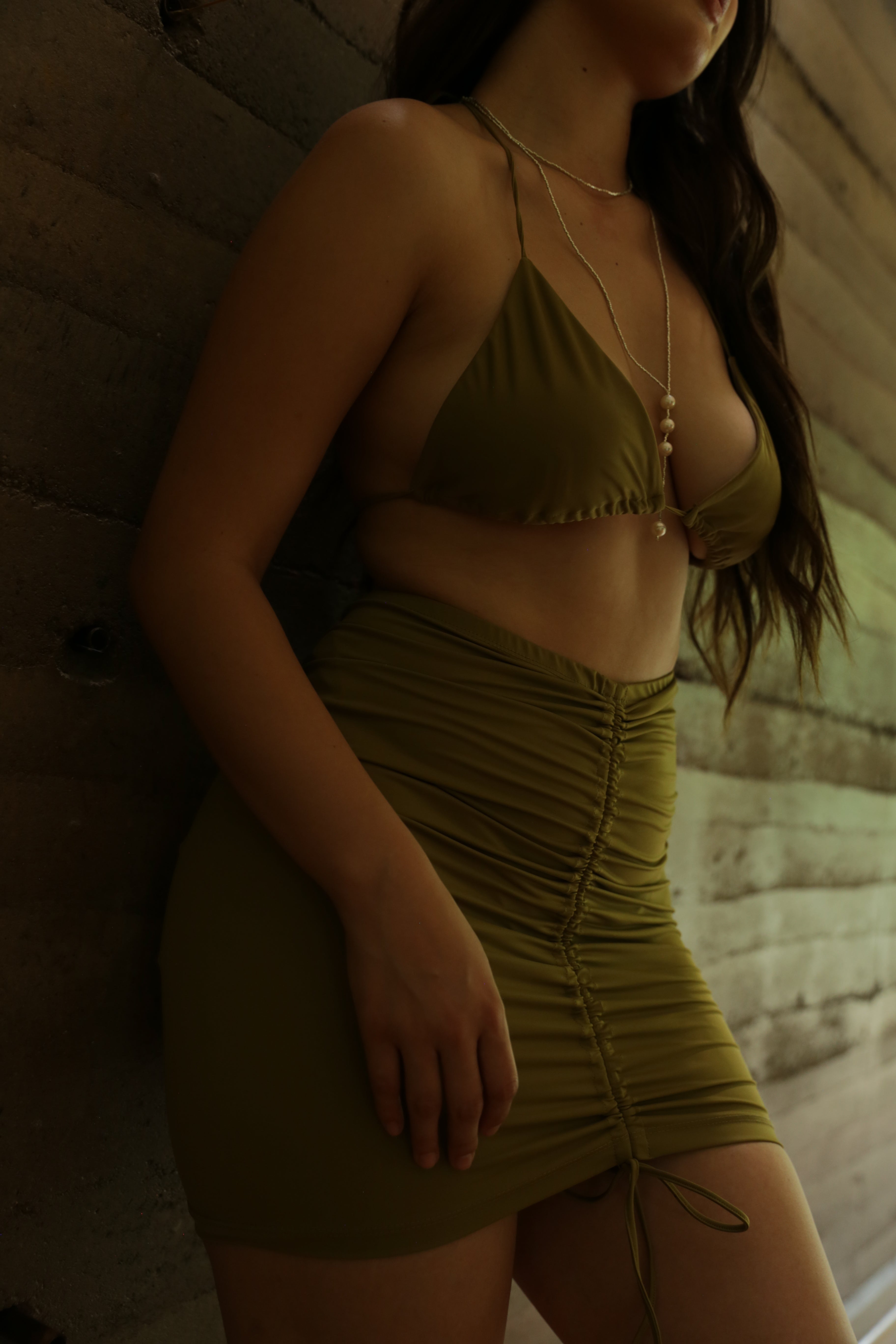 Mini falda drapeada y ajustable en el bajo. El conjunto perfecto para nuestros trajes de baño.