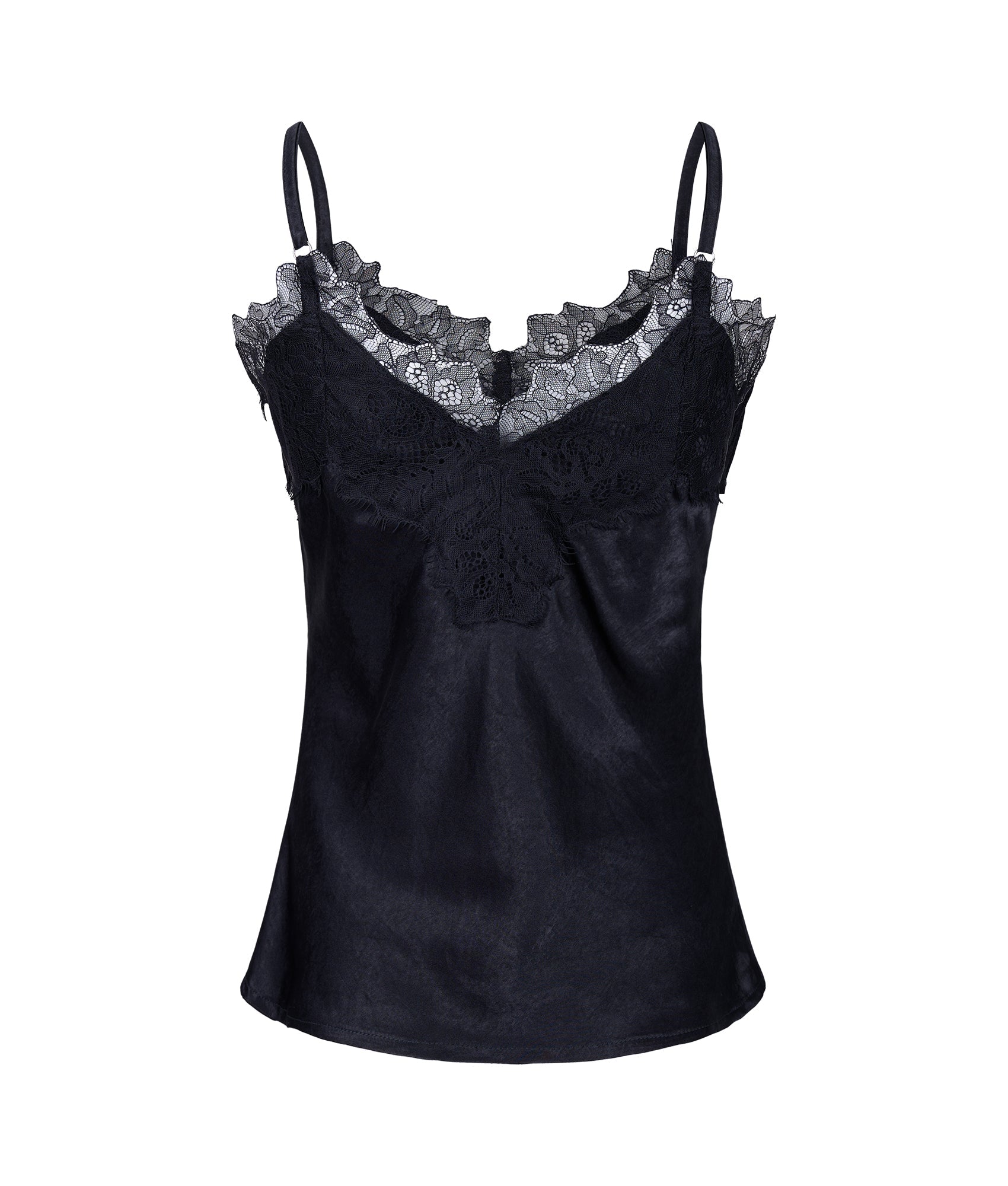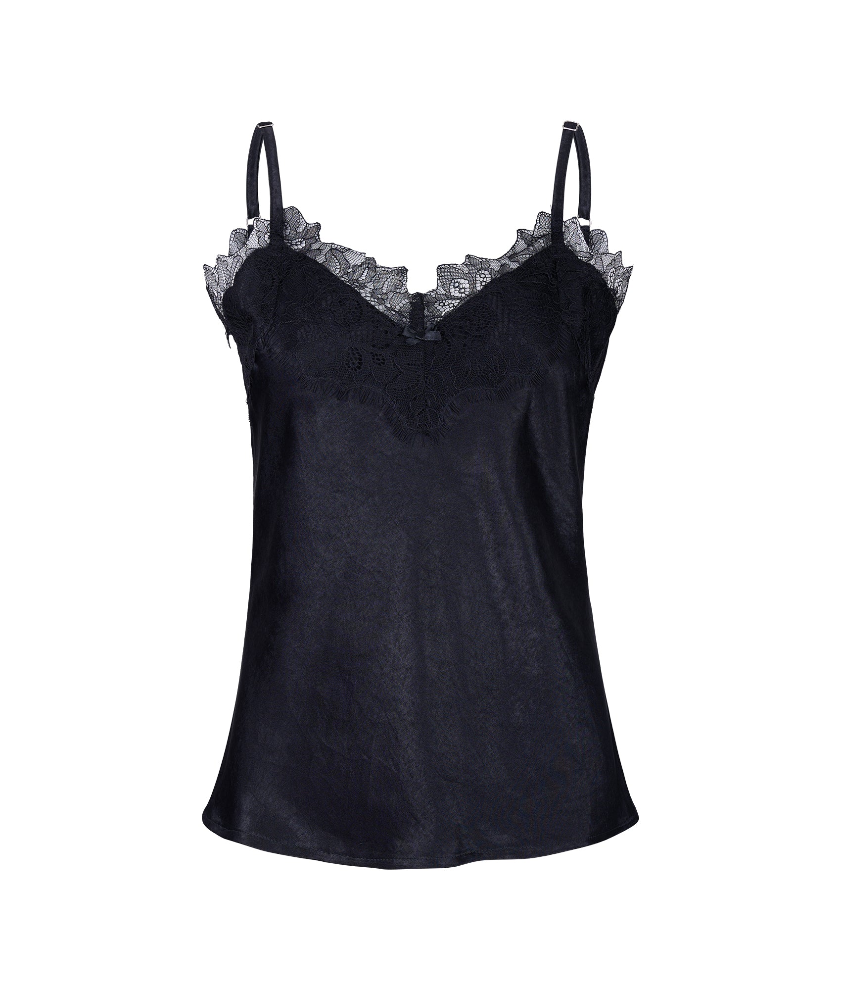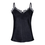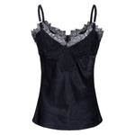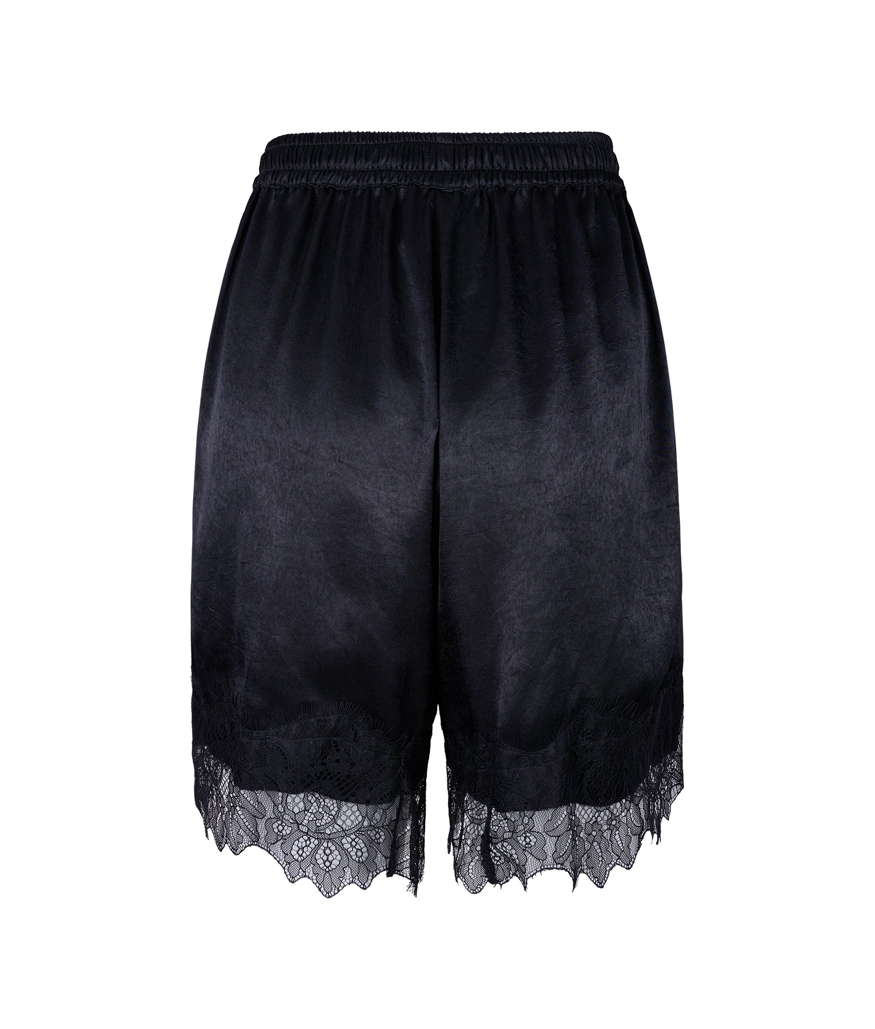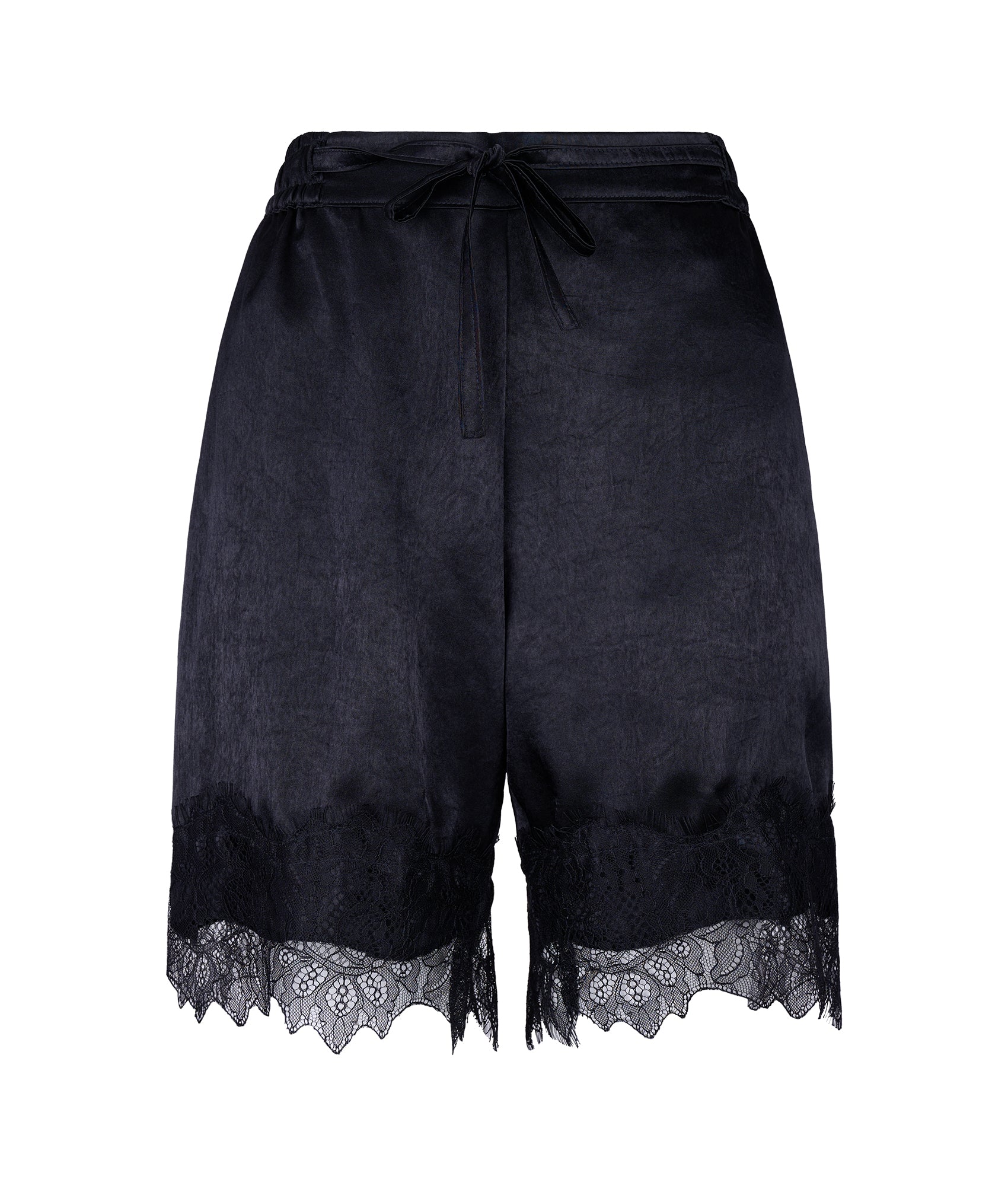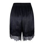Set de top y bermuda de satín negro y detalle de encaje negro en escote.