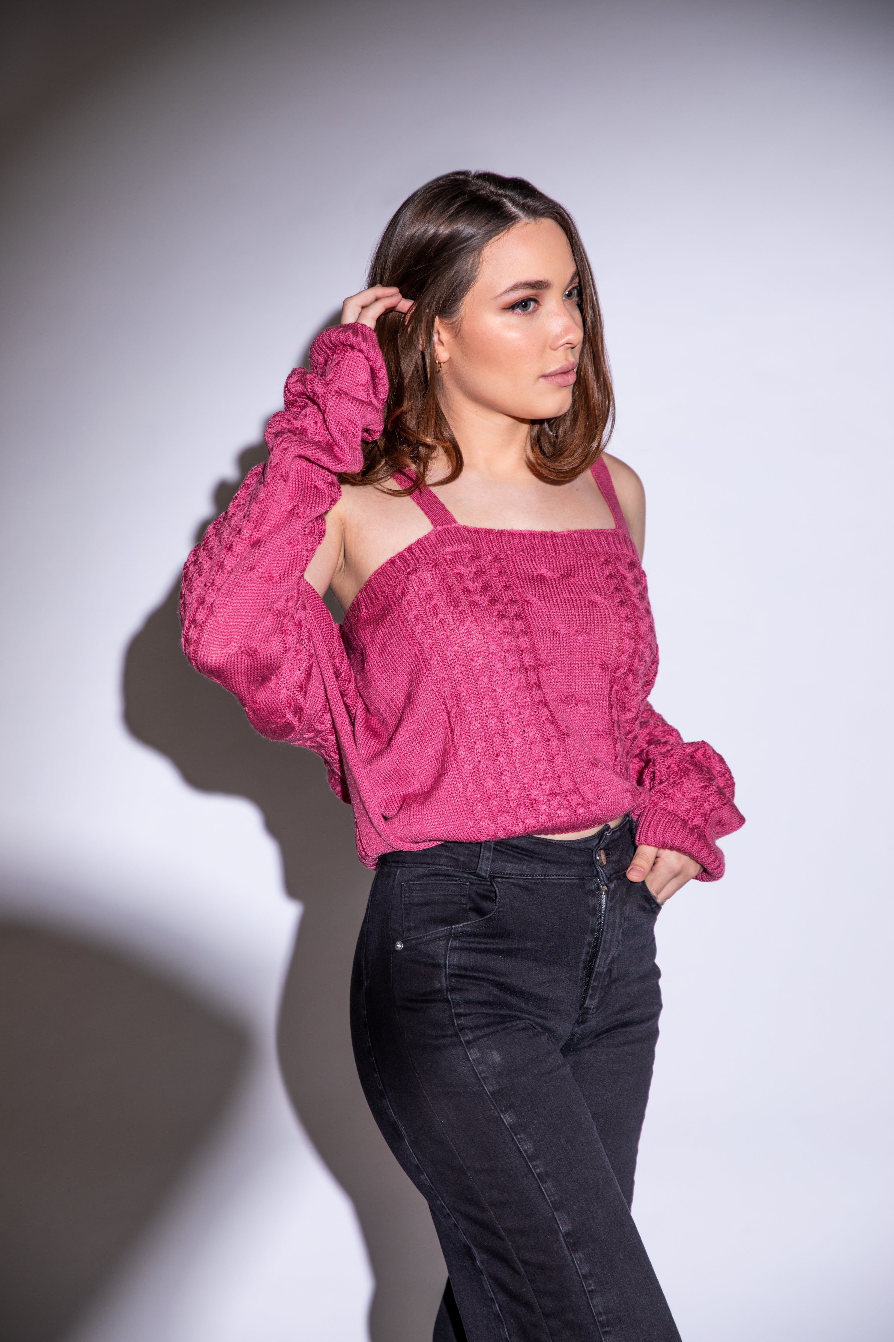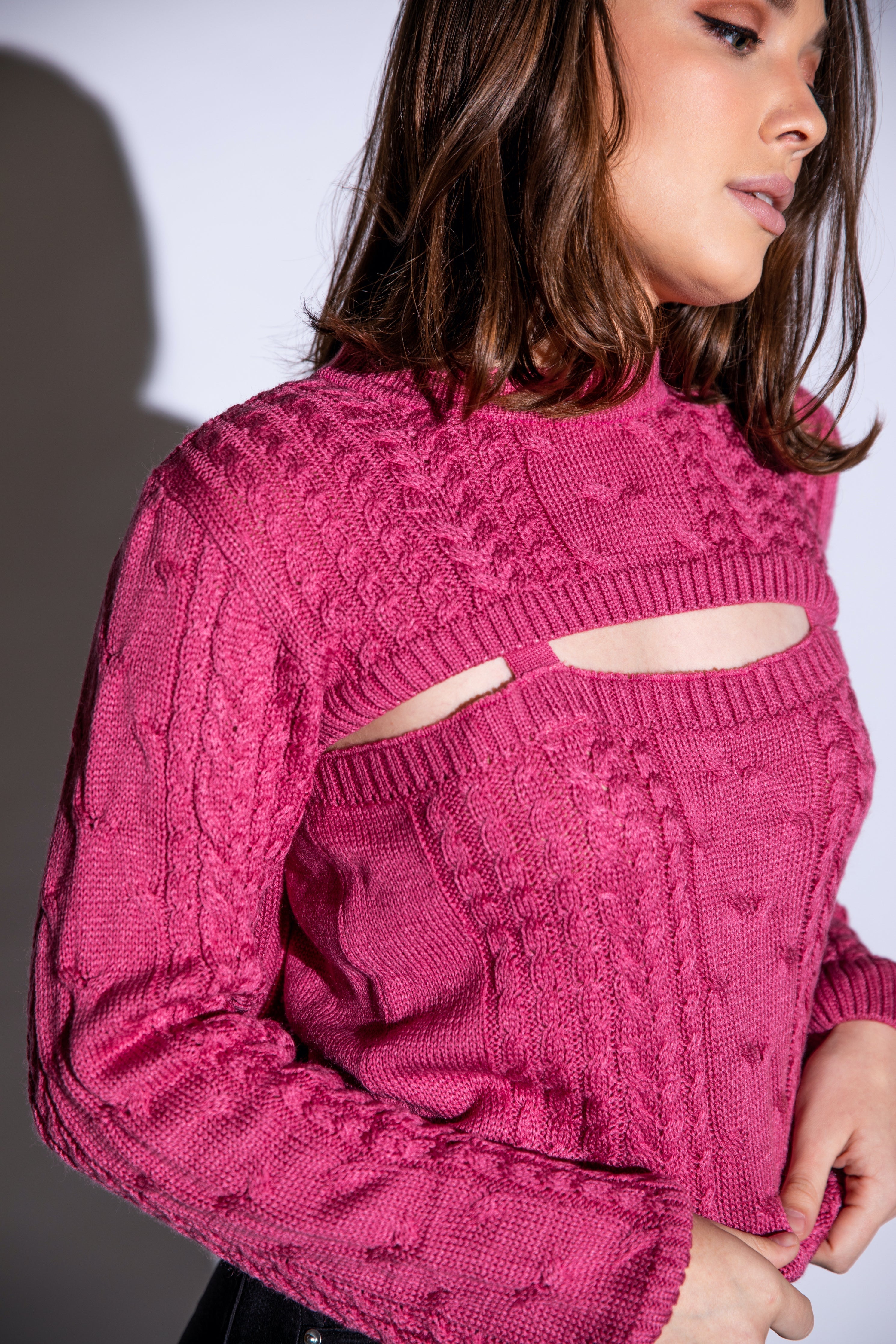 suéter de tejido de punto rosa trenzado, tapa de los frenos y suéter conectados en la parte posterior, que componen la misma pieza.