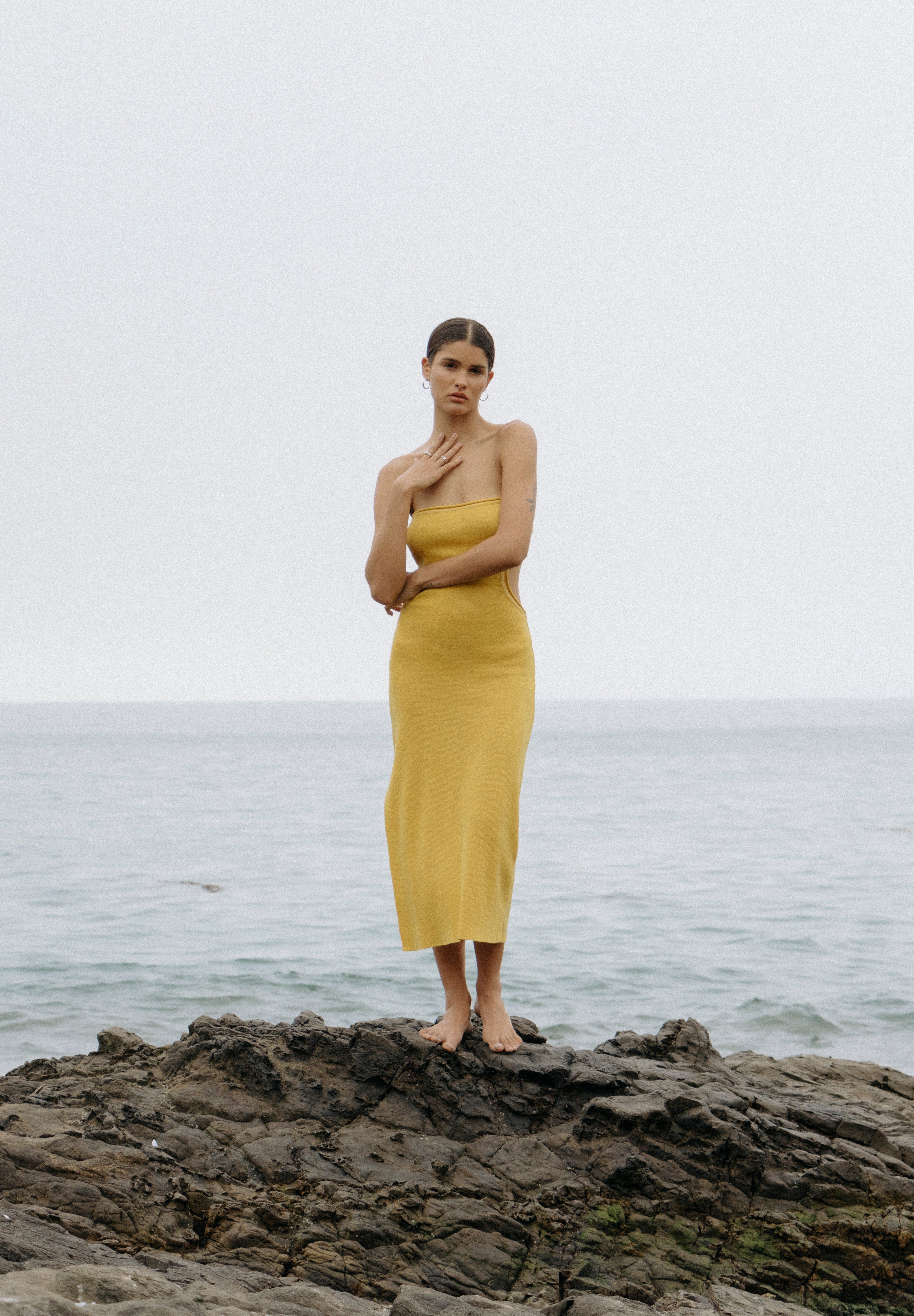 Vestido strapless con escote y abertura en costado de la falda. 3 formas de uso