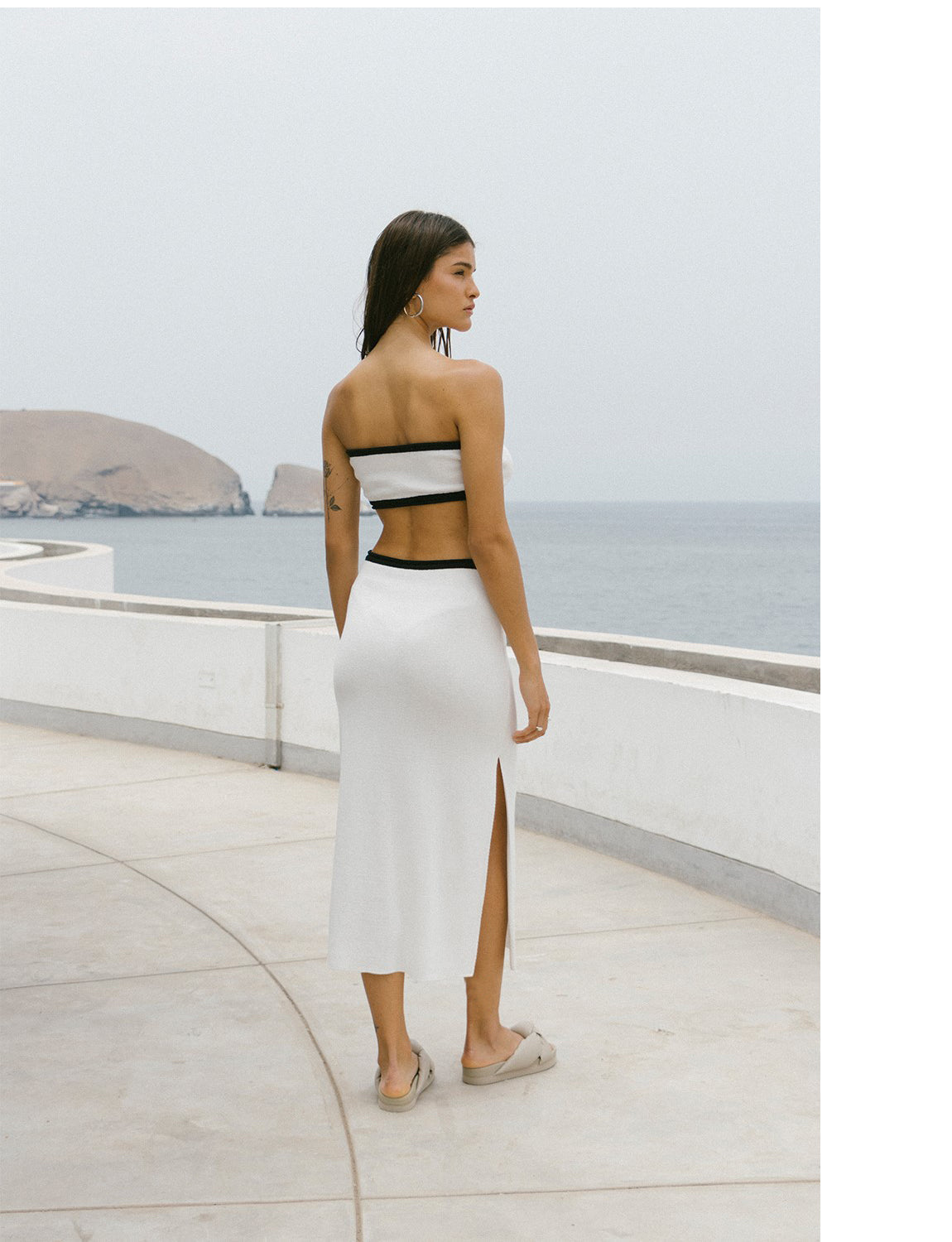 Vestido strapless con escote y abertura en costado de la falda. 3 formas de uso