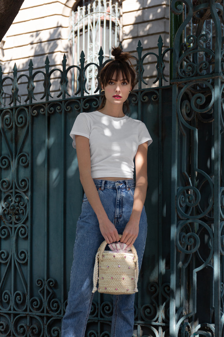 Materiales: 100% palma, Swarovski. Forro 100 % algodón