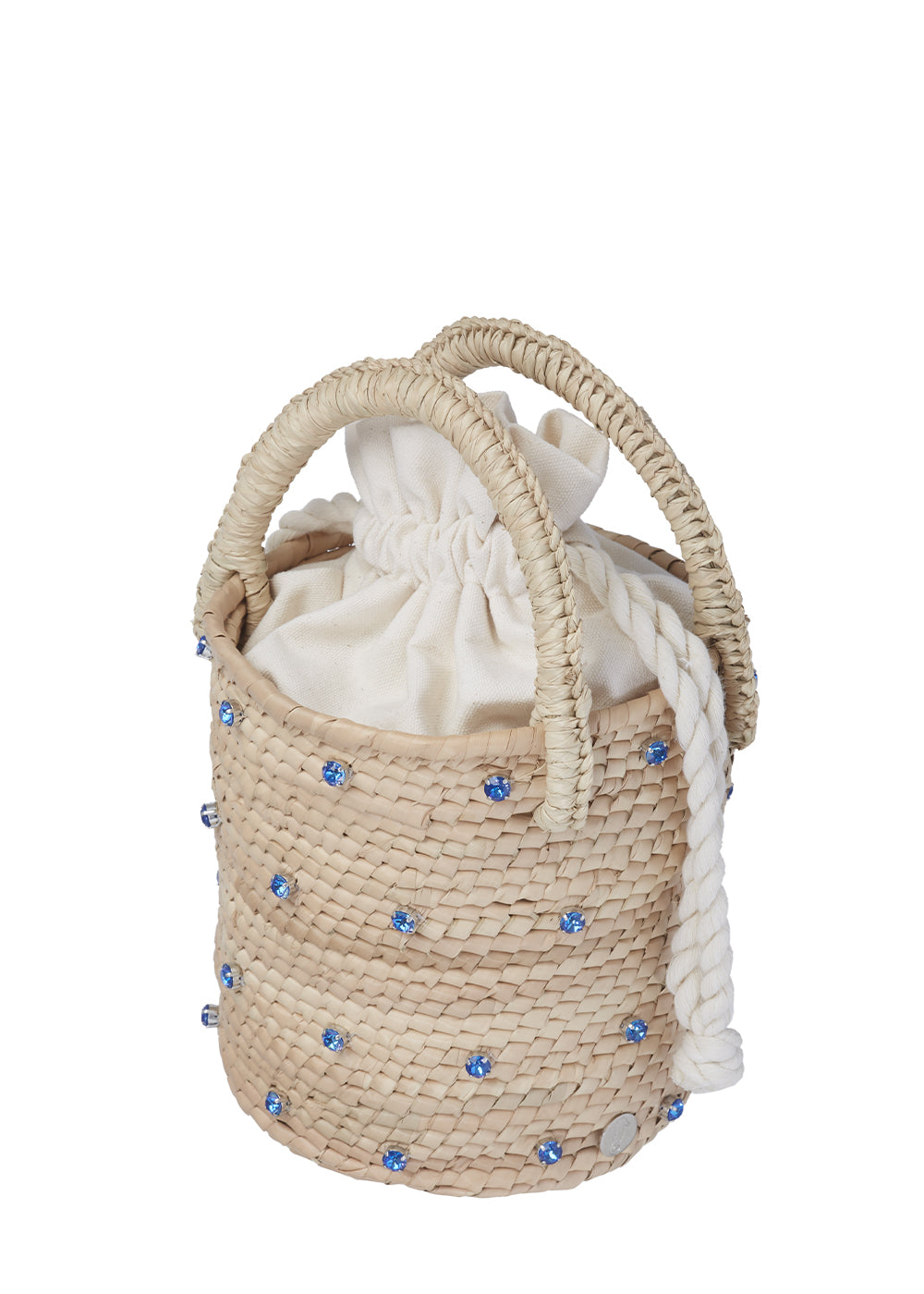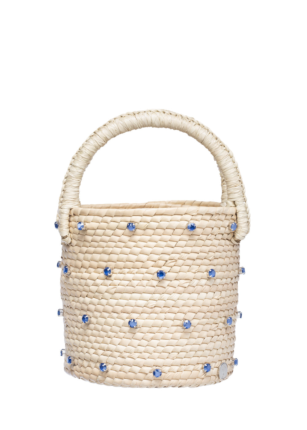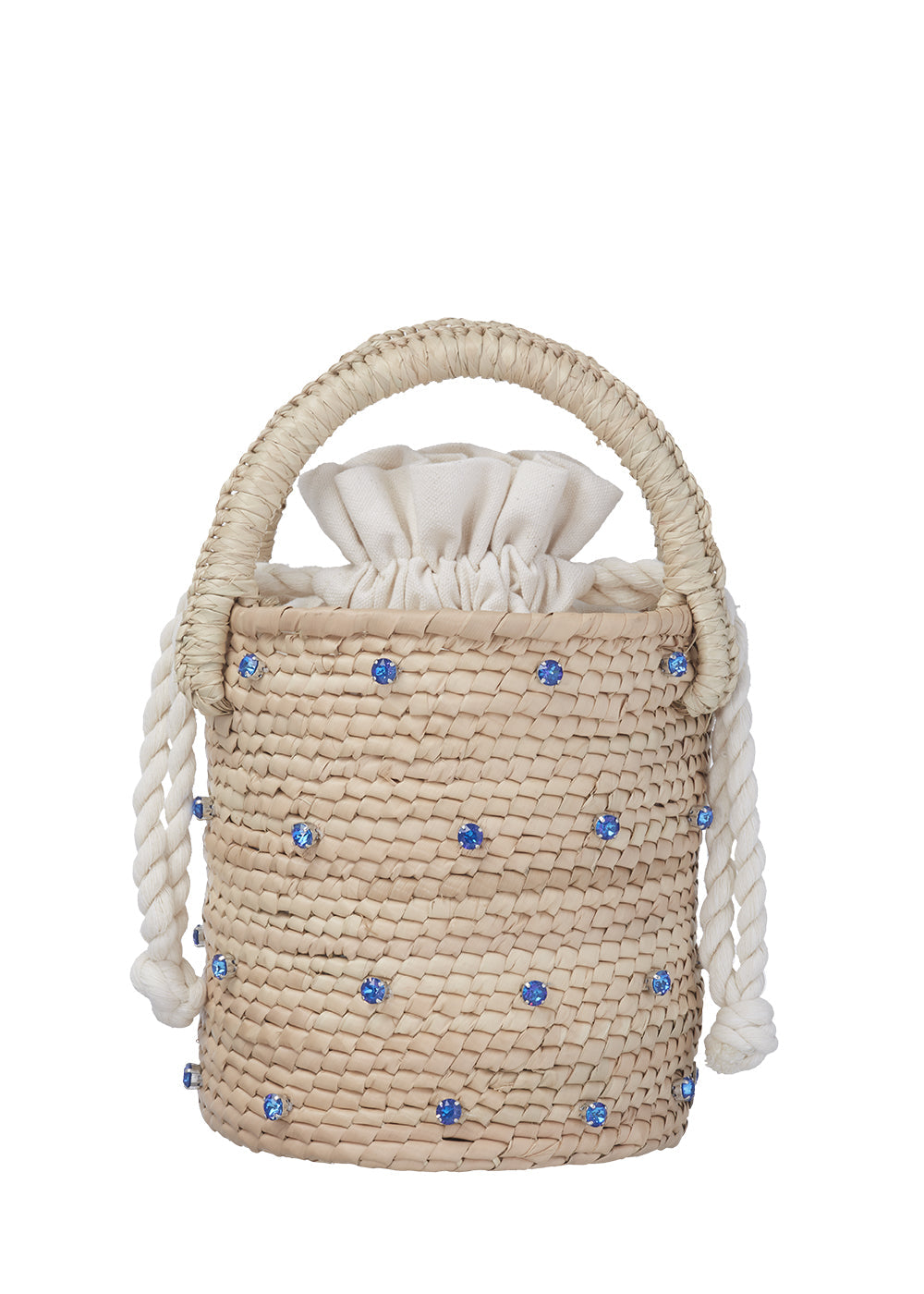 Descripción: Bolso de palma con aplicaciones de Swarovski. Forro y funda incluidos. Los colores y tamaños pueden variar.