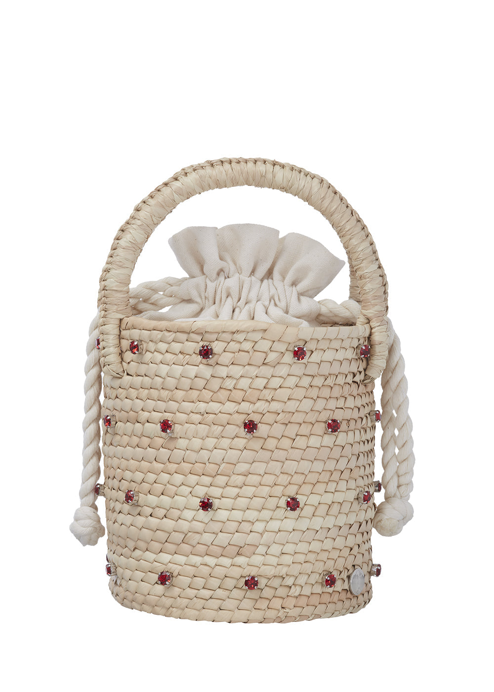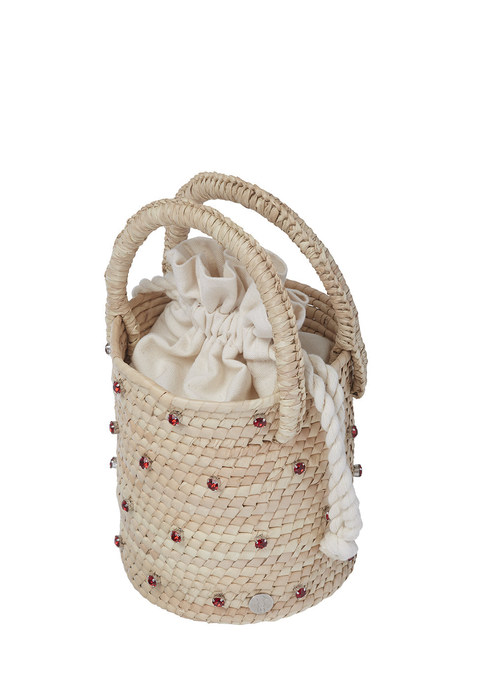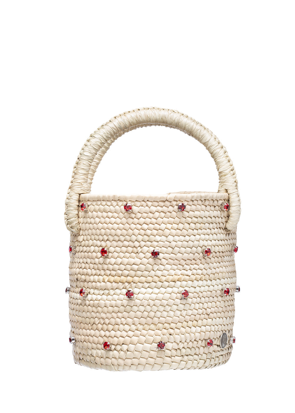 Descripción: Bolso de palma con aplicaciones de Swarovski. Forro y funda incluidos. Los colores y tamaños pueden variar.