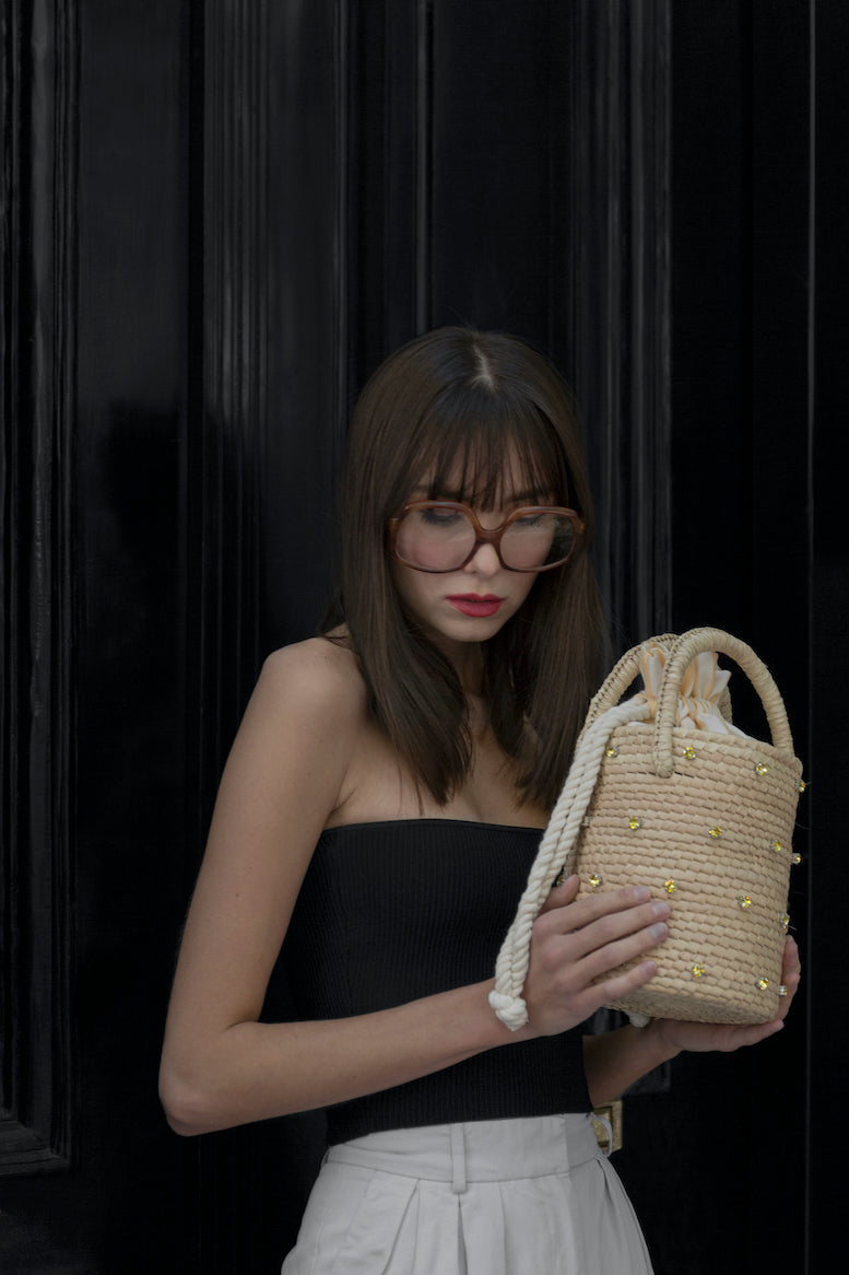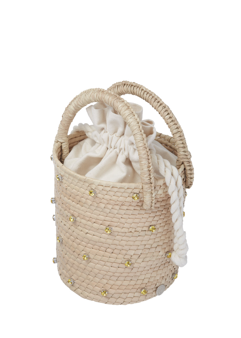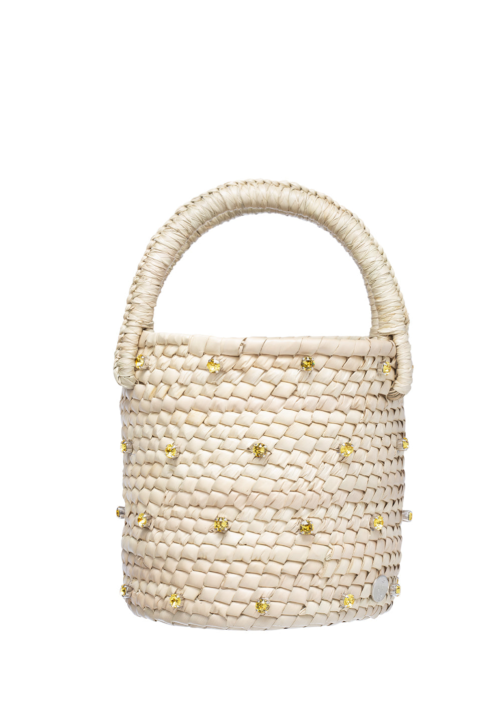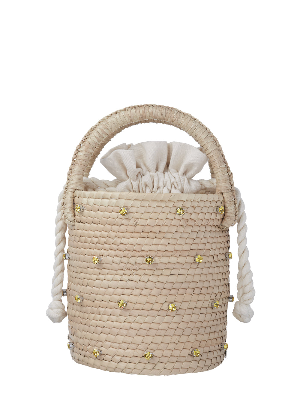 Descripción: Bolso de palma con aplicaciones de Swarovski. Forro y funda incluidos. Los colores y tamaños pueden variar.