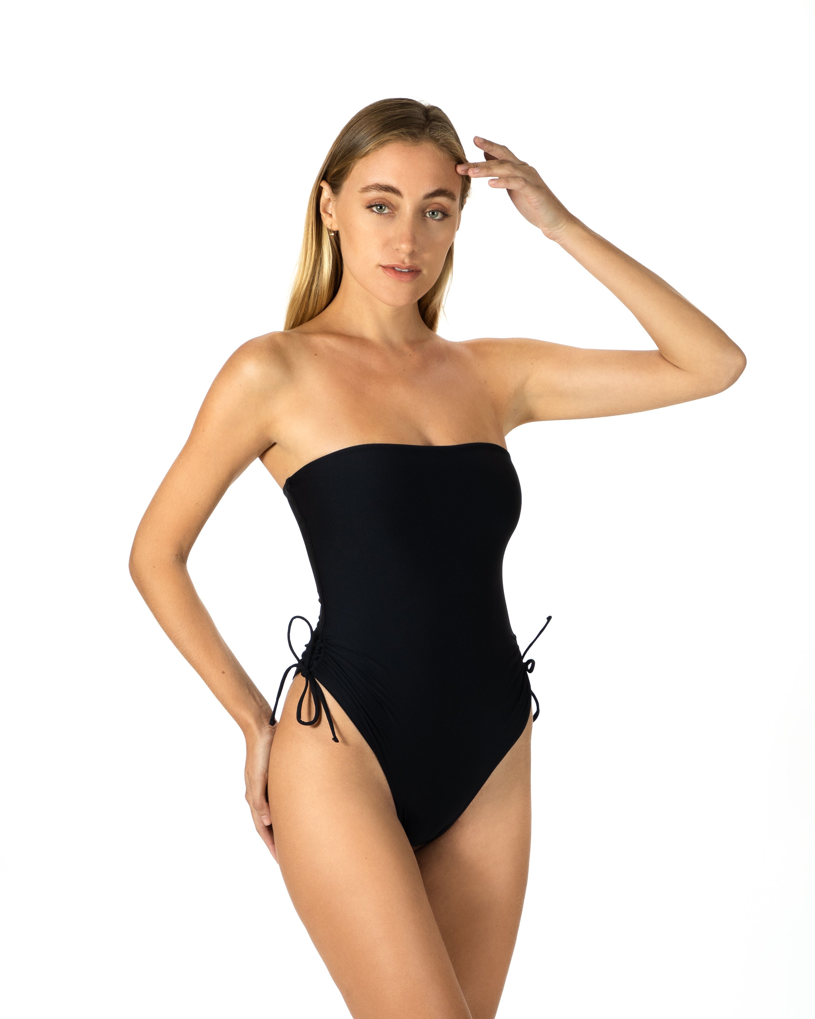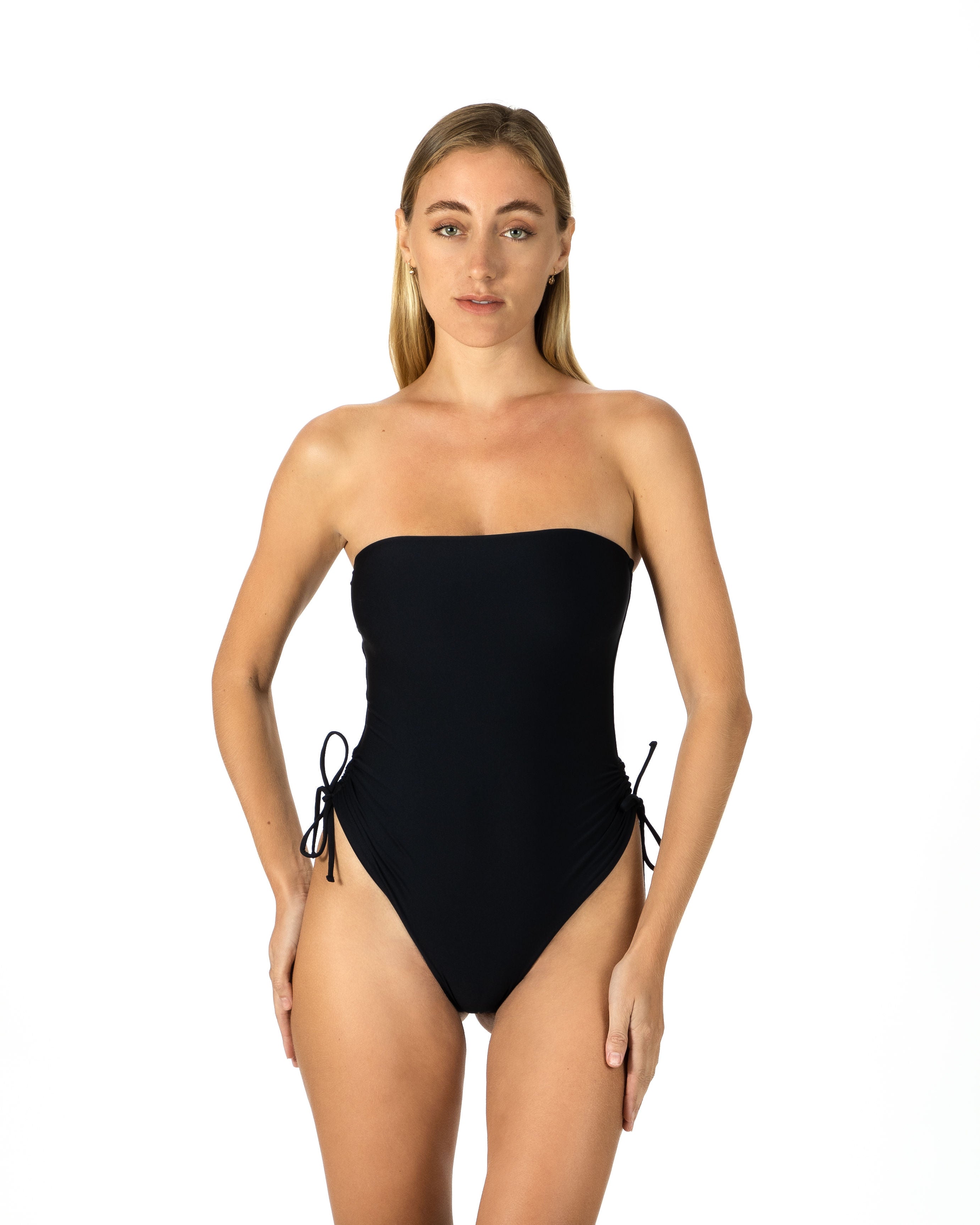 Nuestro traje de baño minimalista sin tirantes se adapta a todo tipo de cuerpo y garantiza el mejor ajuste con sus tiras laterales ajustables y su frente de corte alto. . Las piernas de corte alto alargarán tu figura.