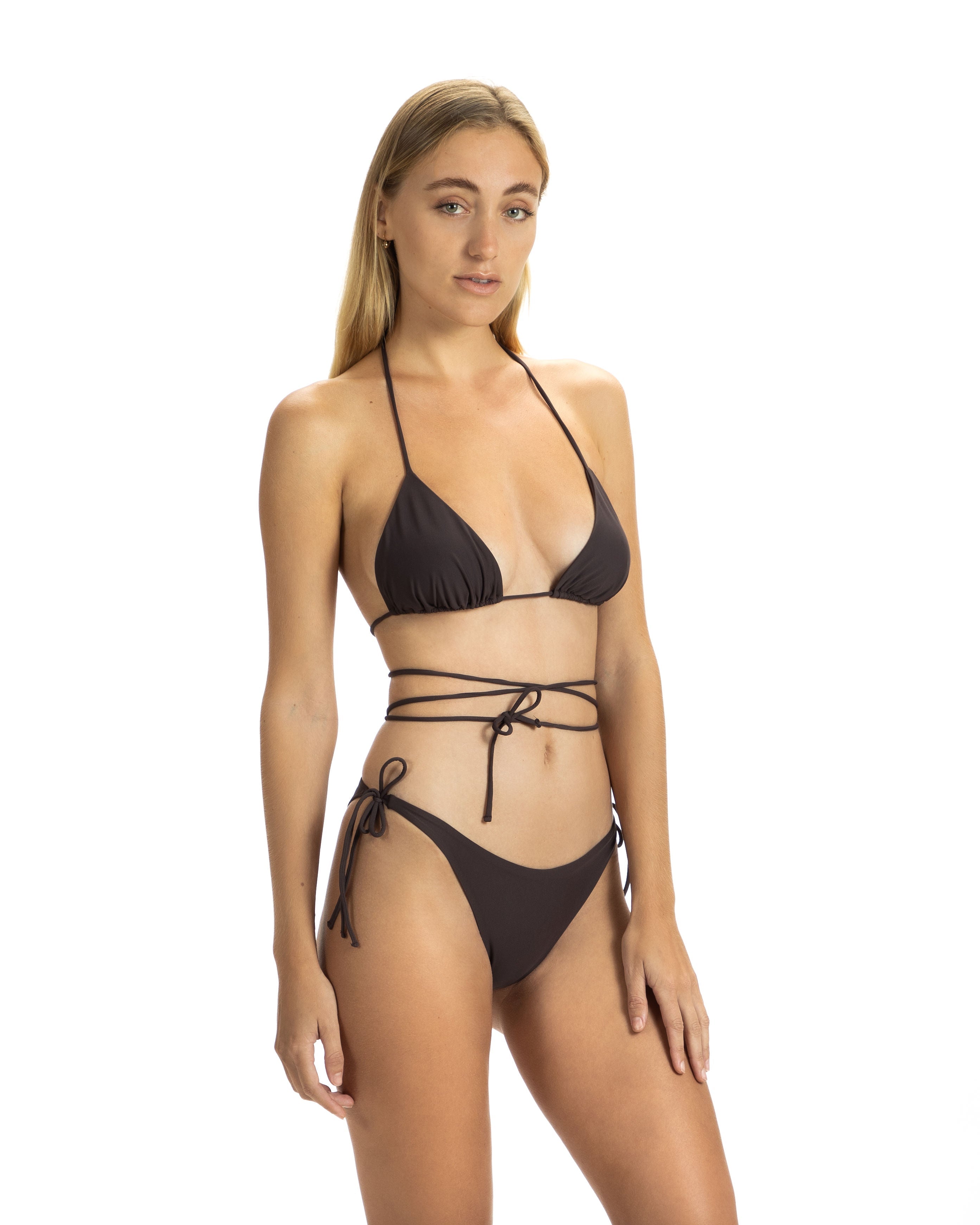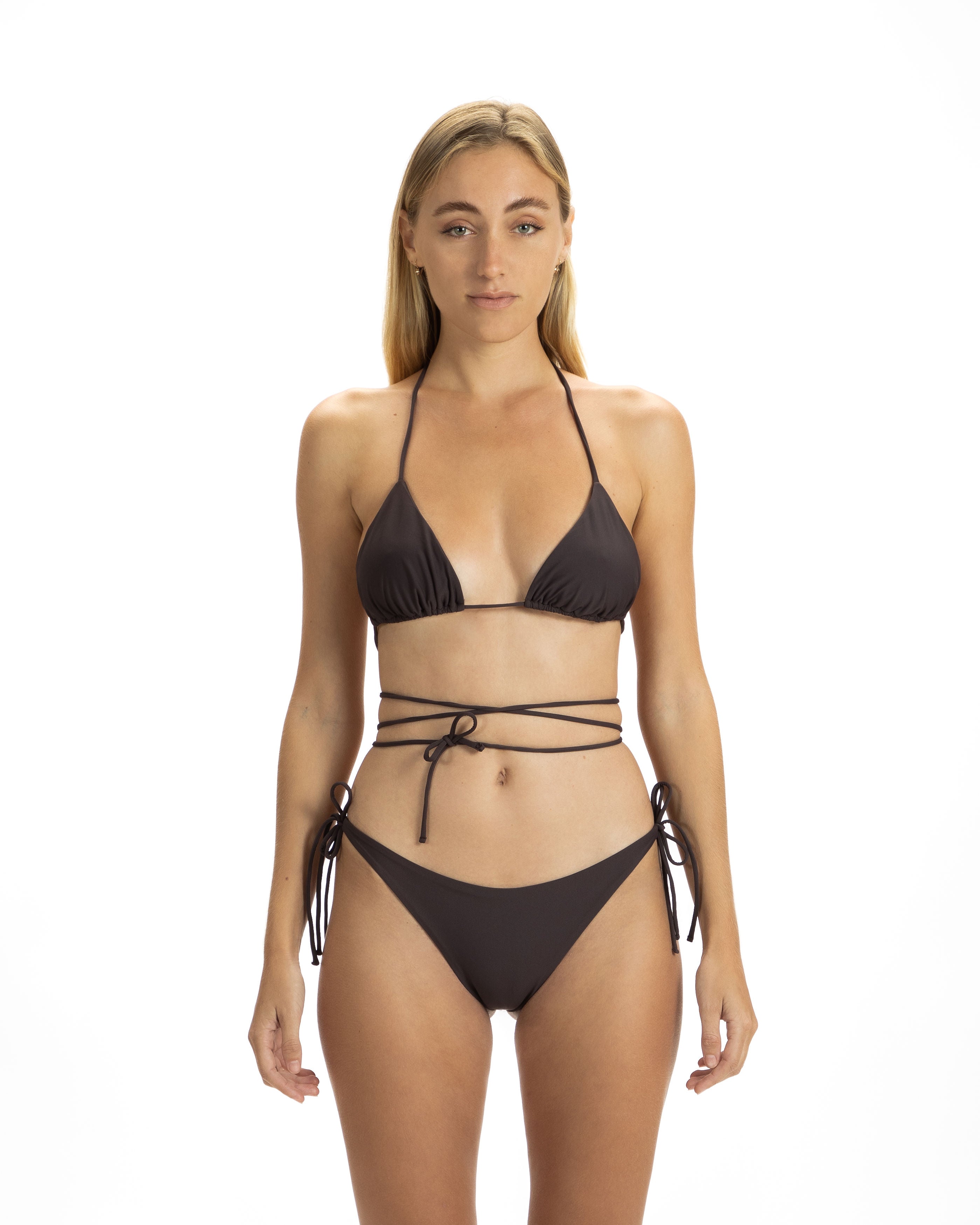 Nuestra exclusiva braguita de bikini con tiras. Con lazos laterales para un ajuste perfecto y un aro dorado en la parte posterior para que puedas atar los cordones de tu cintura desde la parte superior.