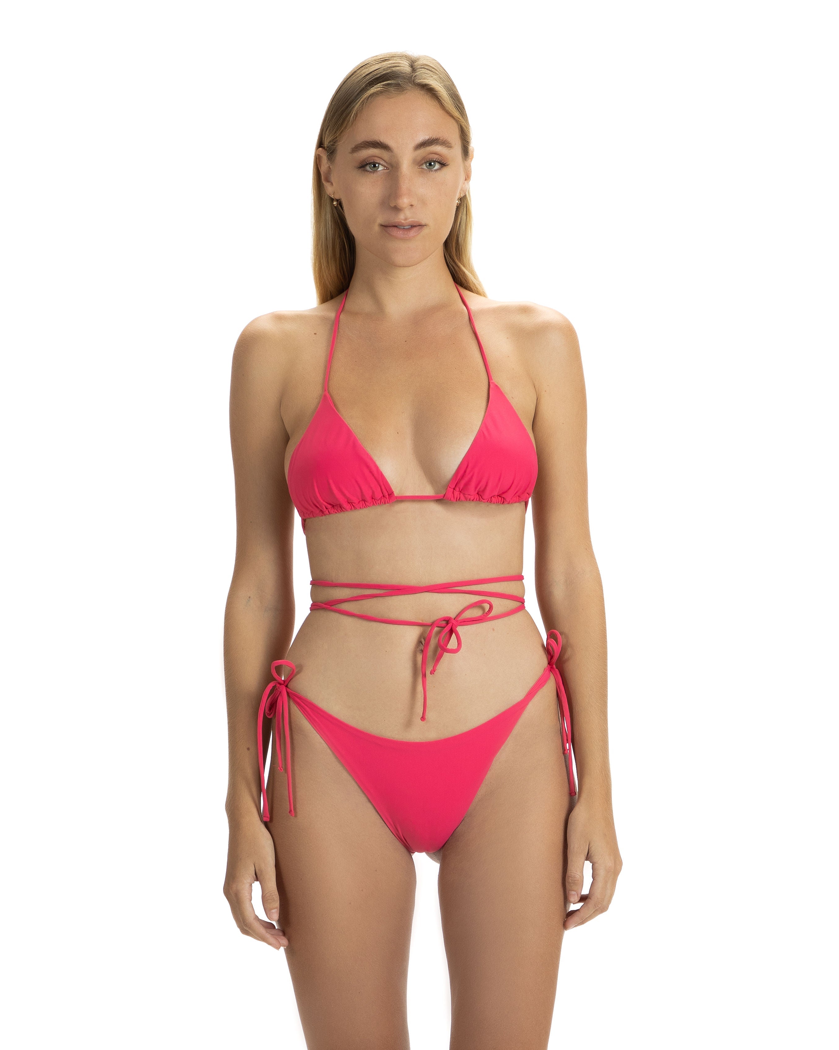 Nuestra exclusiva braguita de bikini con tiras. Con lazos laterales para un ajuste perfecto y un aro dorado en la parte posterior para que puedas atar los cordones de tu cintura desde la parte superior.