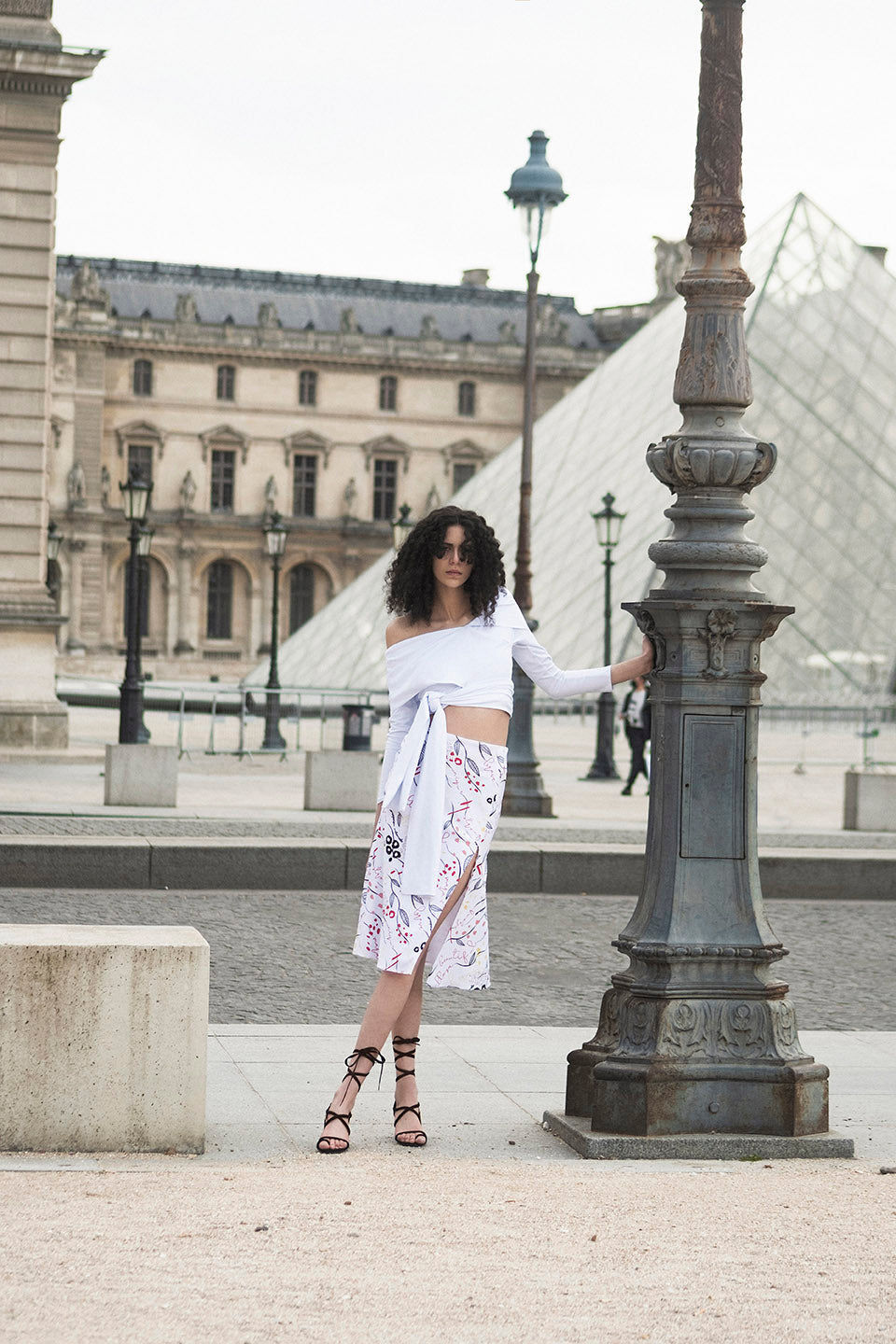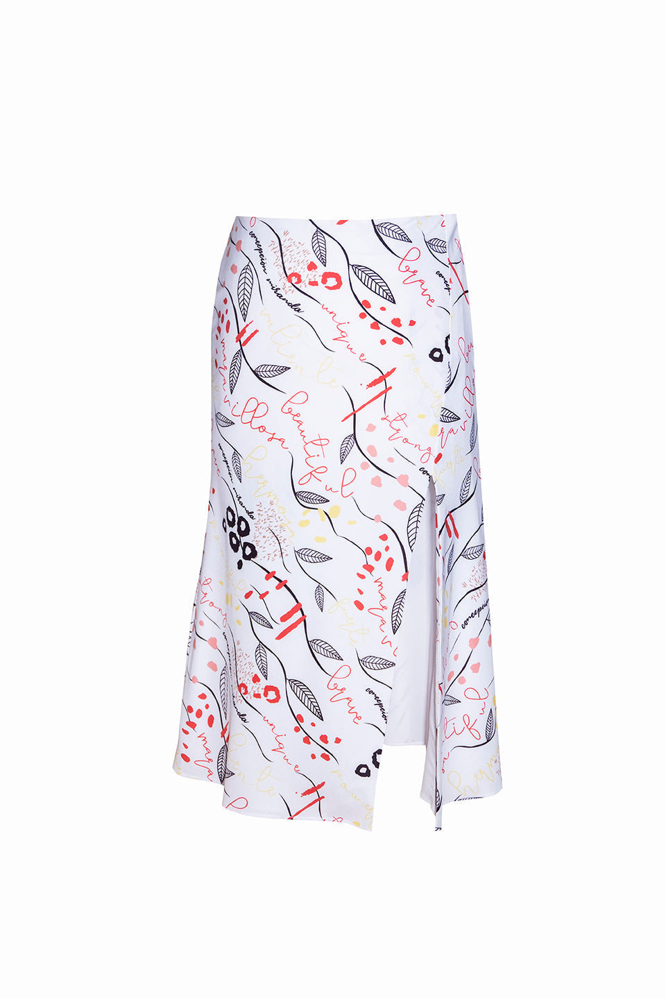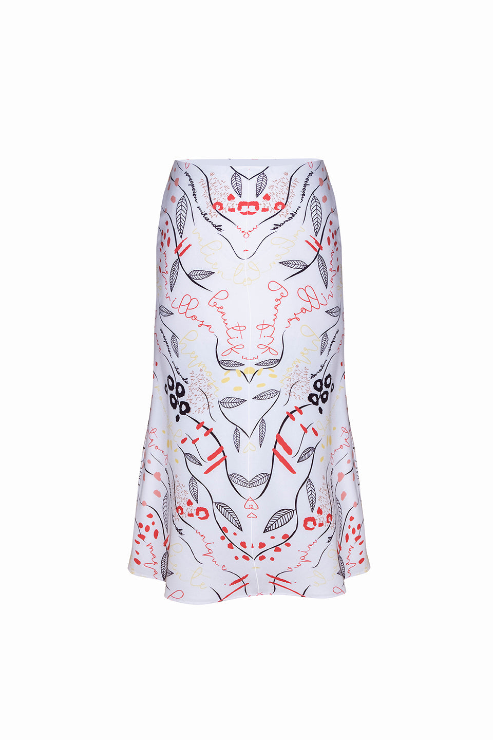 Falda de línea sobre la rodilla con abertura asimétrica al frente, cierre invisible al costado. Impresión exclusiva, inspirada en la magia que representa ser una mujer, la poderosa, maravillosa y hermosa que somos mujeres. Base: Rosella.
