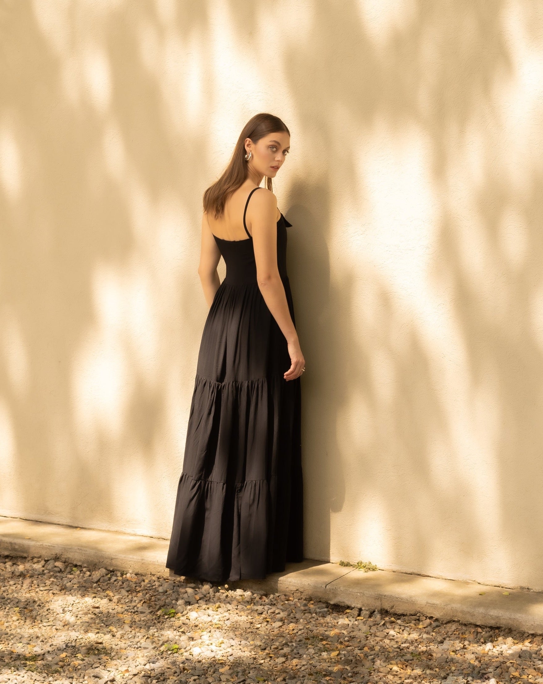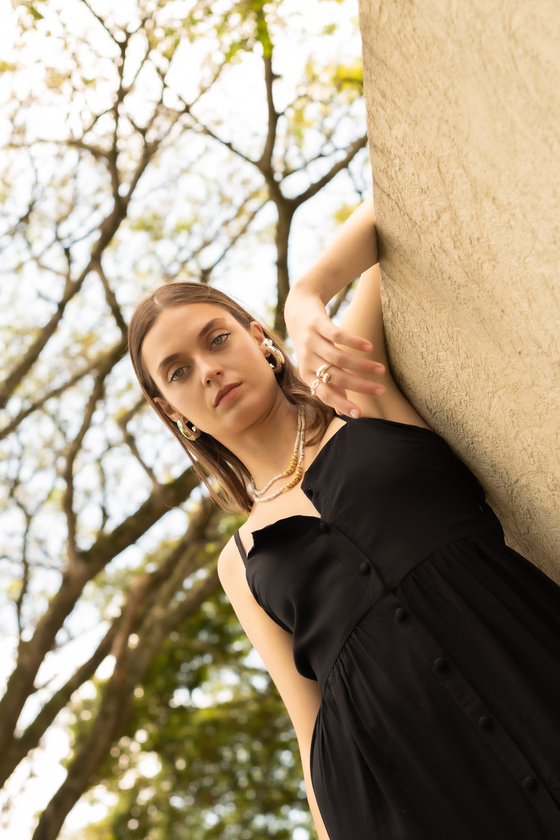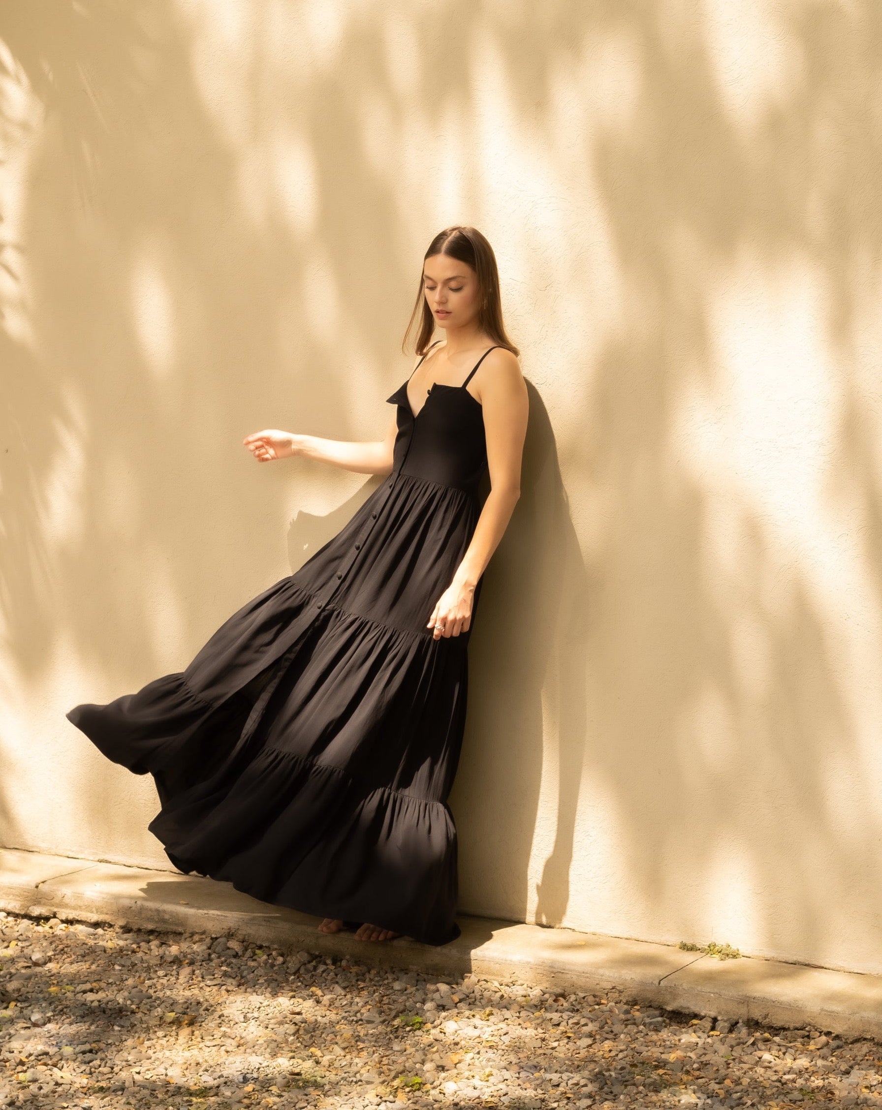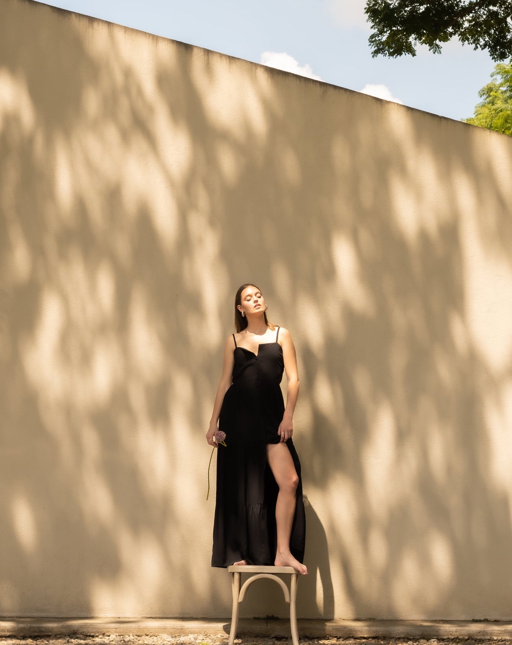El vestido Floriane es un diseño ligero, fresco, versátil y con mucho movimiento. Esta pieza combina el romanticismo con la estética elegante y atemporal de Heloise; cuenta con un cierre de botones forrados en la misma tela que van desde el pecho hasta el nivel de las rodillas, permitiendo crear una delicada abertura entre las piernas que le da mayor fluidez y frescura al diseño.