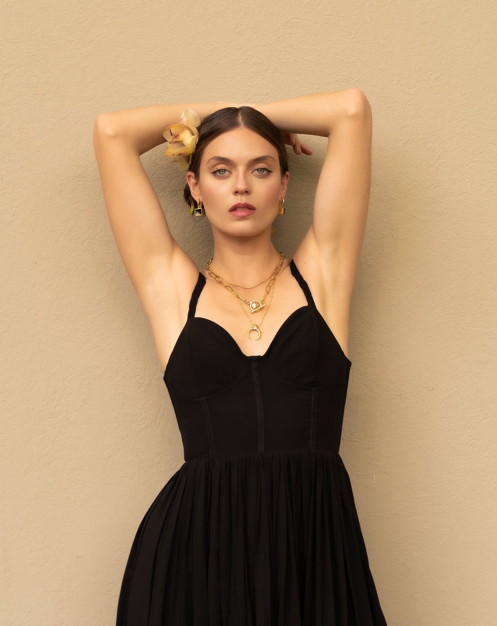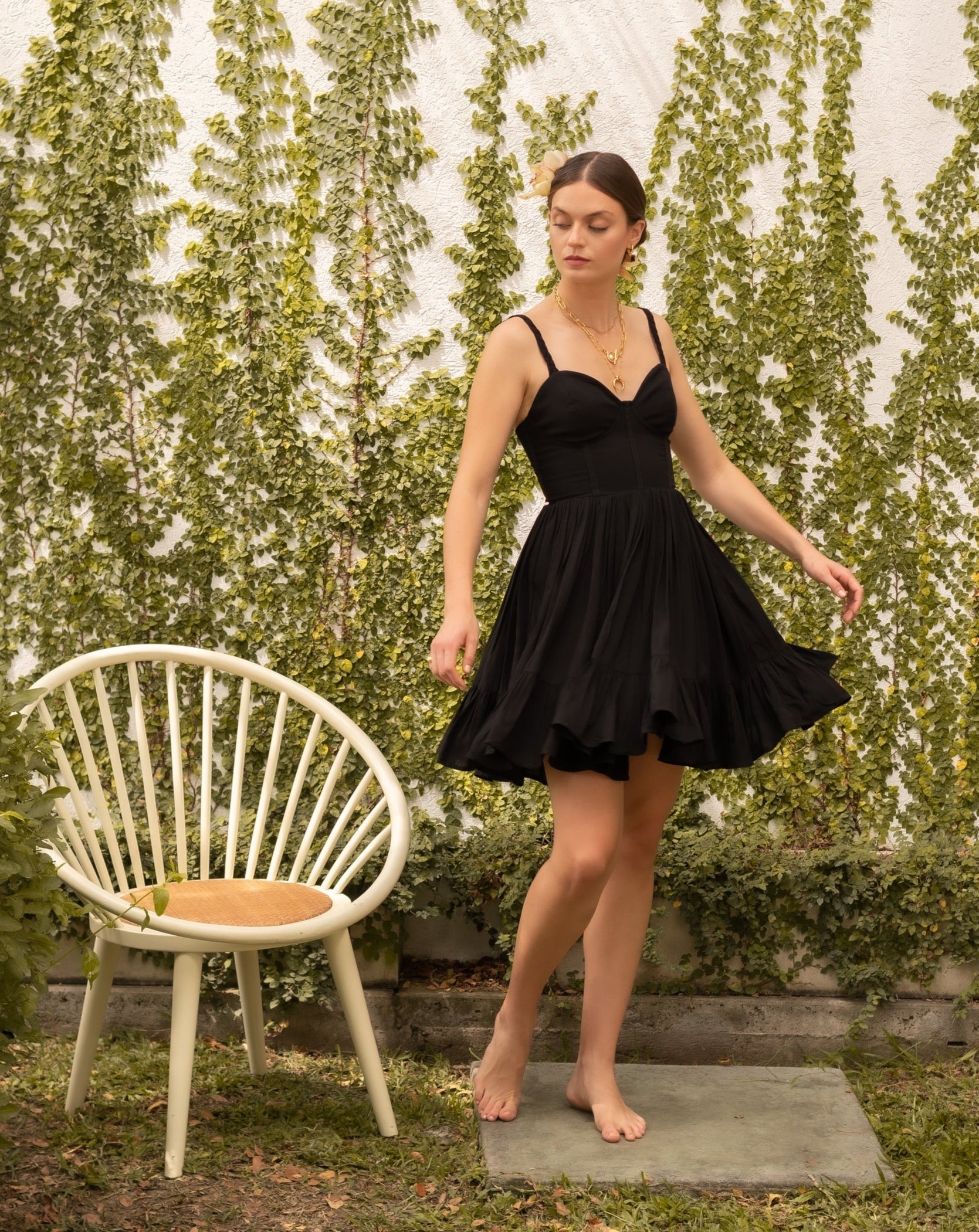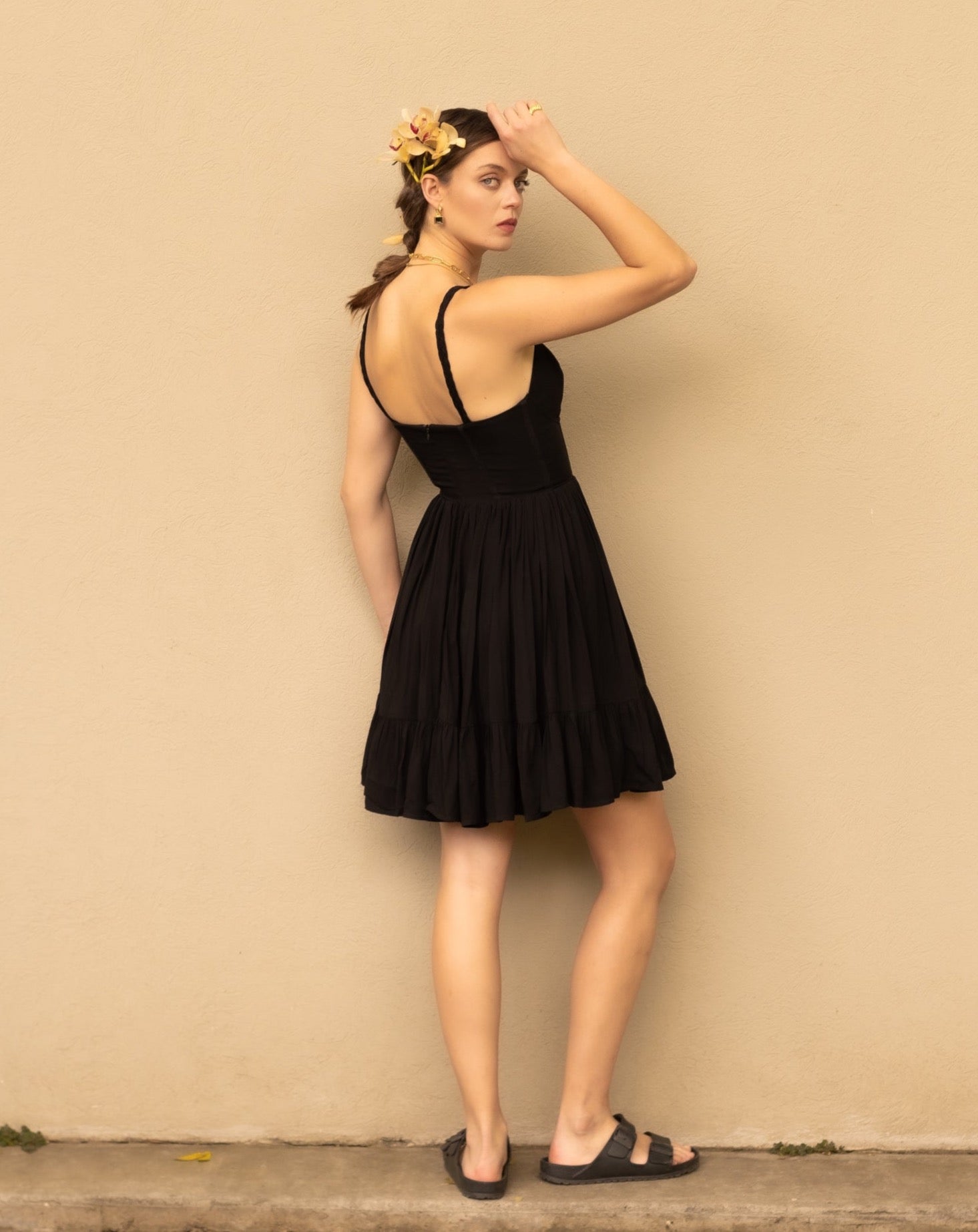 Este vestido mini es definitivamente un esencial de la colección; Frida es un modelo refinado con una silueta corta que realza de manera pronunciada la cintura; se ha elaborado en una viscosa ecologica fluida y ligera. Su corte tipo bustier hace de esta pieza, una prenda hiper femenina con un toque delicado y sensual. Sus tiras trenzadas le otorgan un toque de refinamiento y sutileza a la prenda.