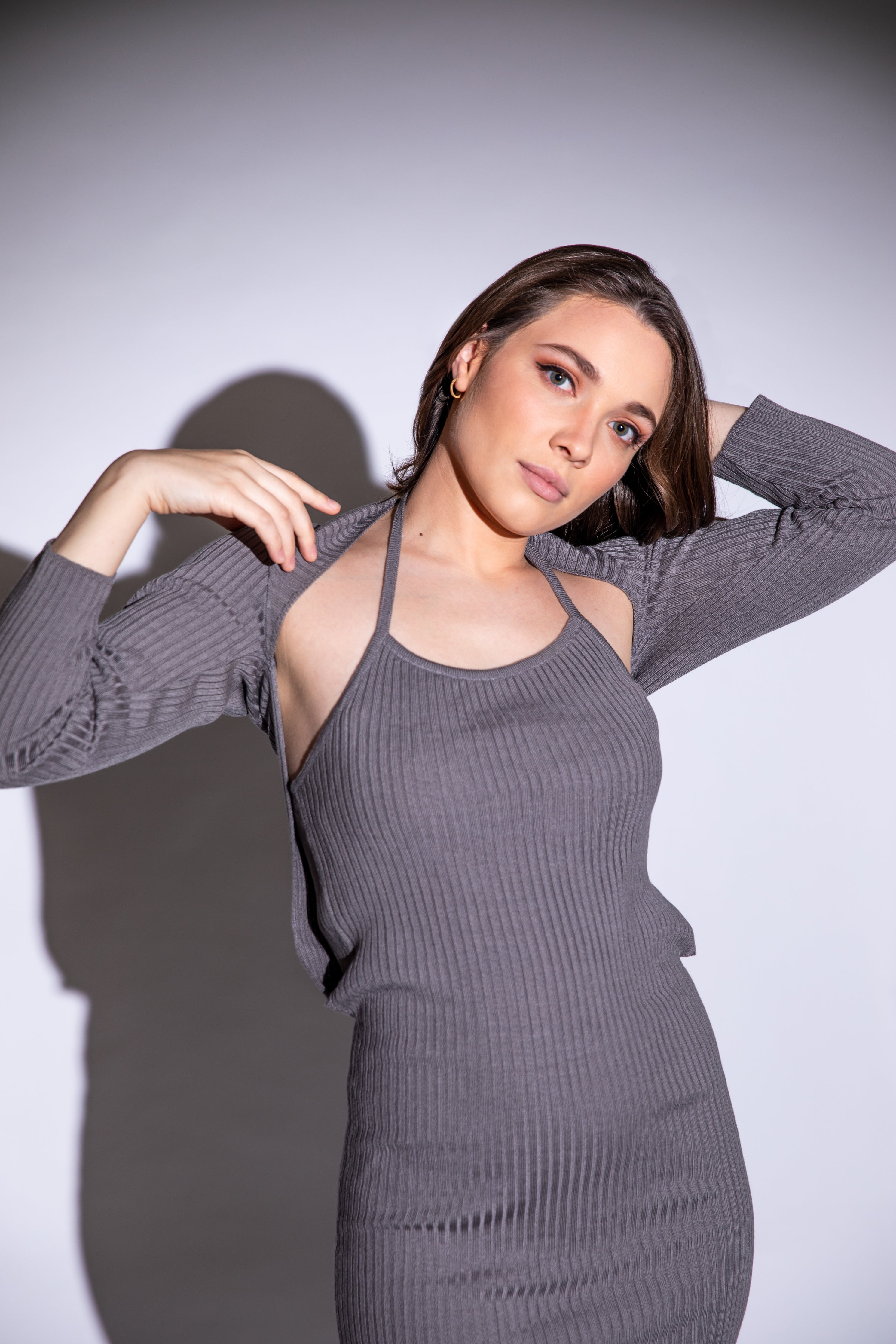 refinado y elegante, este vestido manchado gris de alta calidad es una pieza única compuesta de una camiseta sin mangas y suéter que se mezcla en la parte posterior. Tiene una longitud halagadora sobre los tobillos, y su tejido enfatiza la figura femenina, creando un aspecto elegante y sofisticado.