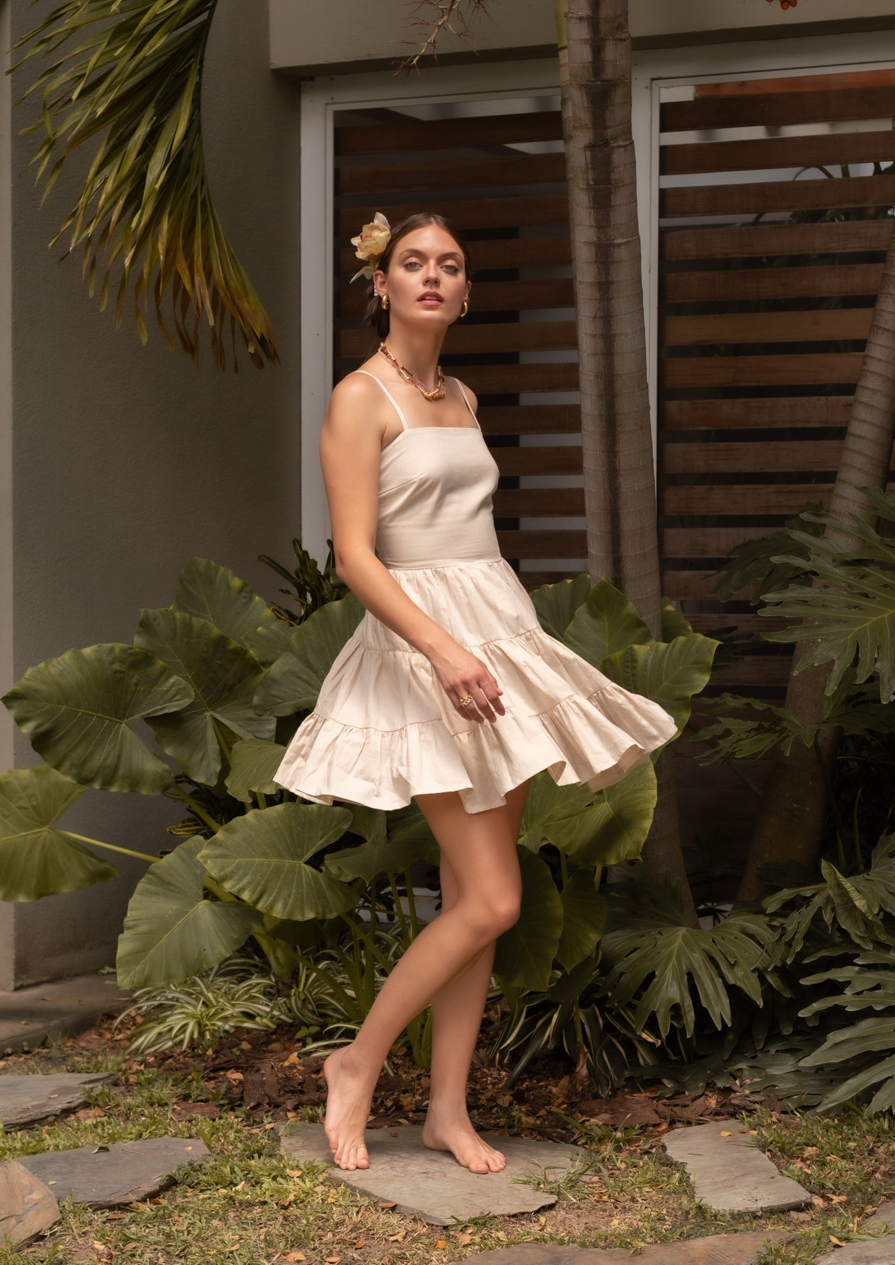 Este vestido mini hecho con lino orgánico, combina perfectamente lo que es un diseño ligero y casual con una silueta acampanada que realza la cintura con elegancia. Sin duda, es el vestido perfecto para un look descomplicado.