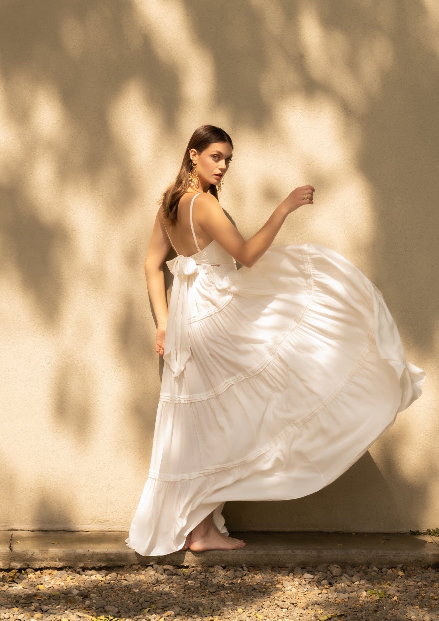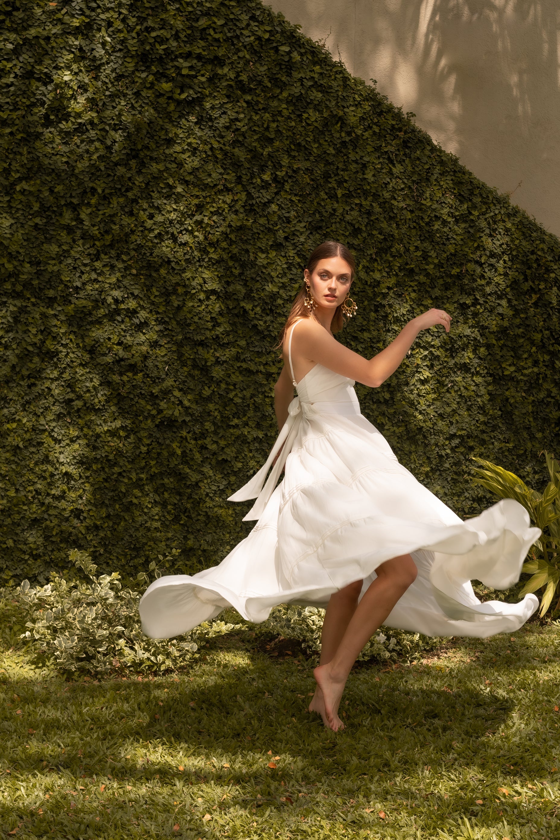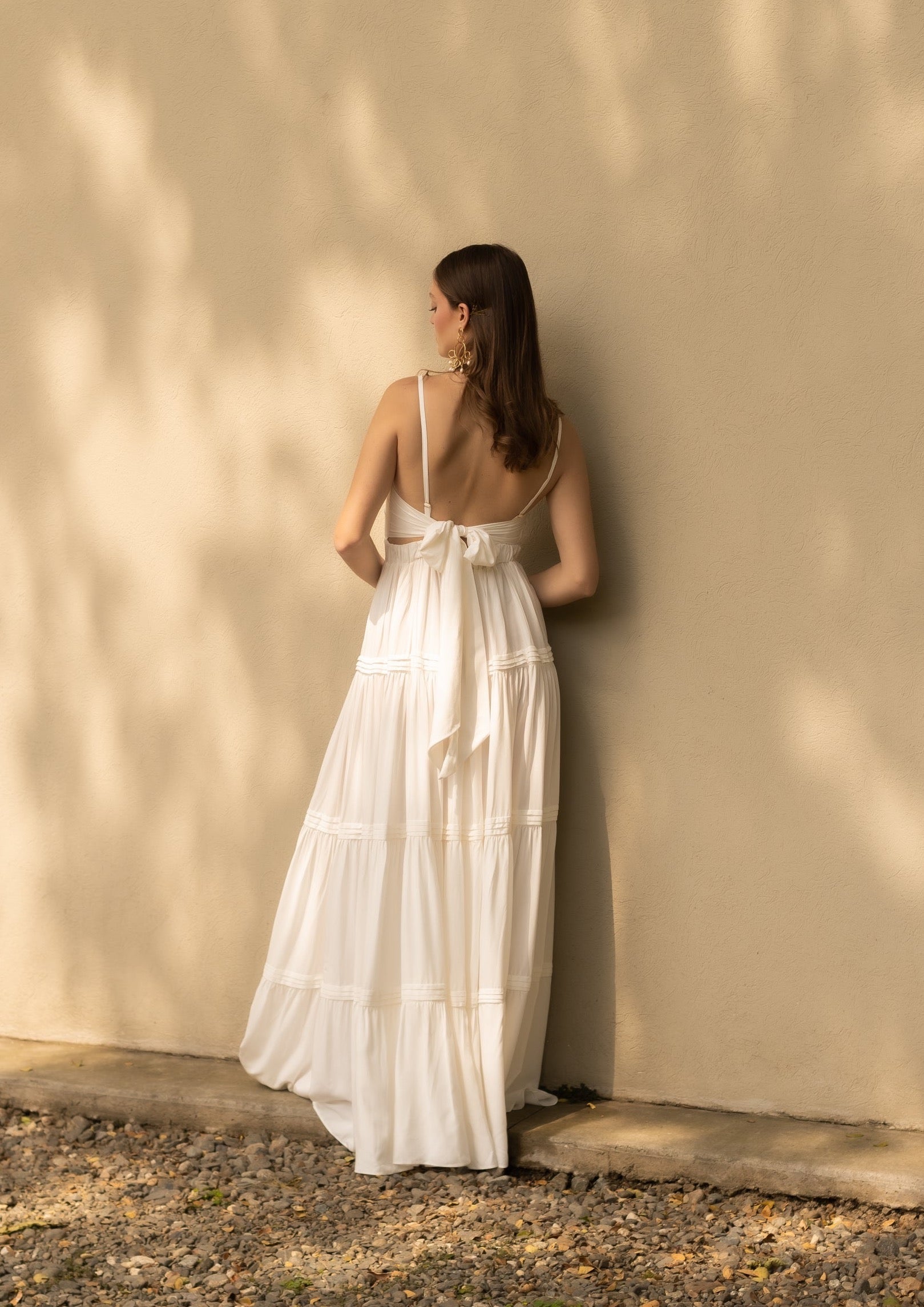 Este vestido está diseñado para aquellas mujeres elegantes, delicadas y clásicas que buscan siempre sentirse frescas y cómodas sin dejar a un lado su estilo. Marie Curie, es un diseño largo y con mucho movimiento que realza la cintura y le da delicadeza a la espalda con un moño sutil y ajustable.